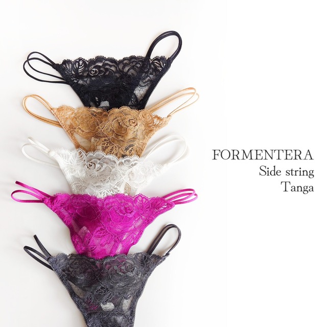 【FORMENTERA】フォルメンテーラ - ベーシックシリーズ・お揃いのサイドストリング総レースタンガ(Tバック)〖 ブラはFOR-0911 〗 カラーはBlack / White / Mocca / Rosa / Fumo / Mallow Red / Classic Rose 全てソリッドカラー(単色) 緻密に編まれた極上レースが肌に映える、大変美しい総レースタンガです。 レースの美しさと2連のサイドストリングのみ、という削ぎ落されたミニマルデザインだからこそ際立つ高級感。 選び抜かれた素材とカッティングからして素晴らしいので、女性が身に着けることで立体になった時に完成するシルエットも非常に洗練されています。 ベーシックシリーズで使用されているのは光沢のある糸やふっくらウーリーな糸を組み合わせたコードレース。レリーフのような陰影がソリッドカラー(単色)のなかに濃淡を生み出していて、何色でも集めたくなってしまいます。 ブラはイタリアの工房で、ショーツは安心安全の日本製という、良いとこ取りのハイブリッドです。 サイズはワンサイズ:ヒップ87cm~95cm ◆お客様の閲覧環境により、色味が実物とは異なって見える場合がございます。あらかじめご了承ください。 ◆レース部分の裏地無し ◆クロッチ有り・コットン仕様 ◆ナイロン85%/ポリウレタン15% ◆日本製 ◆お洗濯は蛍光剤を含まない中性洗剤をご使用の上、陰干しをおすすめしております。 ※乾燥機、漂白、ドライクリーニングはお控えください。 【FORMENTERA】-フォルメンテーラ- 1985年 日本人女性によって設立されたイタリア製ブランド。 シンプルなデザインだからこそ、極上レースの美しさと軽やかなフィッティングが際立ちます。 洗練された着心地の良さをぜひ体感なさってください。 一部のショーツ類やキャミソールなどは日本でも生産されています。 余談……タンガ・ソング・Tバック、それぞれの呼び方について。 昨今ではあまり明確に区別をされているケースは少ないのですが、まずは一番よくお耳にされるであろう《Tバック》、こちらはお尻の生地がT字状に細くなっているボトムの総称として日本で作られた造語です。 《Thong/ソング》は英語。バックスタイルがT字状に細くなっているボトムの呼び方です。デザインについての言及はあまりされていません。 《Tanga/タンガ》はポルトガル語。バックスタイルがT字状というよりはどちらかというと前も後ろもV字になっているボトムで、比較的エレガントで華奢なデザインのものを指します。 本当にまったく呼び分けられてはいないので、最近では英語科ポルトガル語かの違いしかないと思われます。 いろんな呼び方してるけど要するにお尻の生地がT字状に細くなっているんだなあとお考え頂ければよろしいかと存じます。