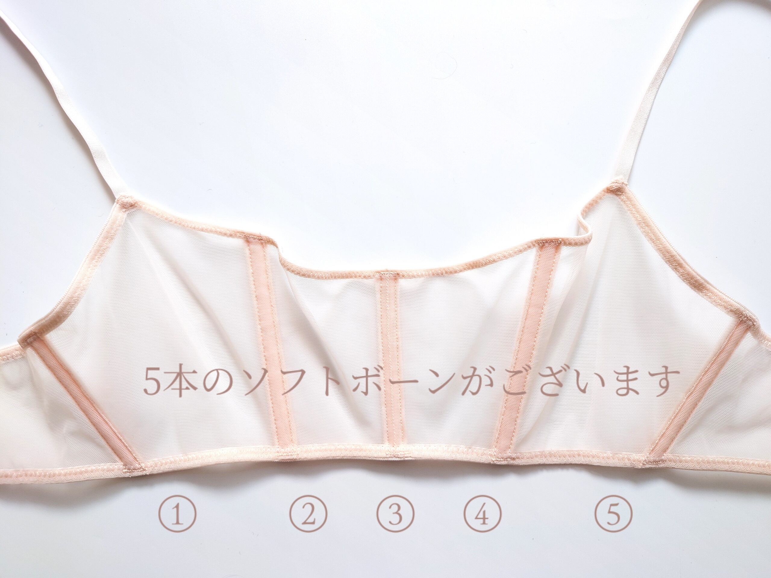 フロントに3本、両サイドに1本づつ、計5本のソフトボーンがコルセット風のデザイン。