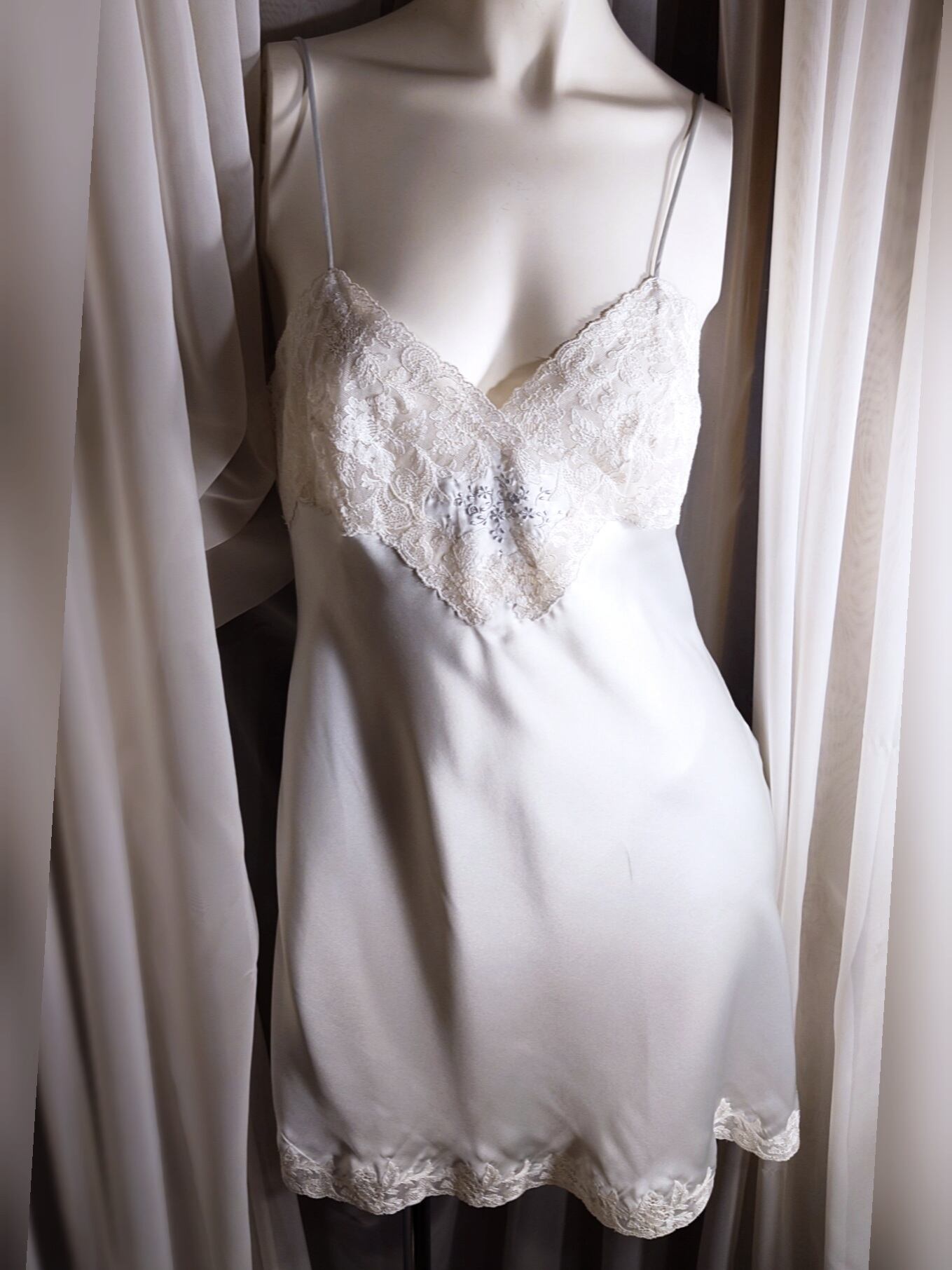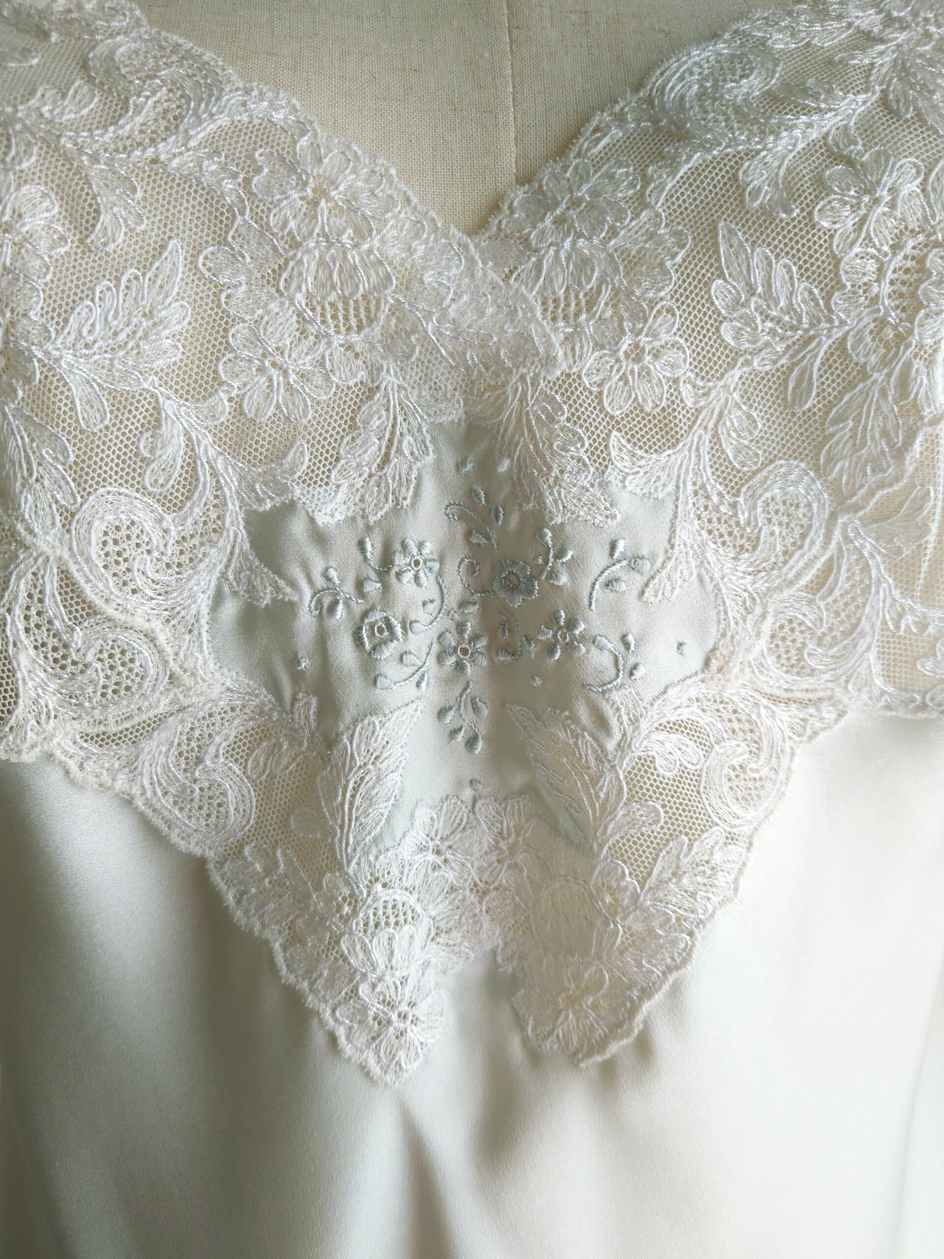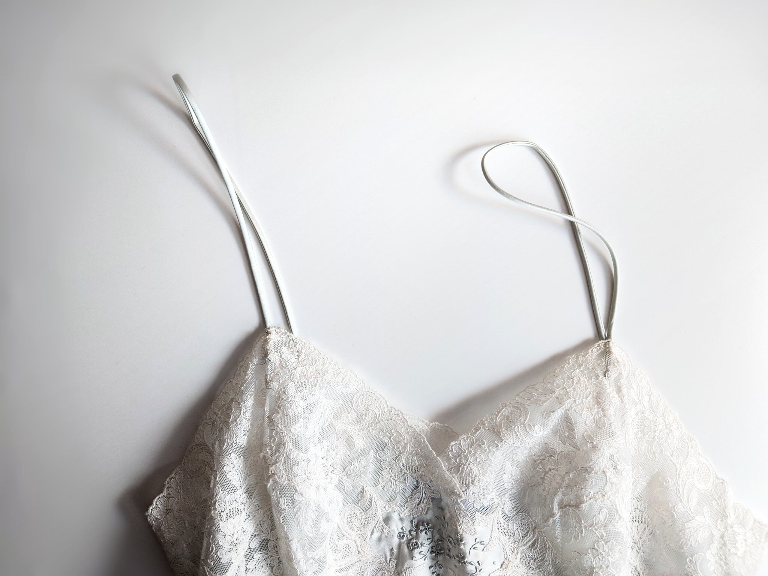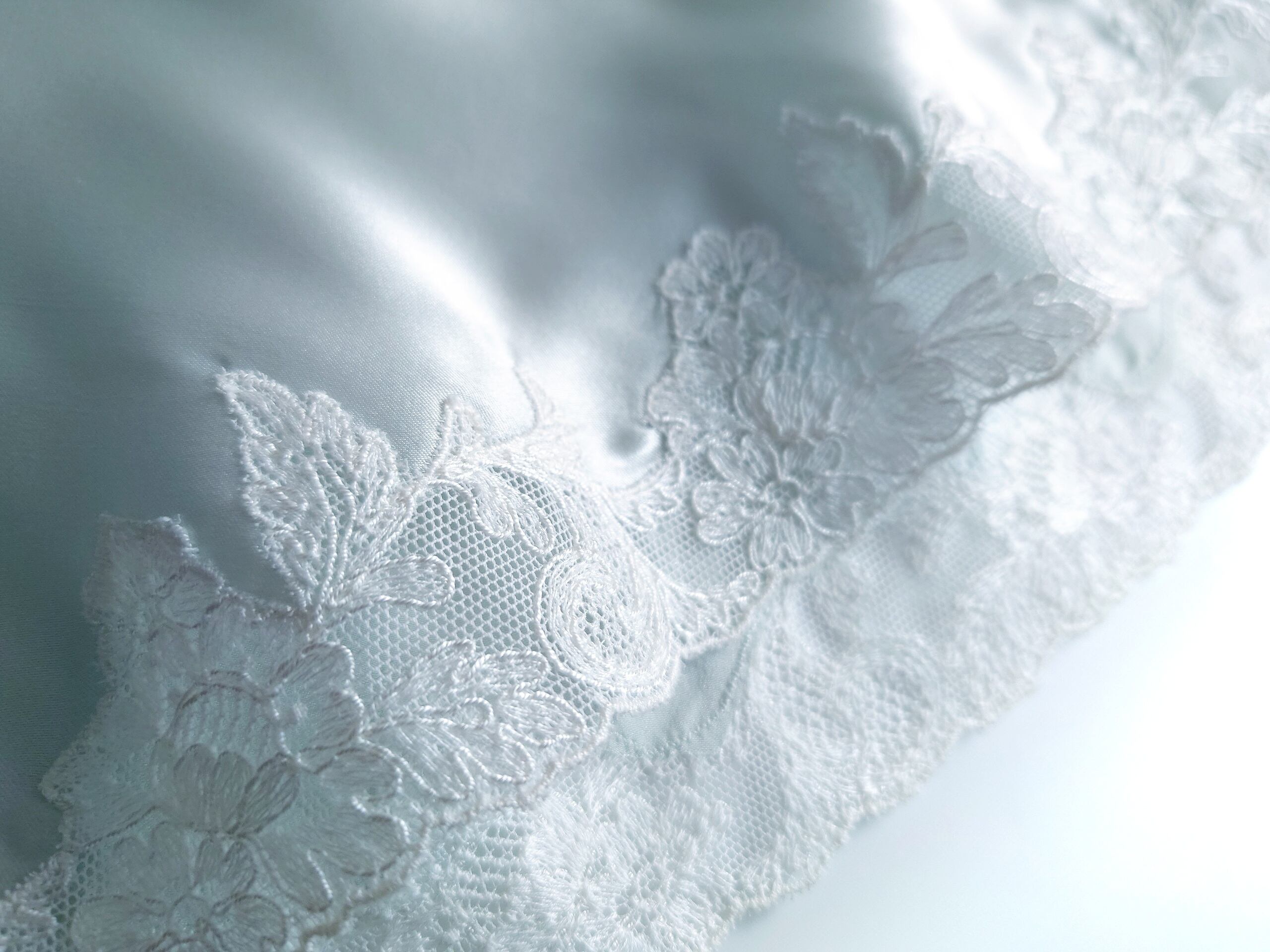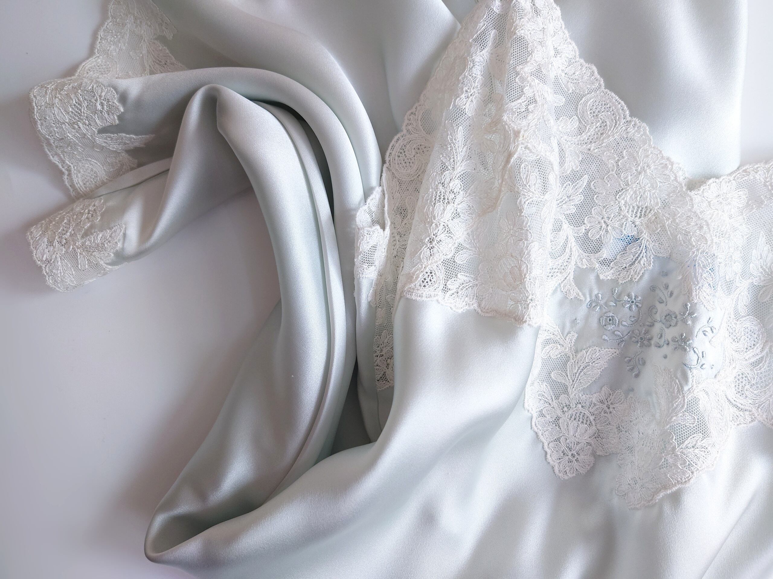 胸元にはフィレンツェの手刺繍をほどこして、スイス・サンガーレンのエンブロイダリーレースやフランス・カレのリバーレースをふんだんにあしらった贅沢なスリップです。