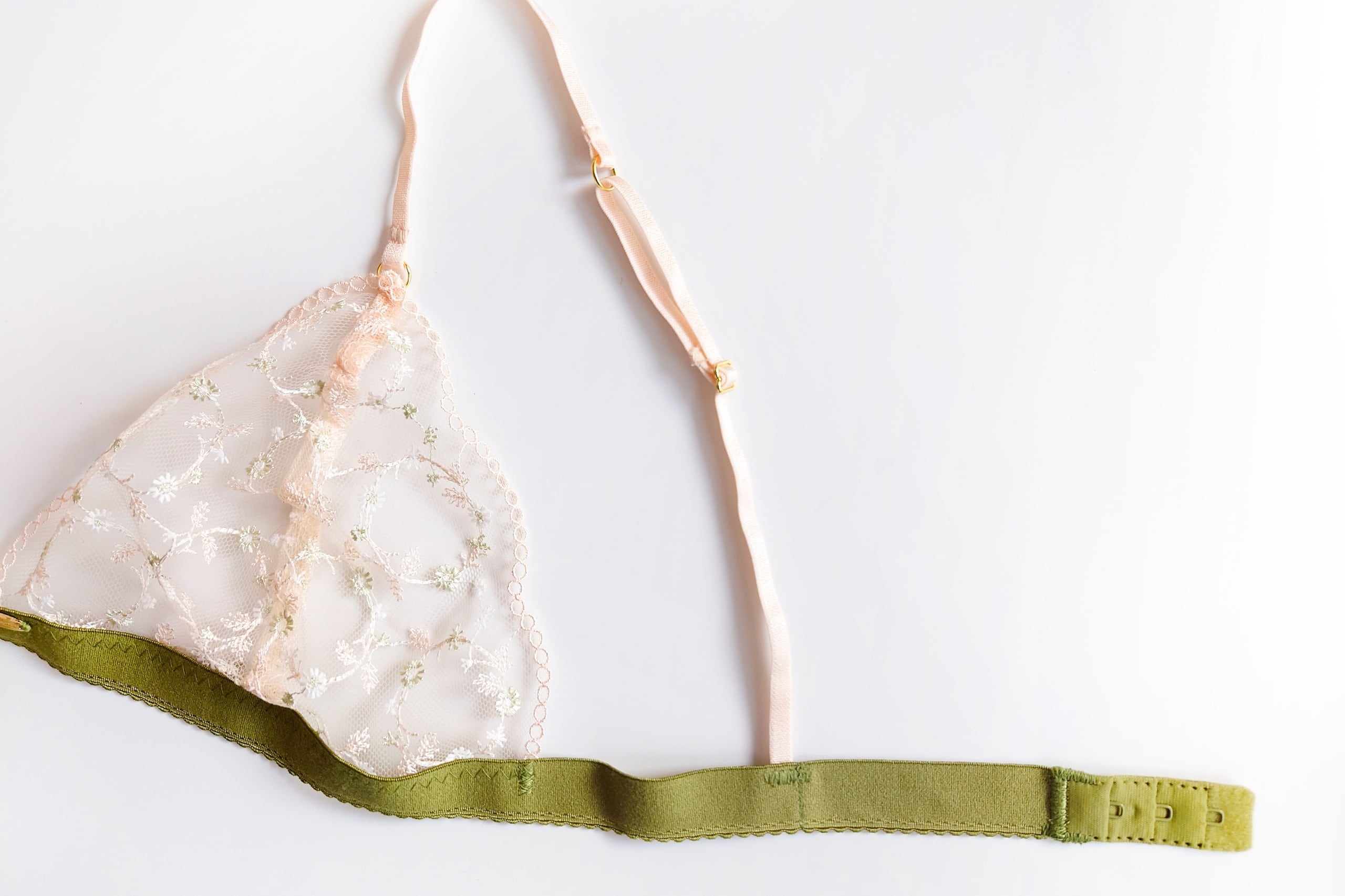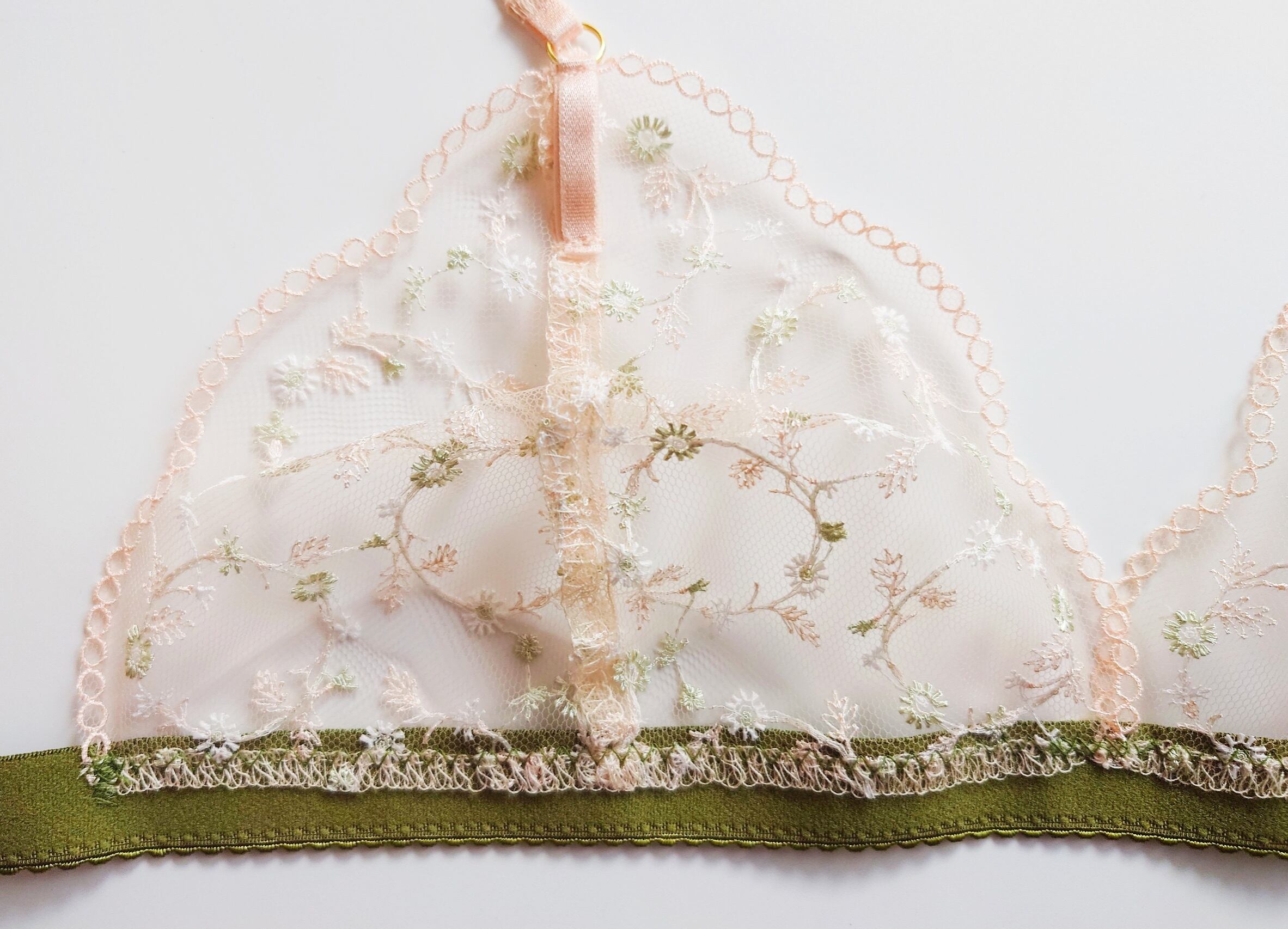 ベビーピンクのチュールに白とグリーンで小さなお花が刺繍された繊細な一枚レースブラレット。