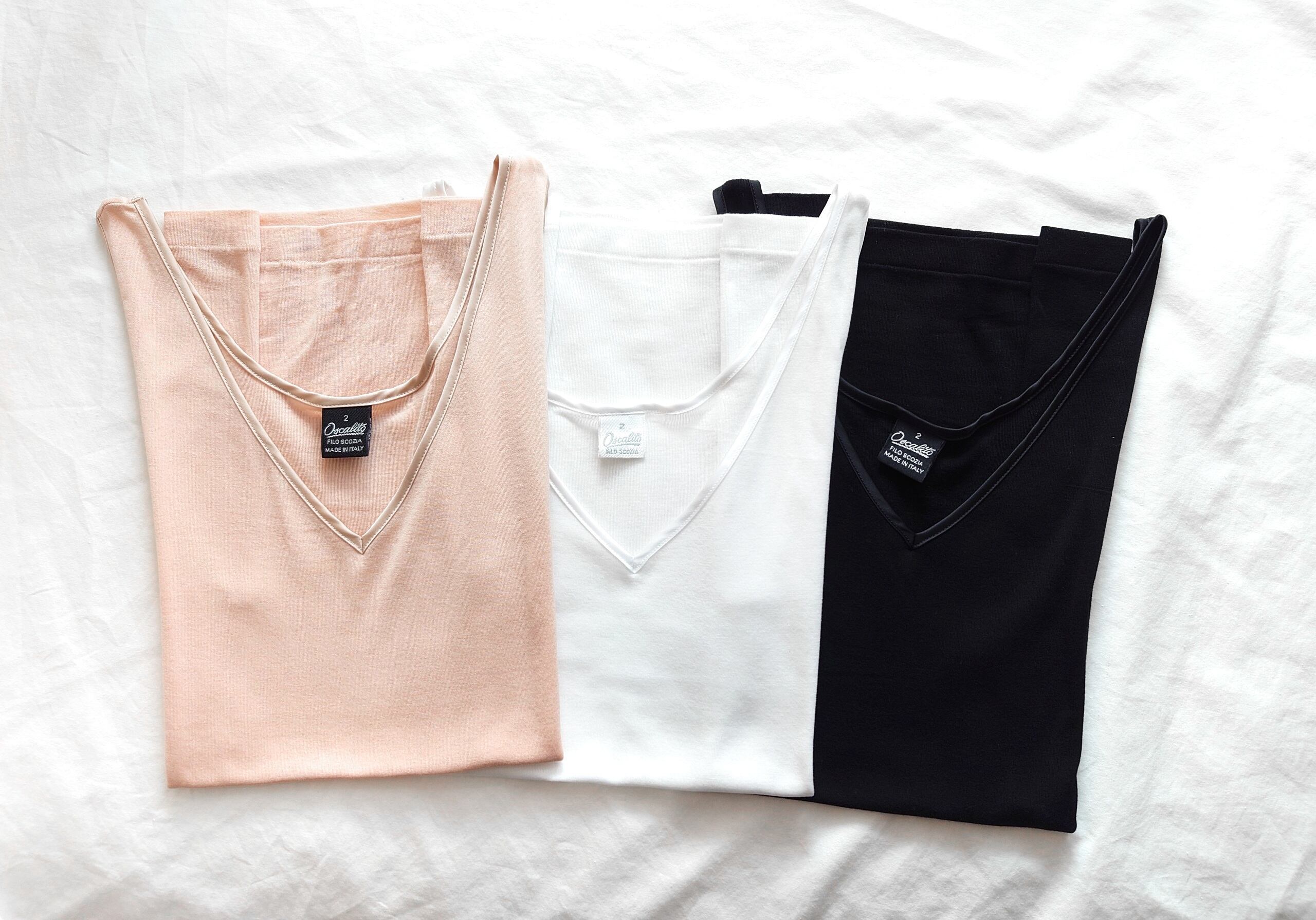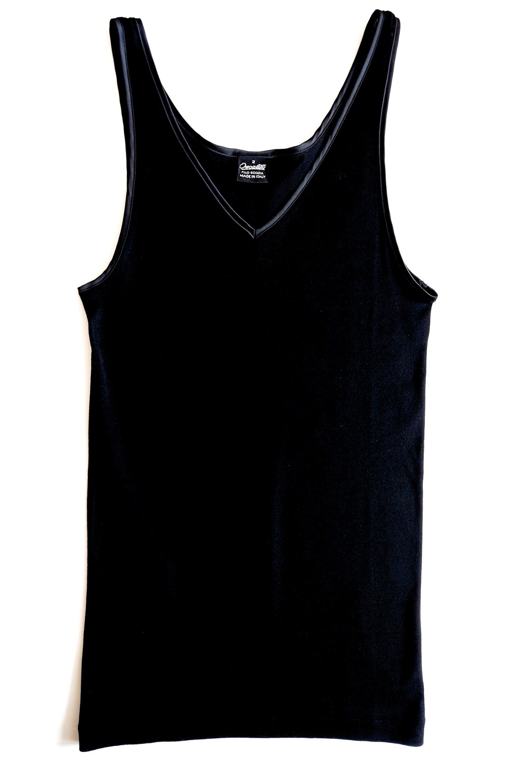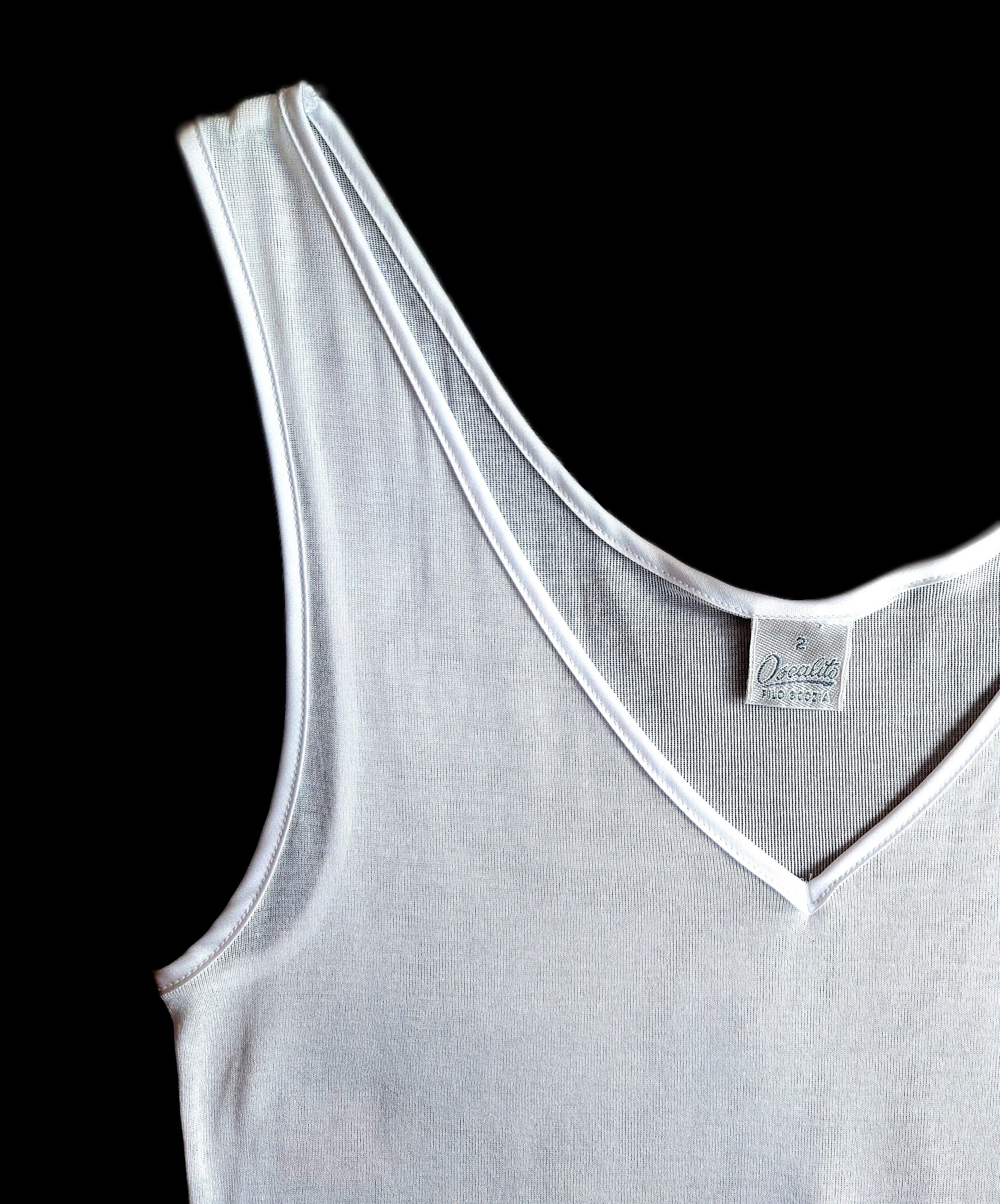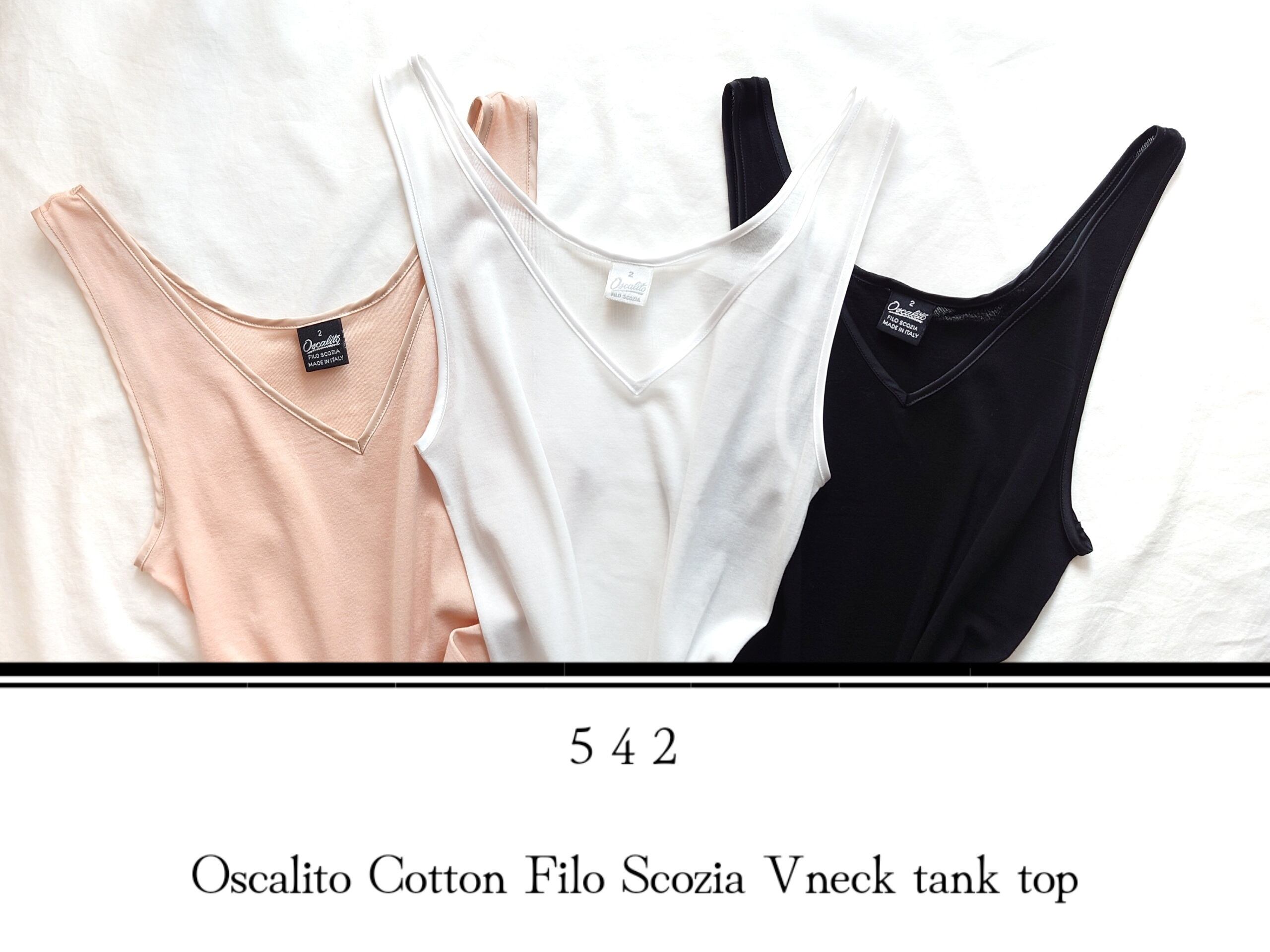 【Oscalito】オスカリートのサテントリムVネックタンクトップです。こちらは身頃にコットンの最高品質ブランドFILO SCOZIA(フィロスコツィア) コットン100%使用。