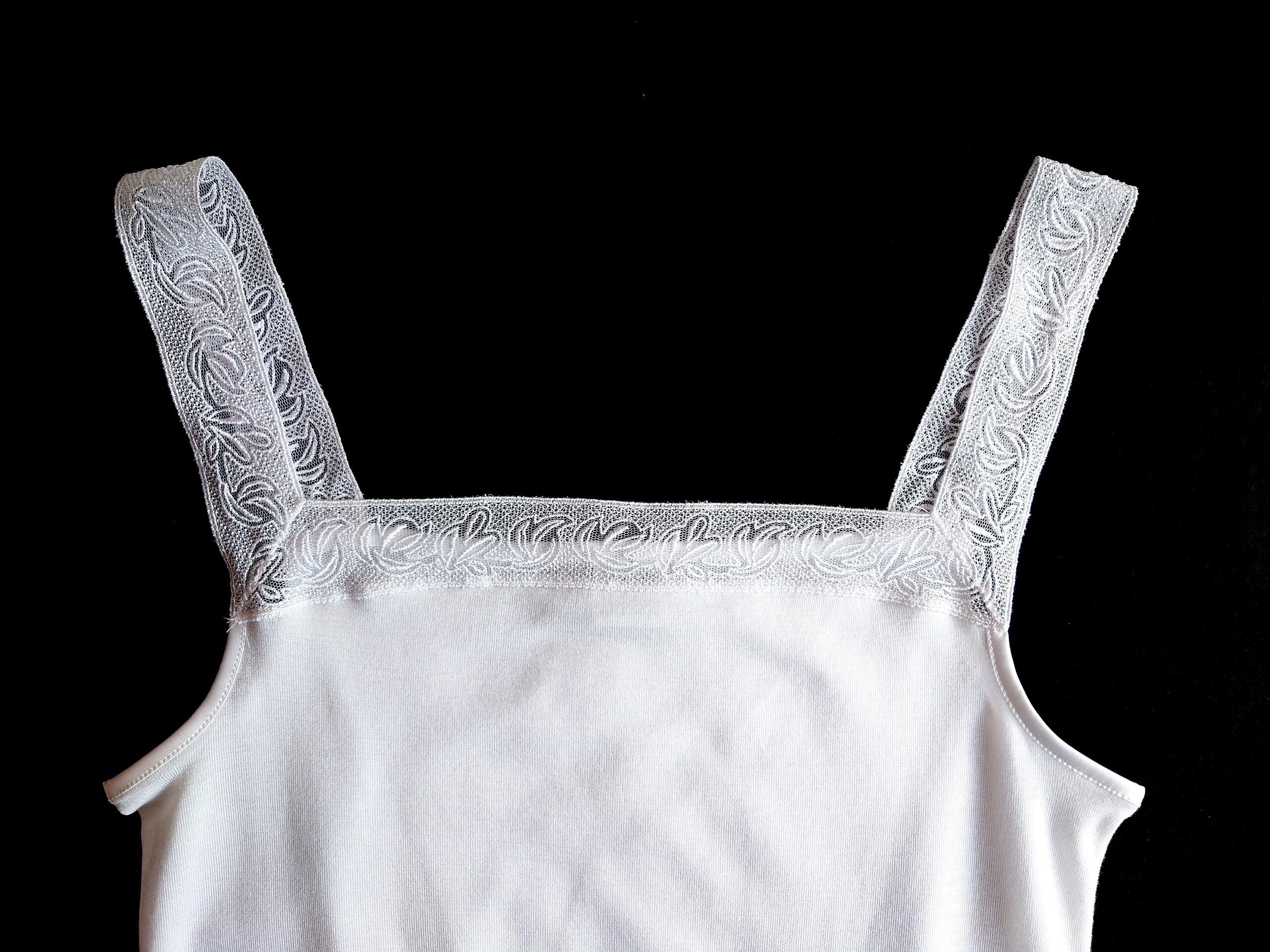 スクエアネックの透かしレースは美しいだけではなく、下着を上手に隠せる実用性の高さも兼ね備えた優秀トップス。