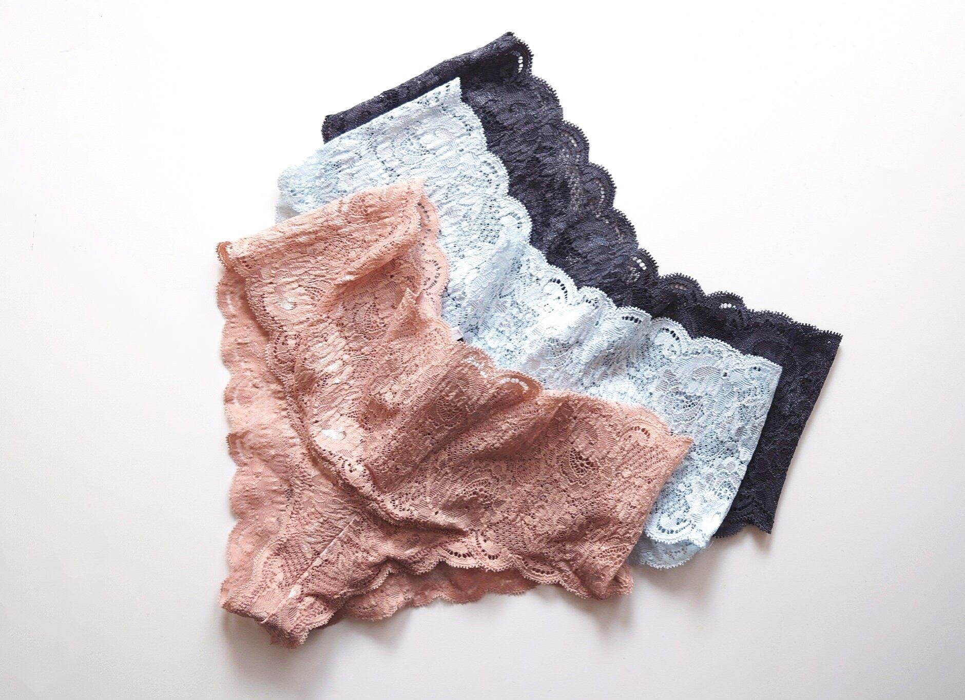 お洋服にラインが響きにくいスカラップトリミングは見た目にも美しく、華やかなフローラル柄レースにはところどころに上品な光沢感があります。