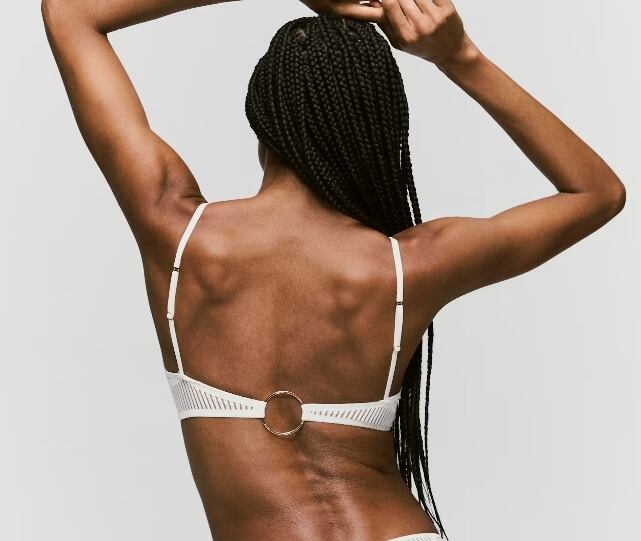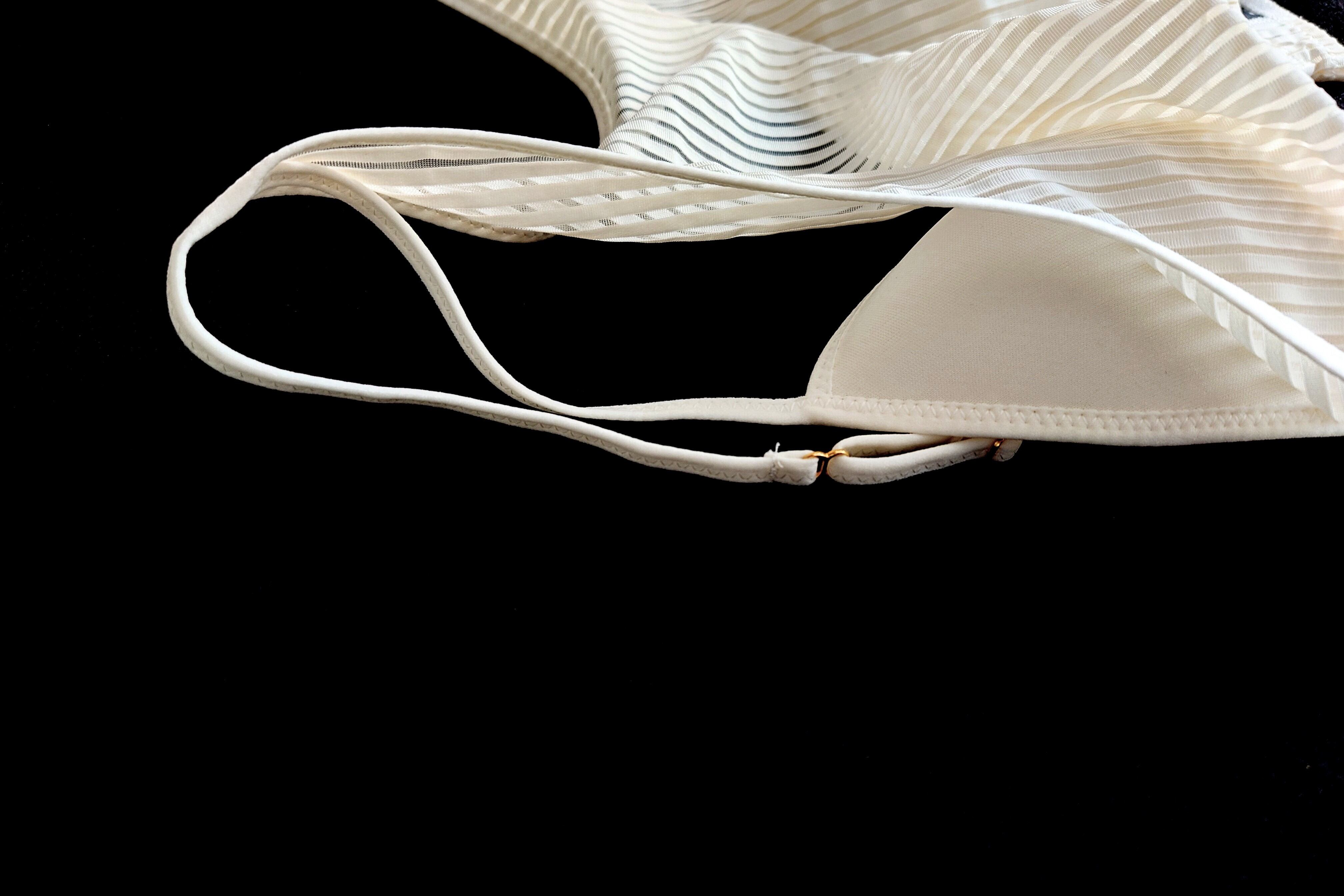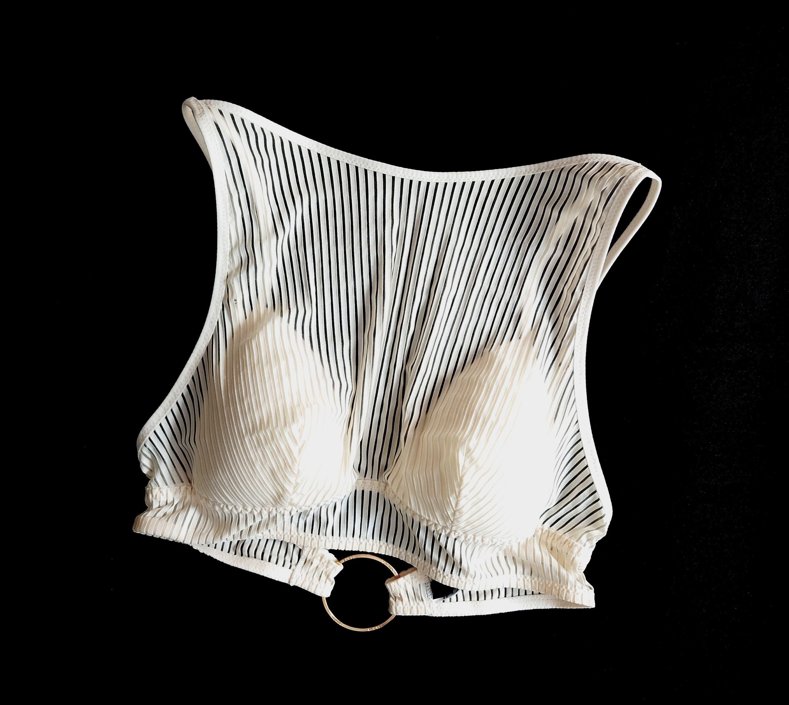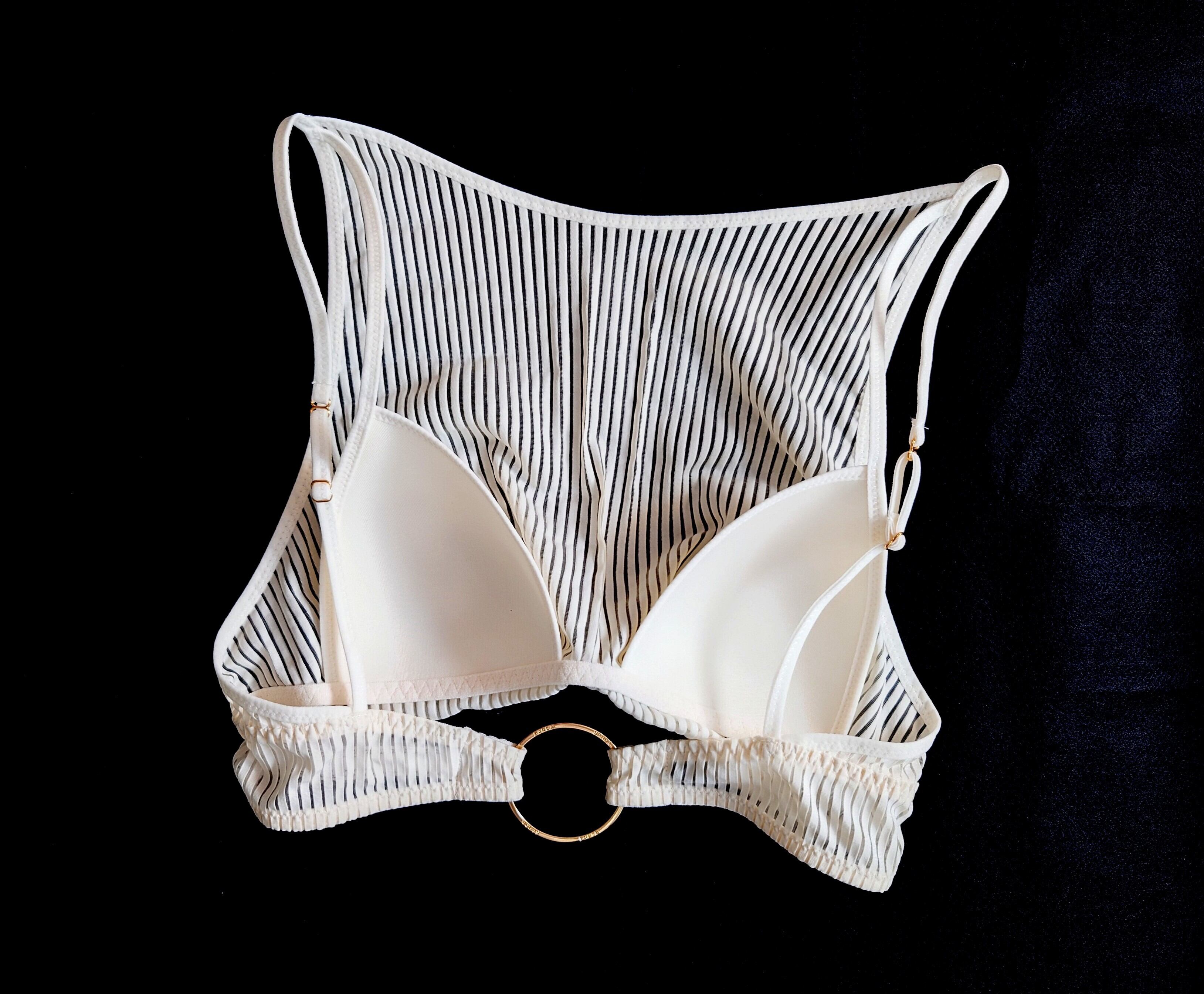 透け感のあるストライプ生地の内側にトライアングルブラが付いた優秀トップス。