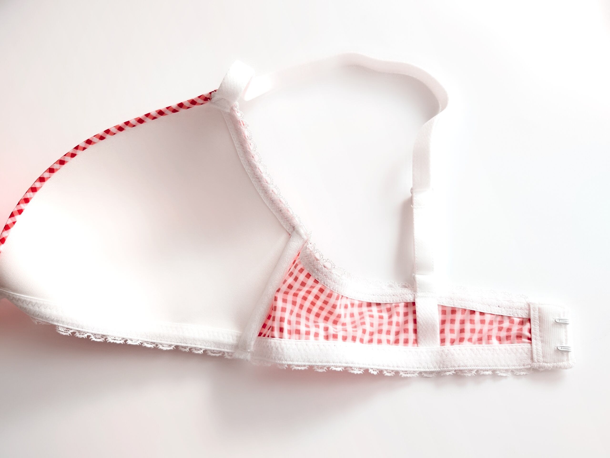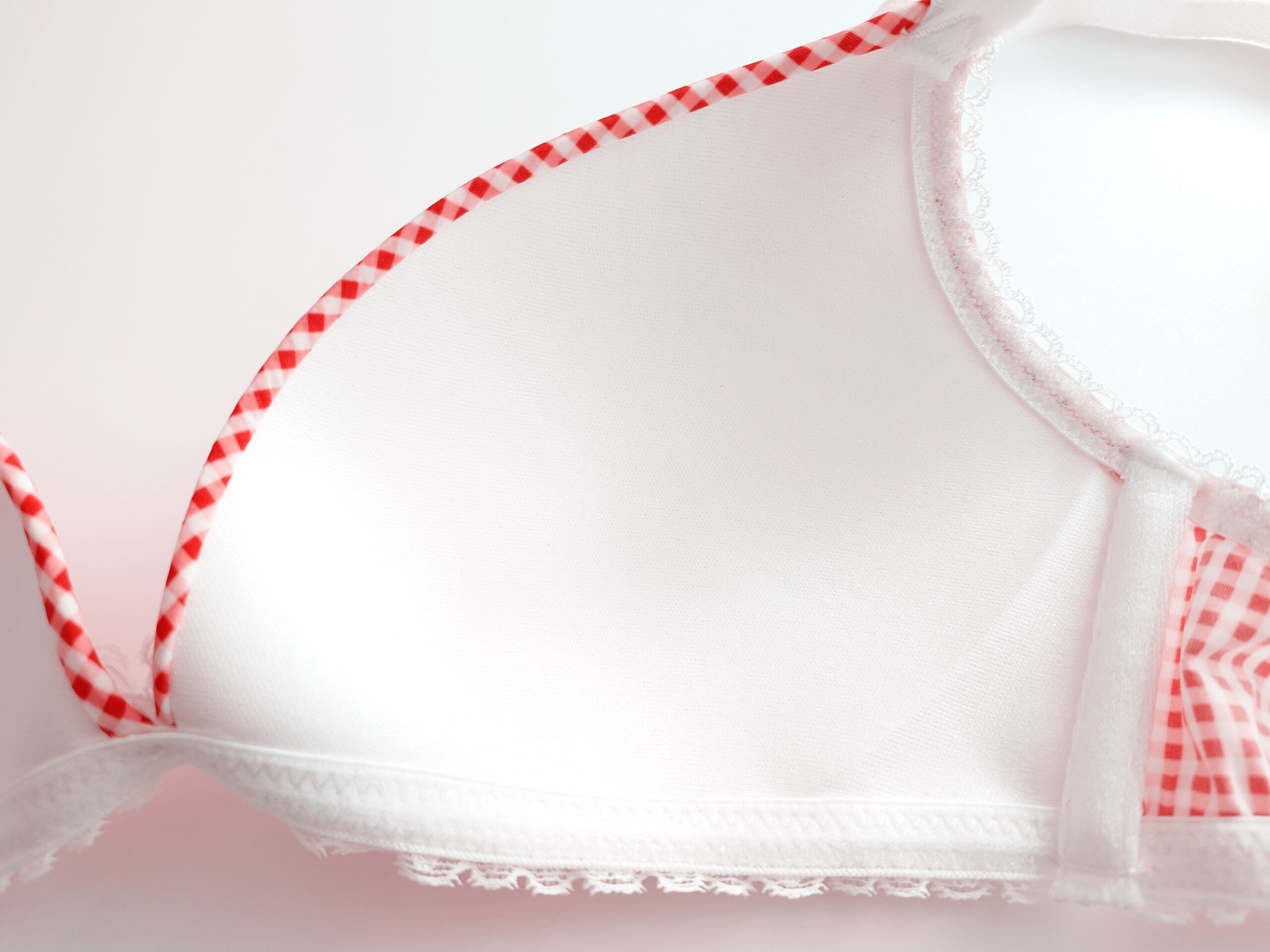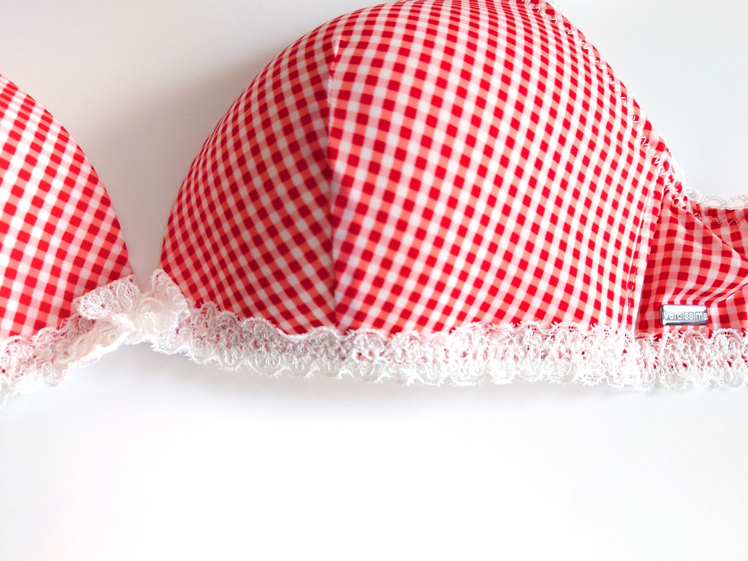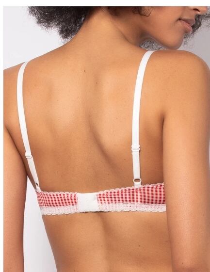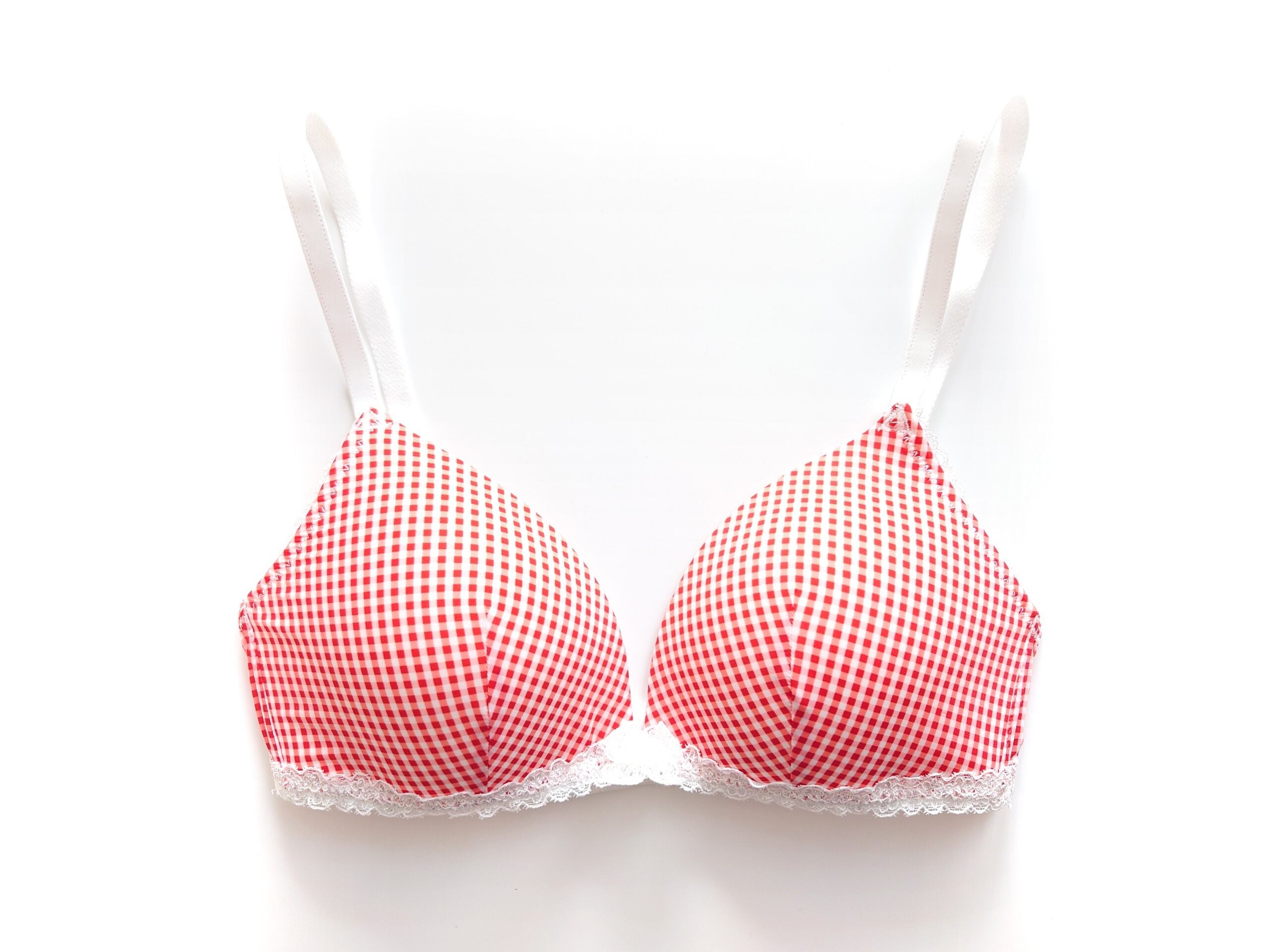 なめらかなマイクロファイバー生地にヴィシーチェック柄をプリントしたカップ付きノンワイヤーブラ。