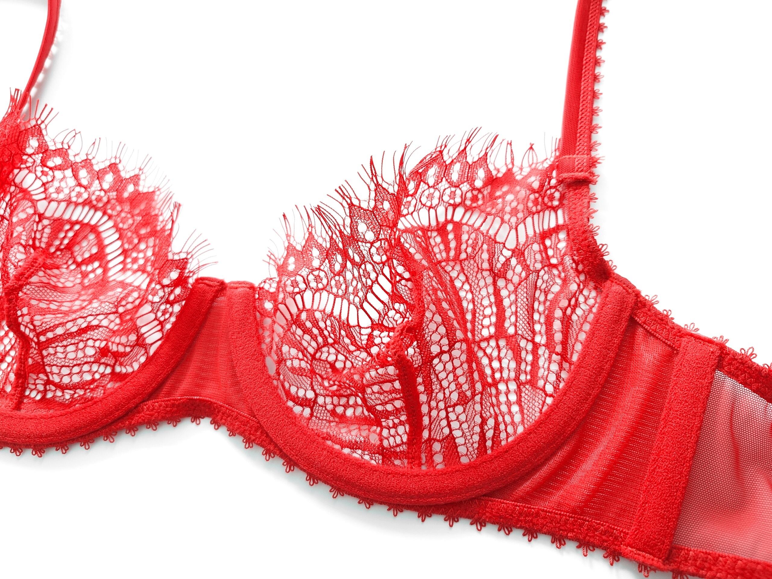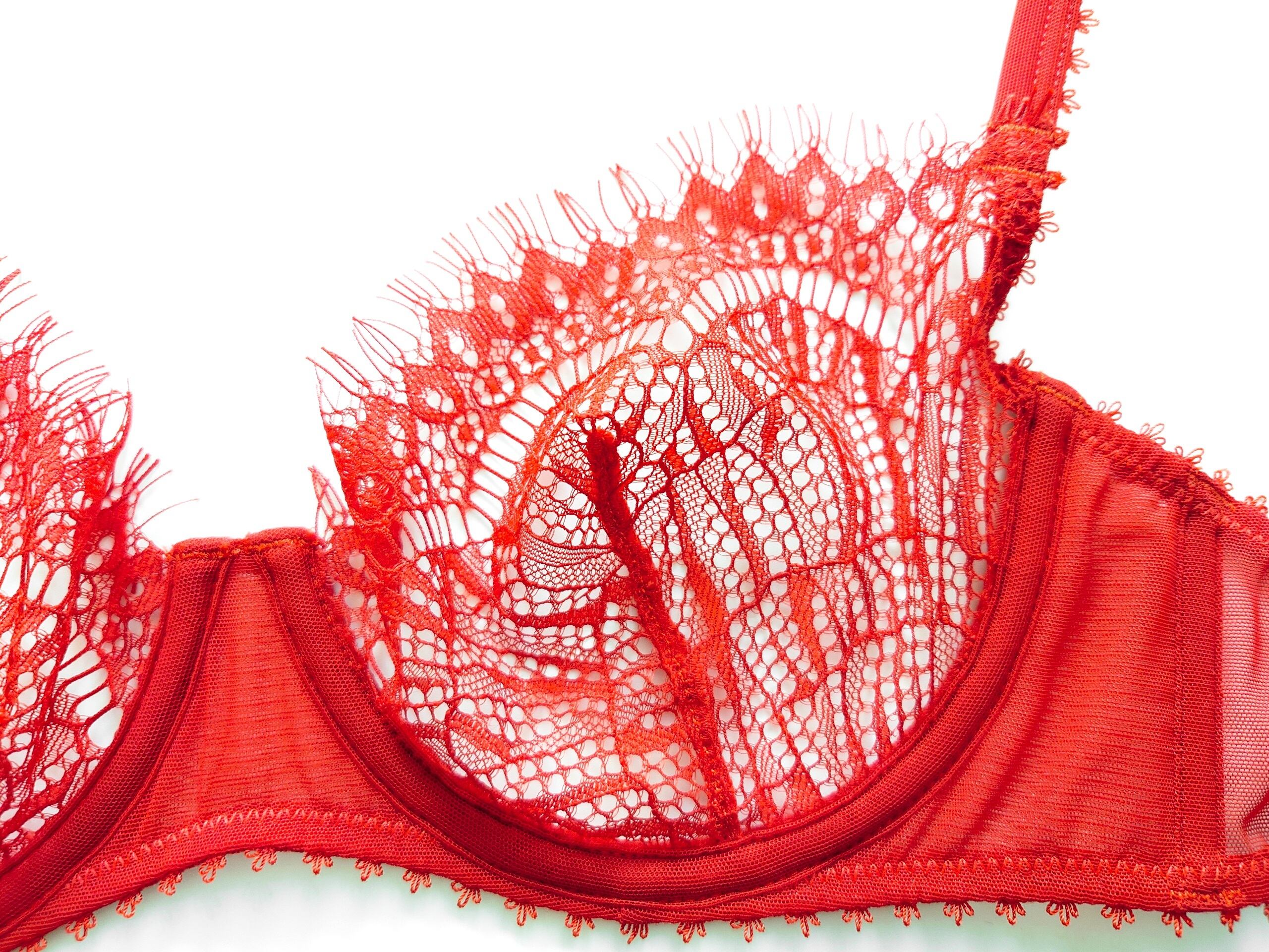 あざやかな真紅のアイラッシュレースとチュールの透け感のコントラスト、ストラップとアンダーベルトをぐるりと囲む愛らしい3連ピコットが『Accroche Cœur - 心を掴んで離さない』デザイン。