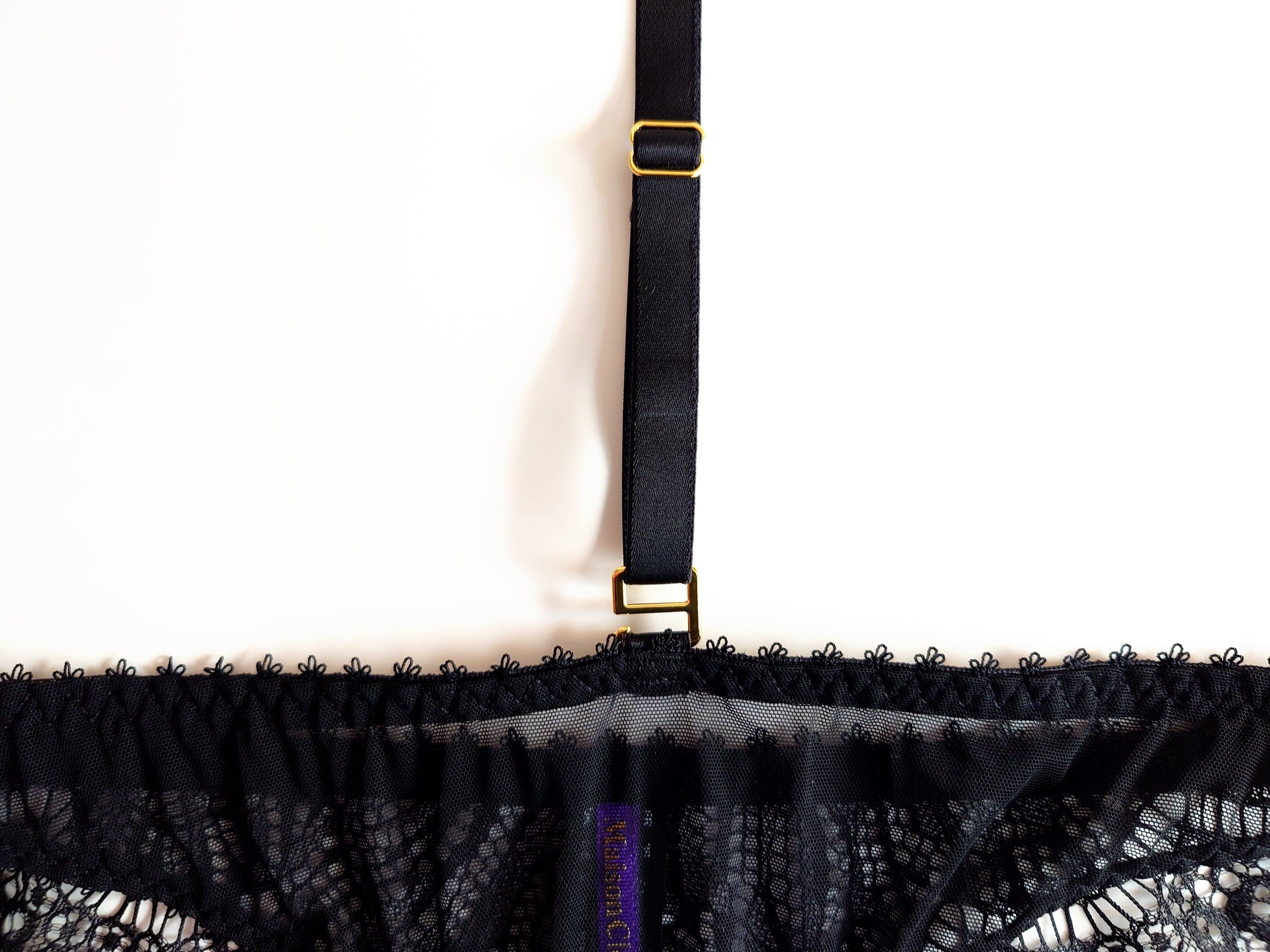 アイラッシュレースとチュールの透け感のコントラスト、ストラップとアンダーベルトをぐるりと囲む愛らしい3連ピコットが『Accroche Cœur - 心を掴んで離さない』デザイン。