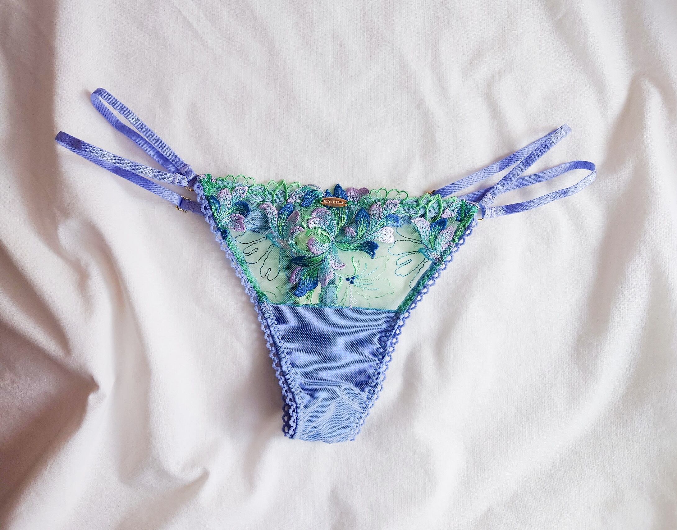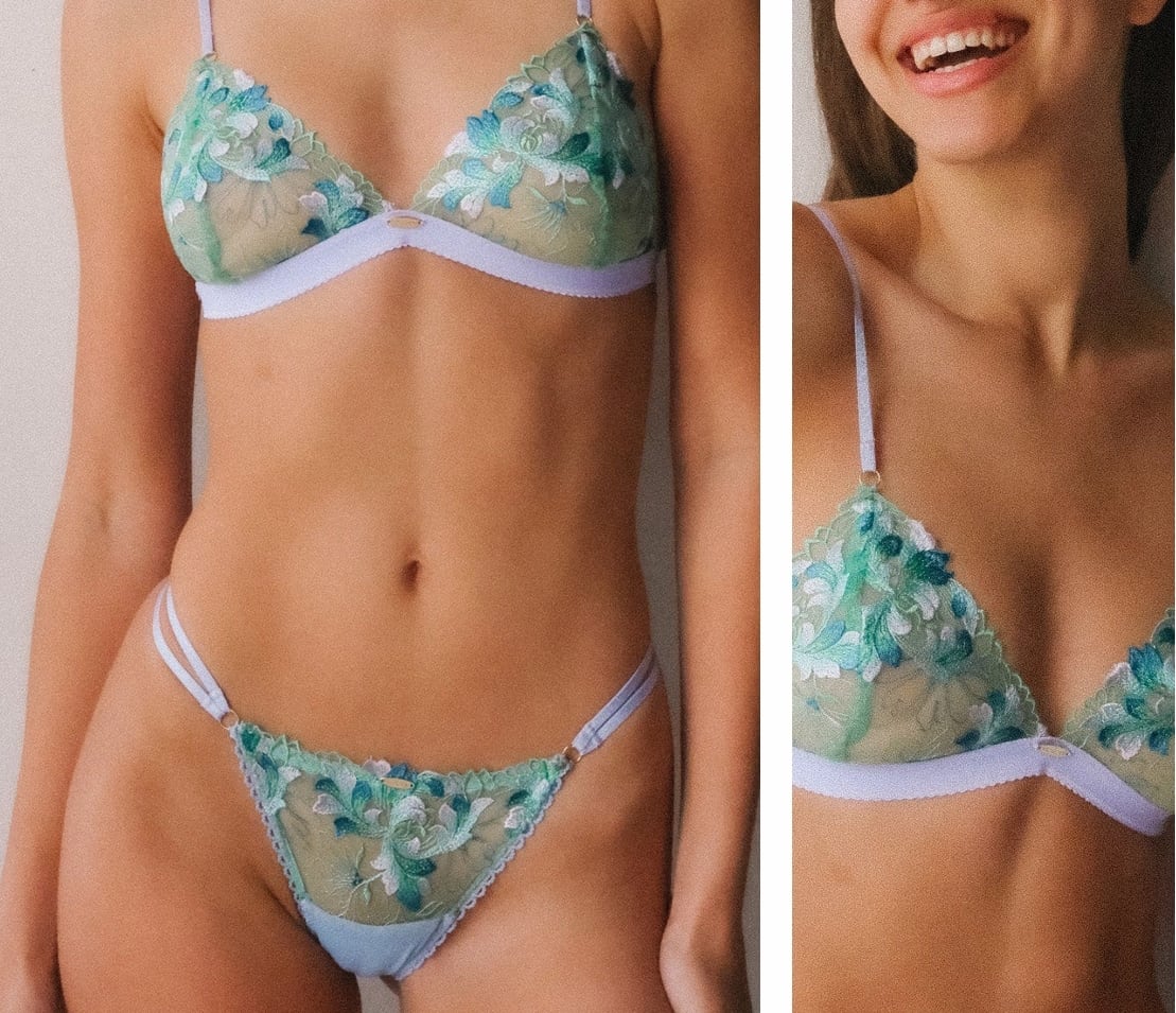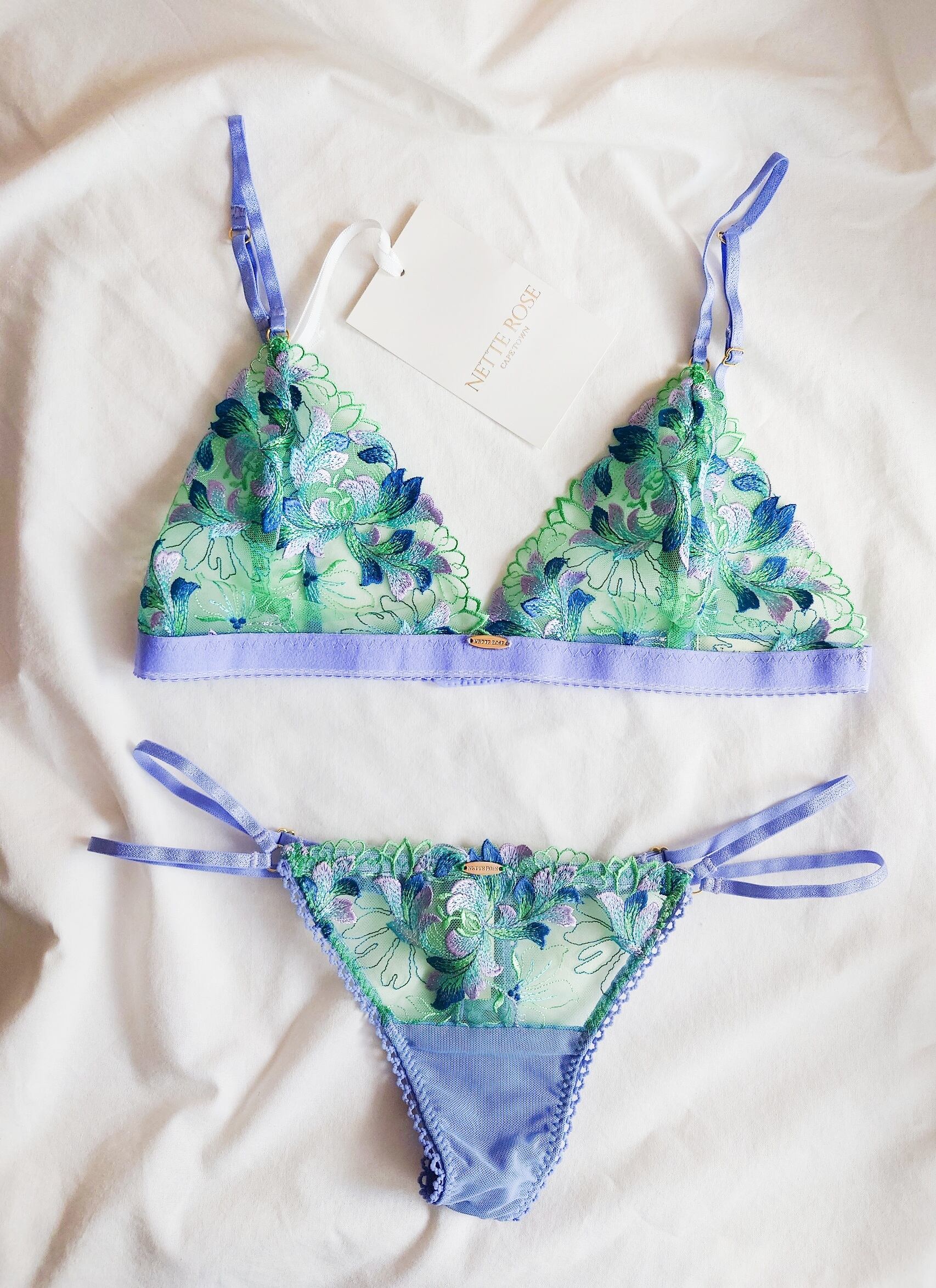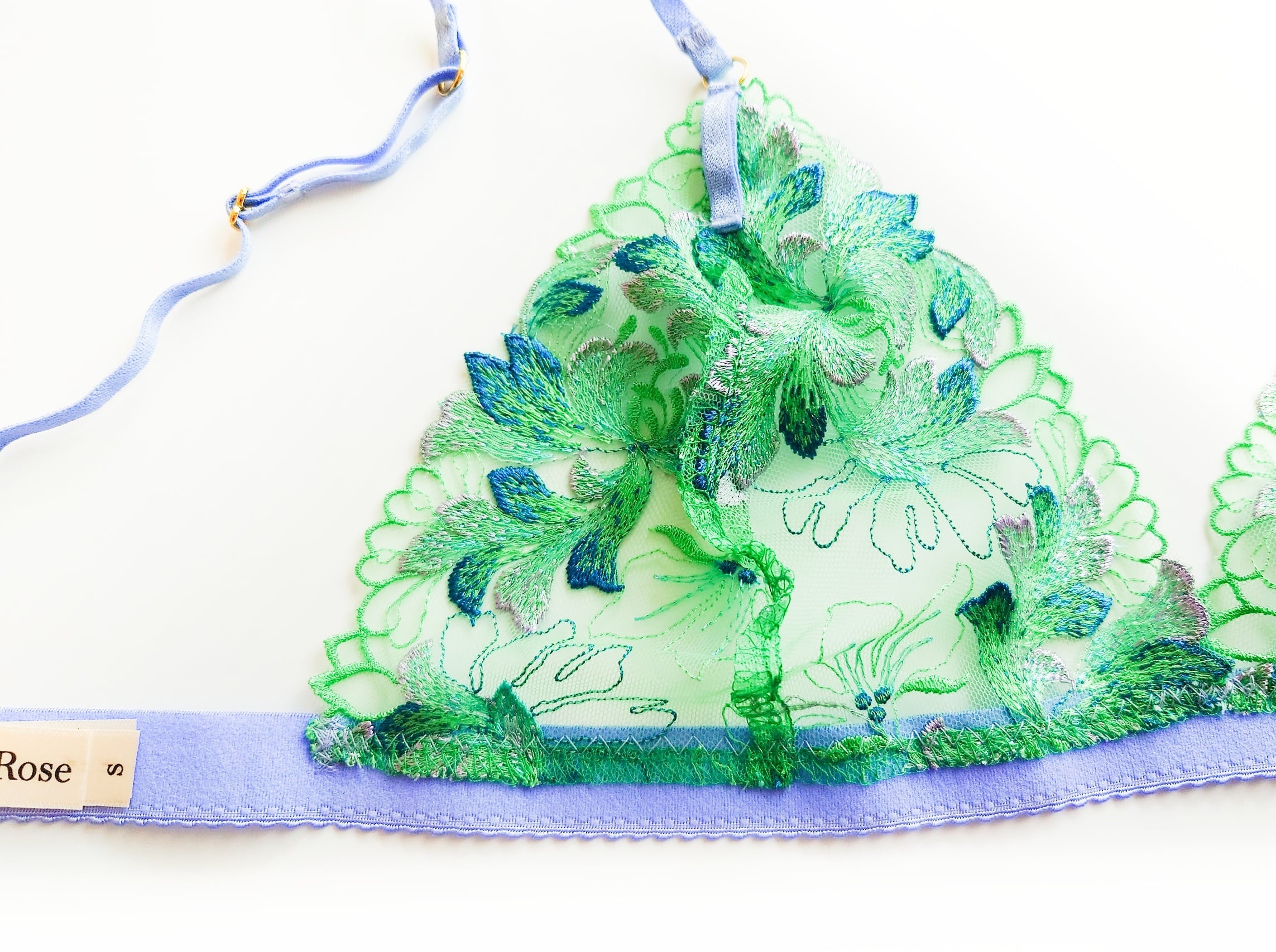 鮮やかなグリーンにターコイズとライラックを混ぜ込んだ刺繍が美しい一枚レースブラレット。