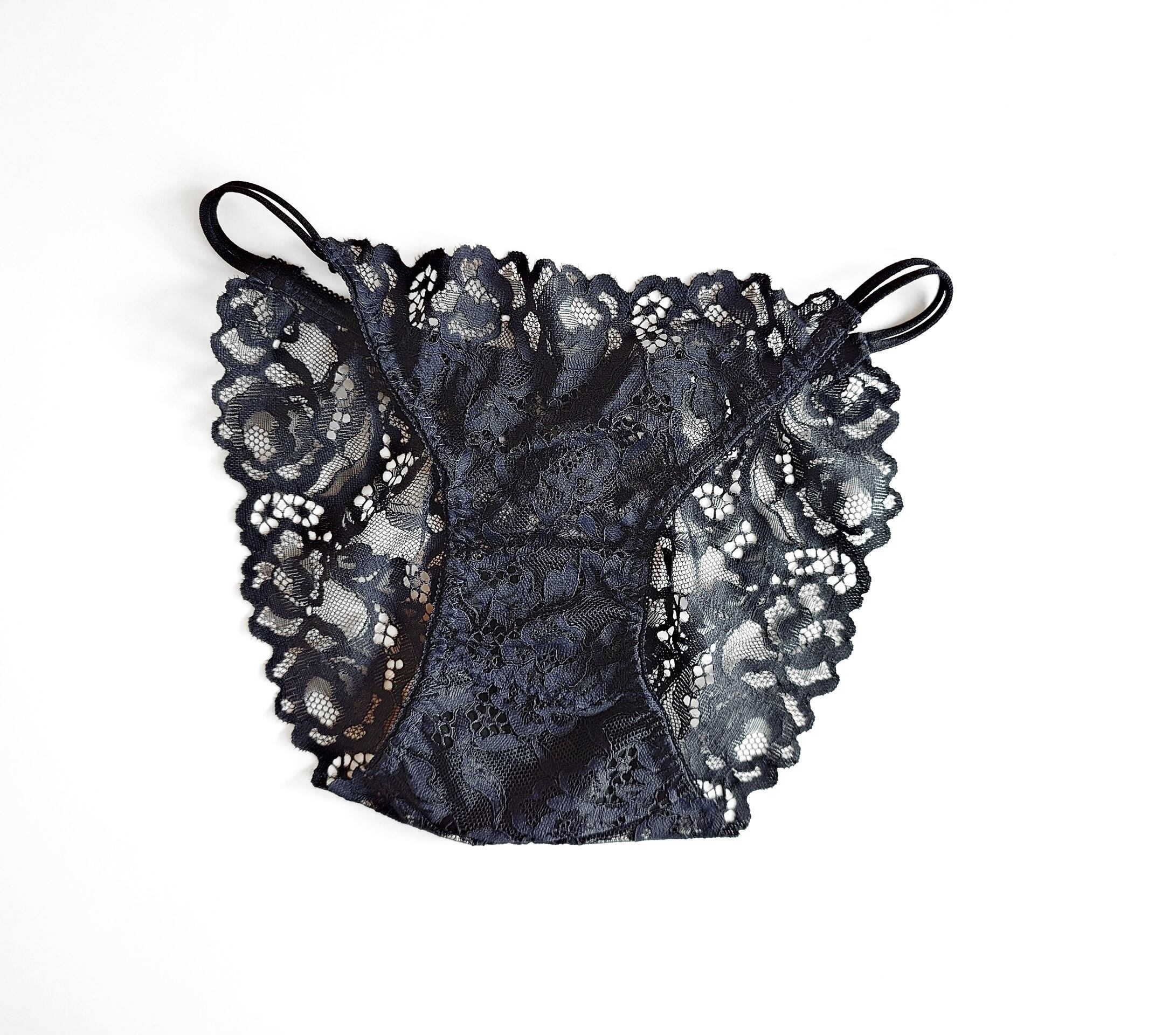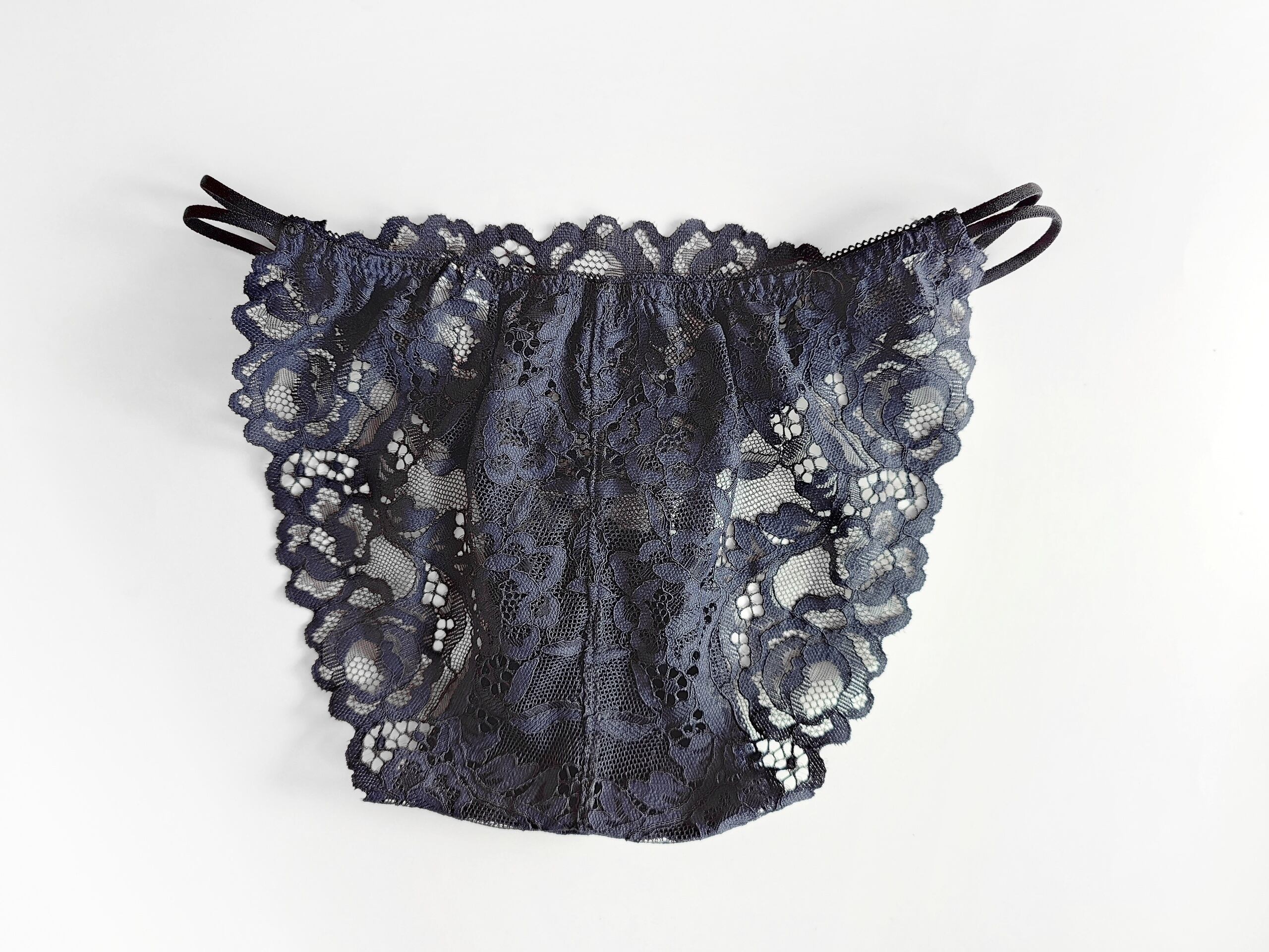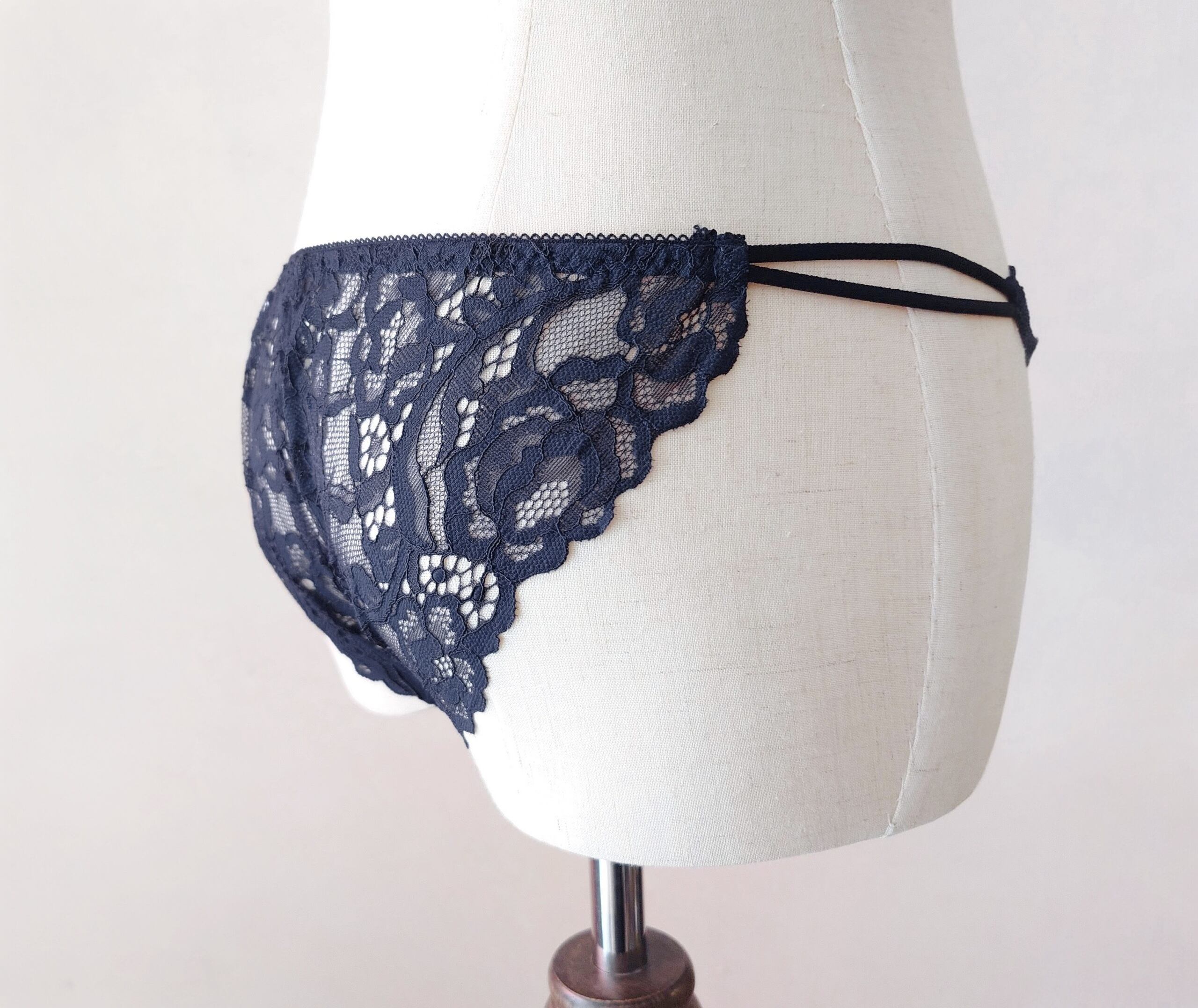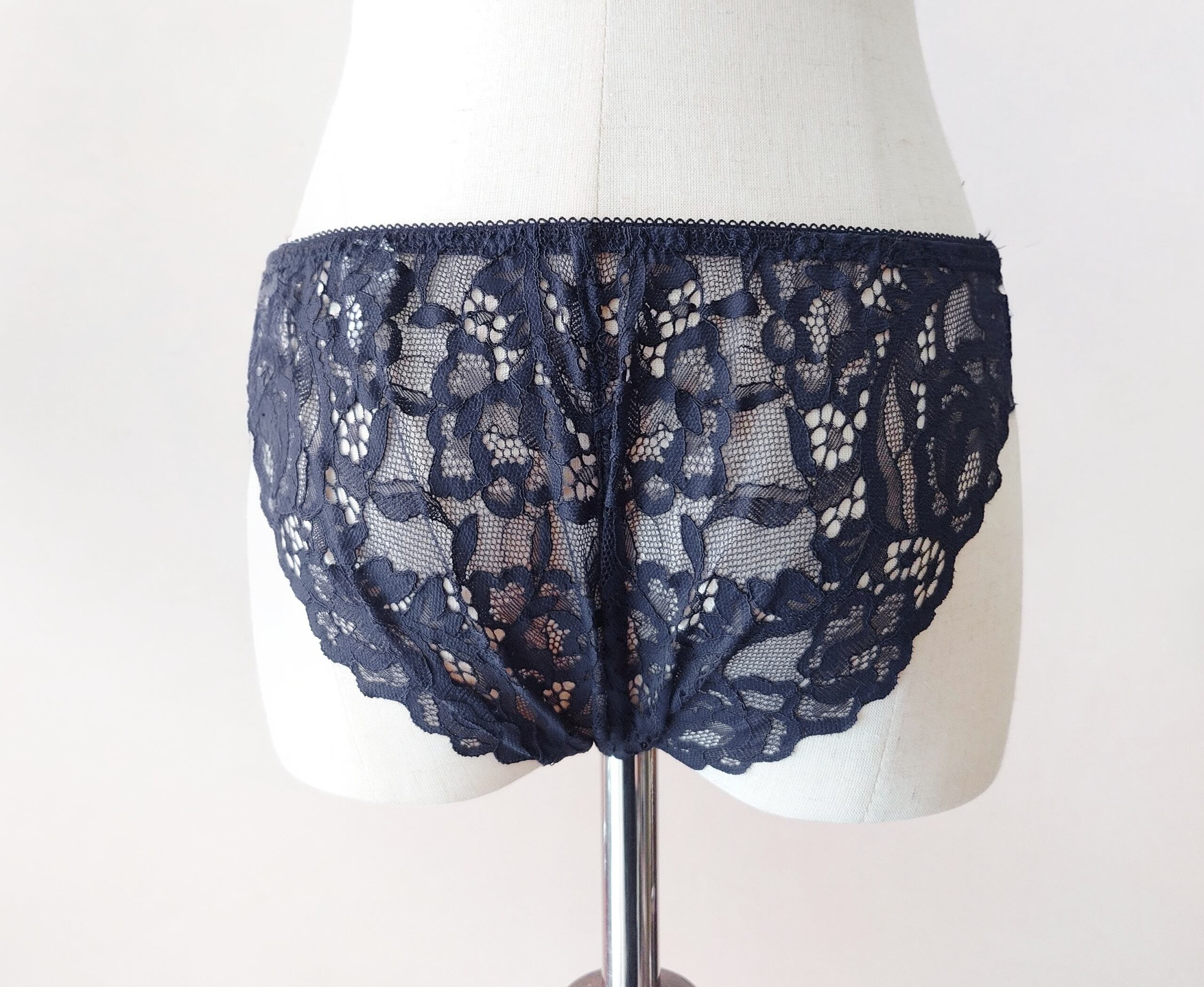 こちらのシリーズで使用されているのは大ぶりな透かしのピオニー柄コードレース。編み目が大きいので黒に近い濃紺の夜空色でも重たくならず、レース越しの肌が上品に覗きます。