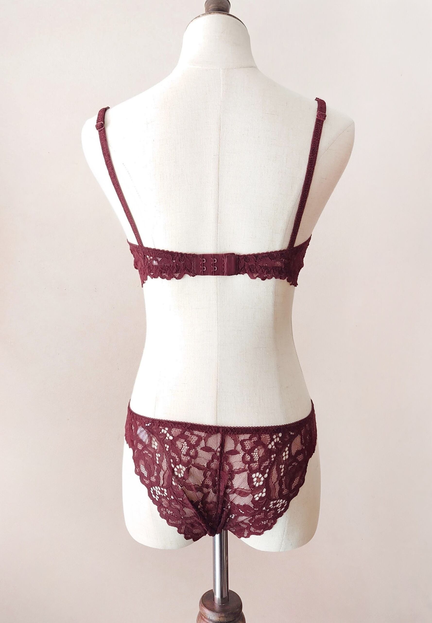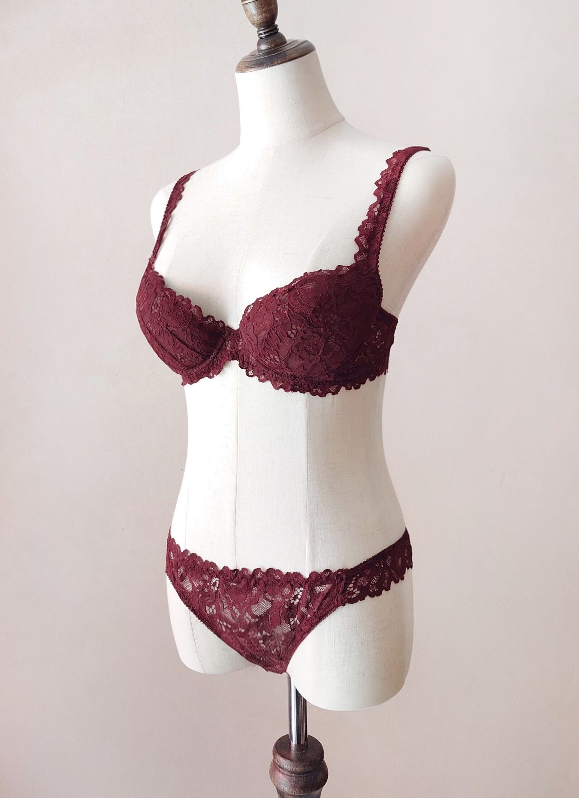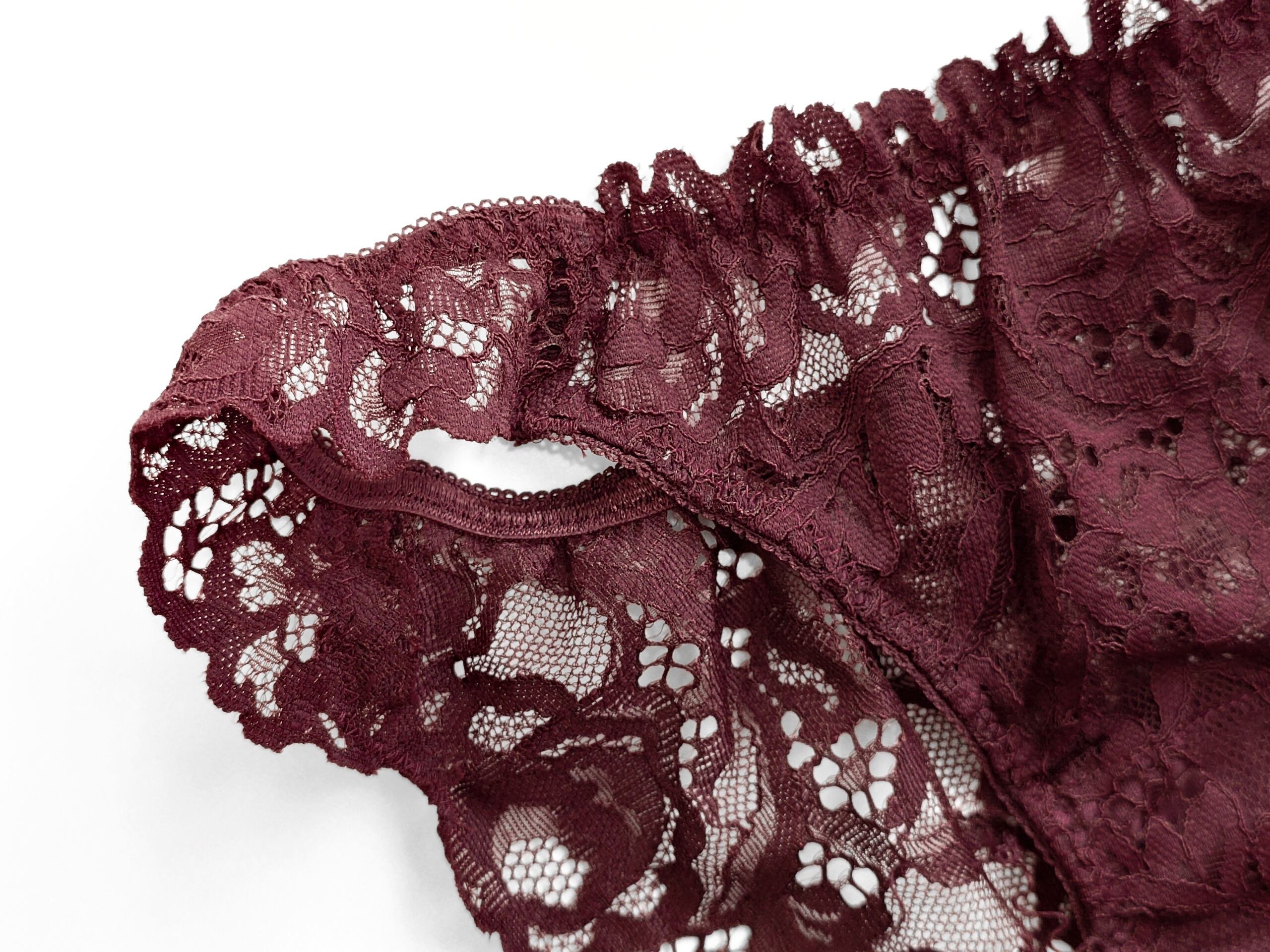 こちらのシリーズで使用されているのは大ぶりな透かしのピオニー柄コードレース。編み目が大きいので深いバーガンディ色でも重たくならず、レース越しの肌が上品に覗きます。