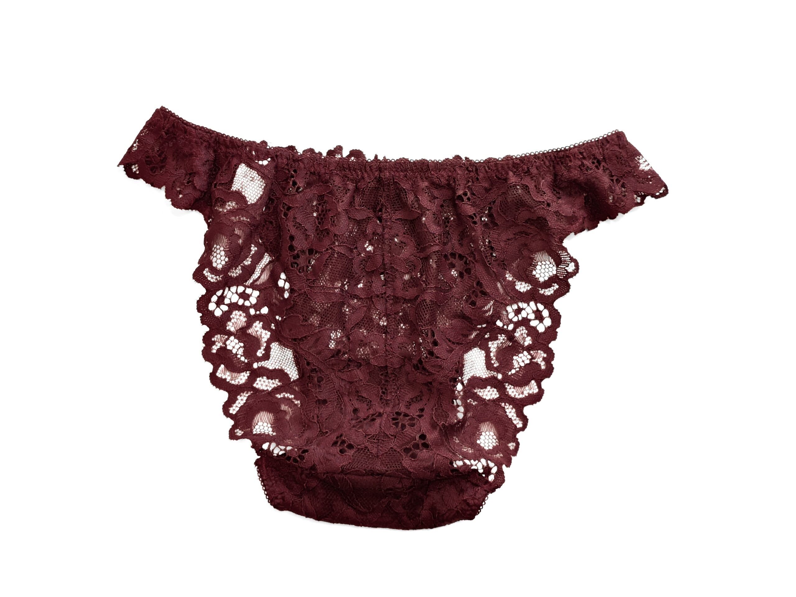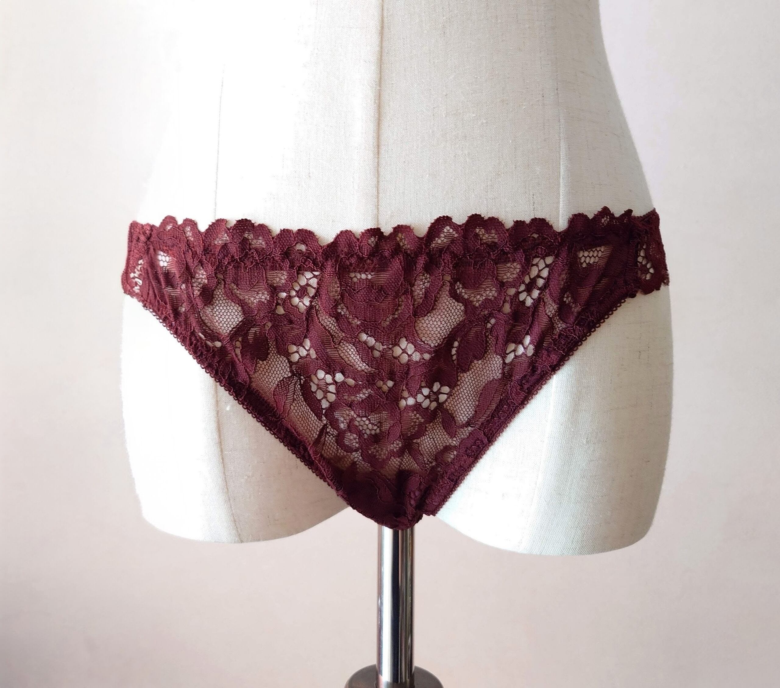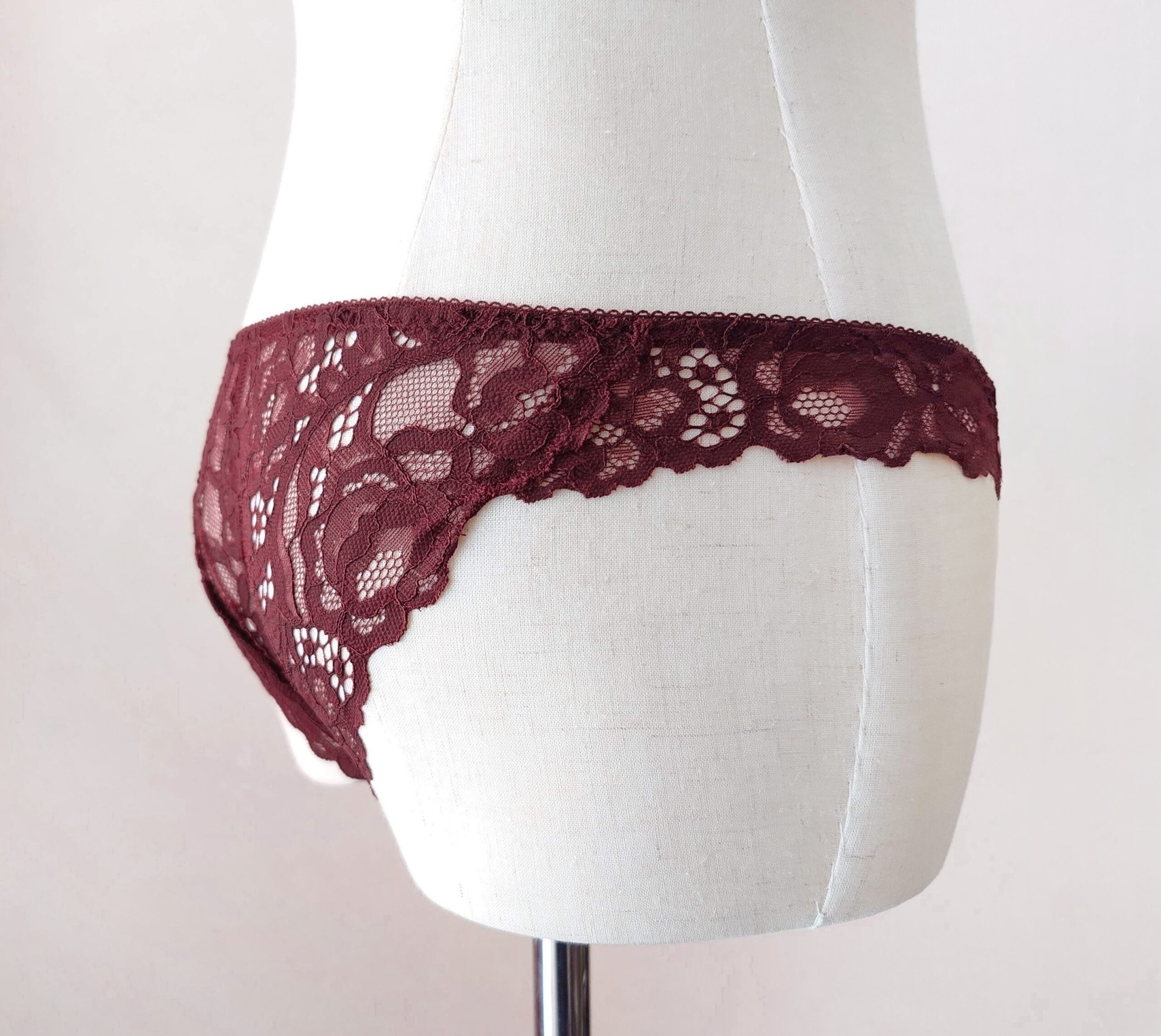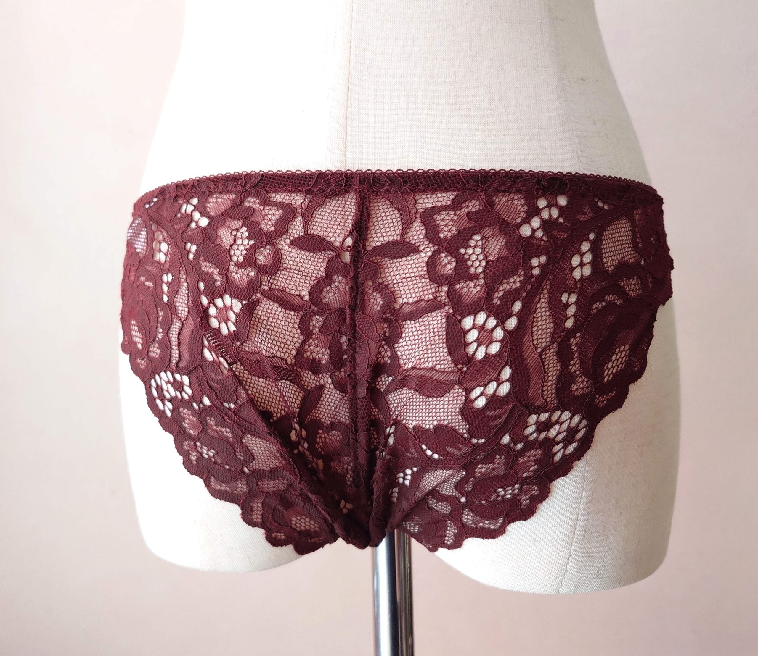こちらのシリーズで使用されているのは大ぶりな透かしのピオニー柄コードレース。編み目が大きいので深いバーガンディ色でも重たくならず、レース越しの肌が上品に覗きます。
