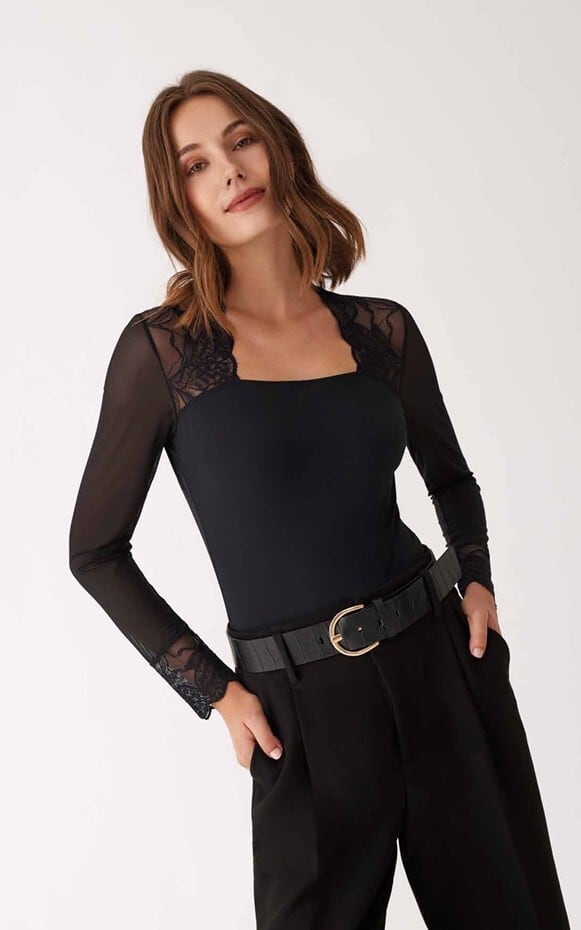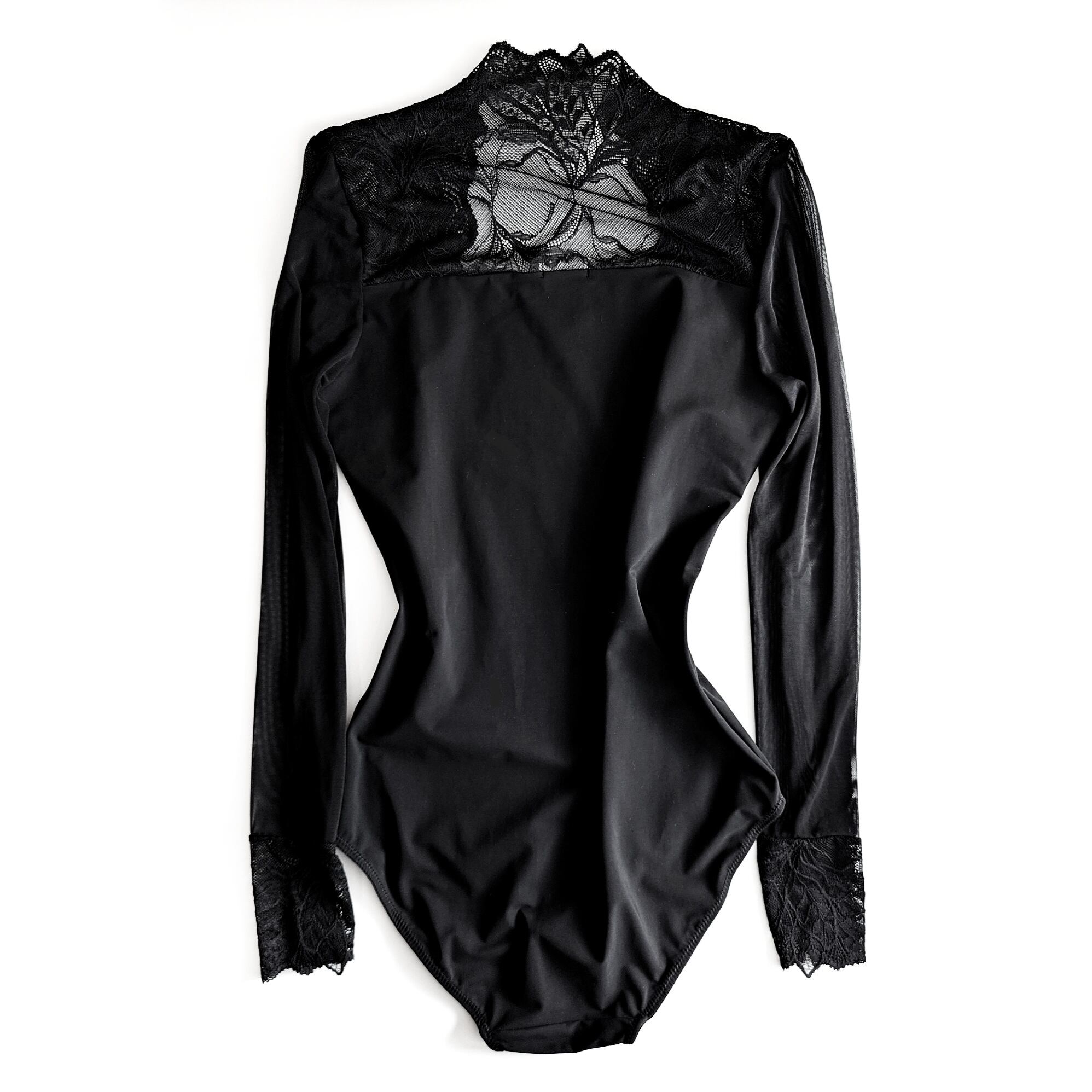 肩周りはやわらかいストレッチレース、お袖はチュール、身頃は透け感のないストレッチ生地で切り替えになっております。
