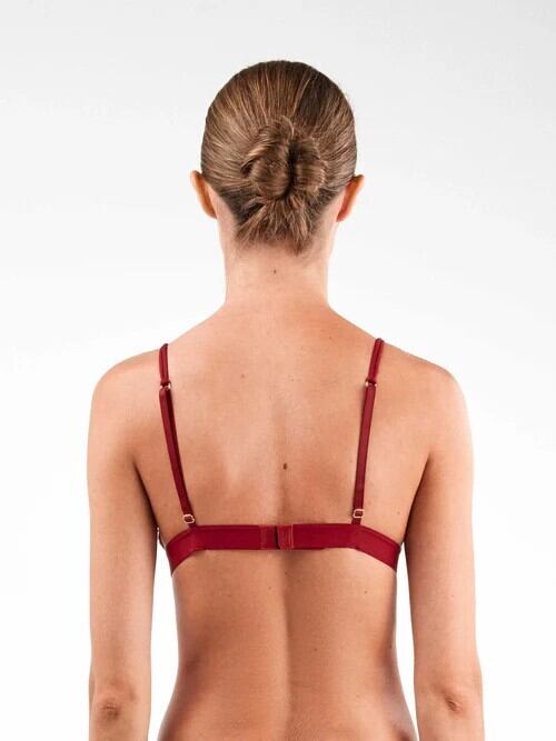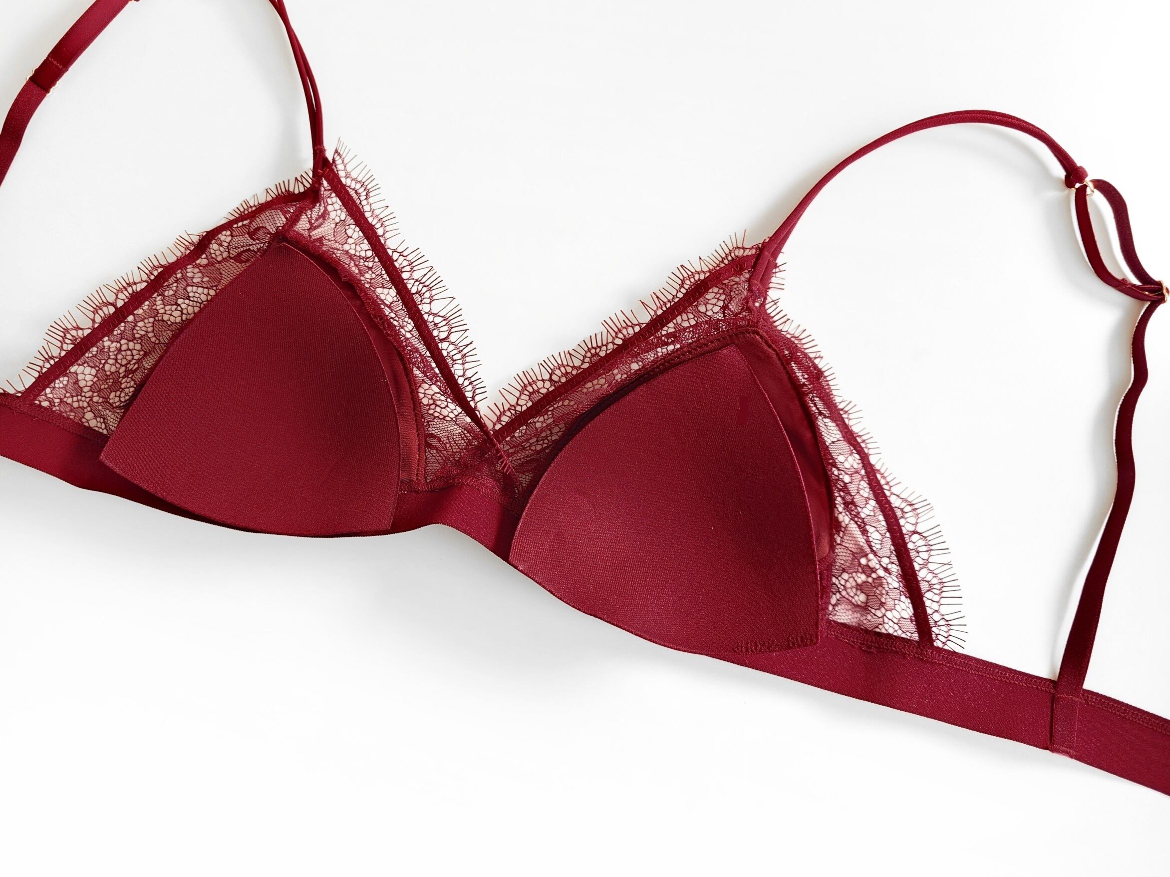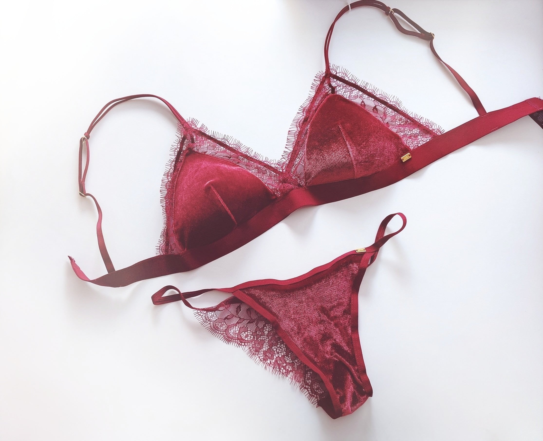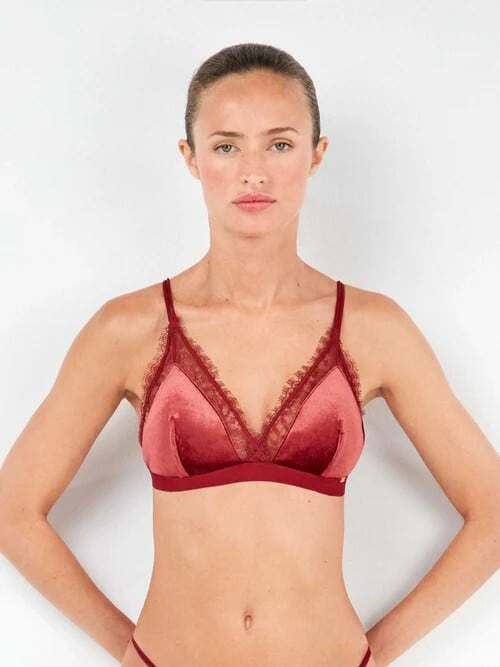 上品なベルベットとレースのカップ付きノンワイヤートライアングルブラ。