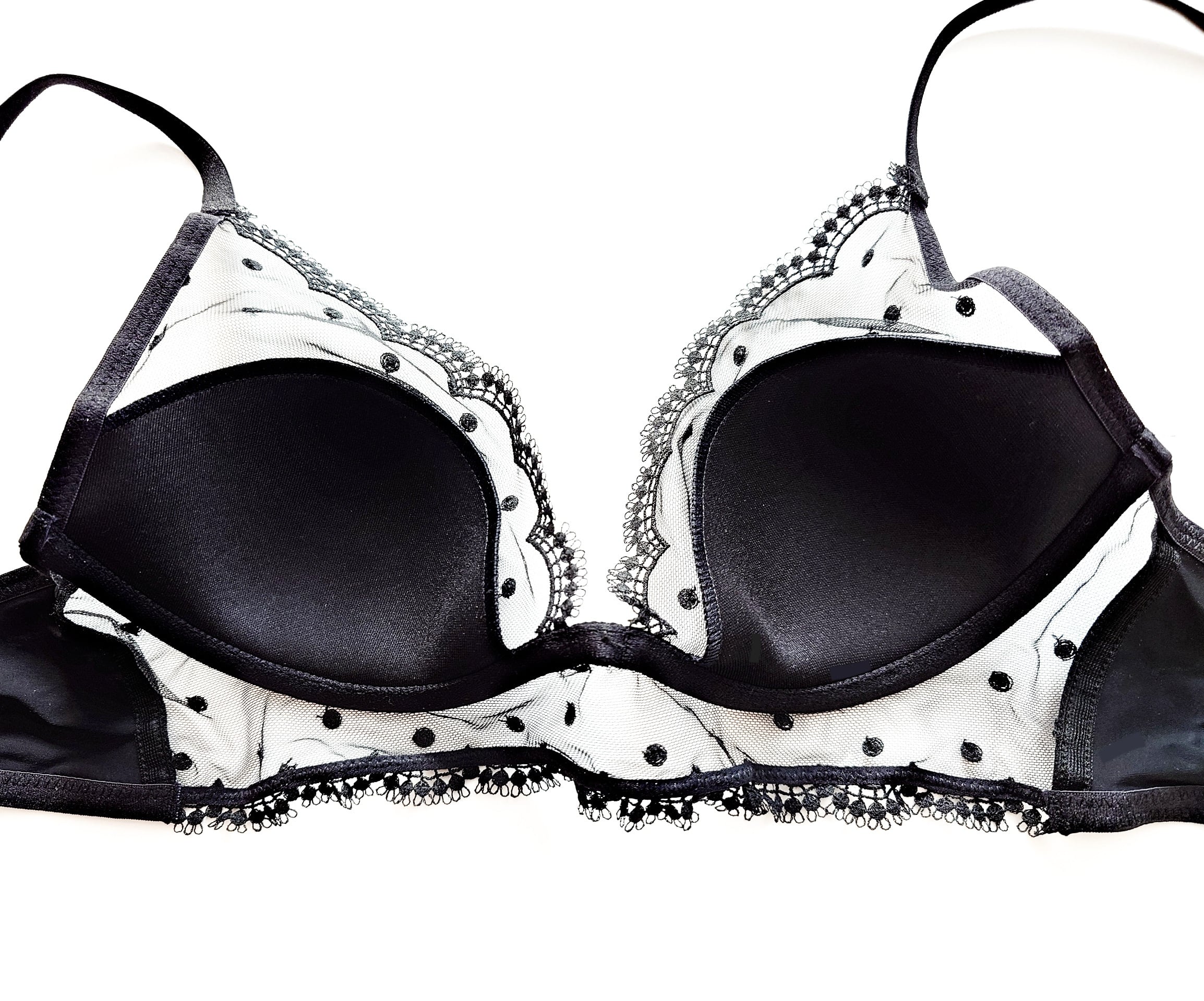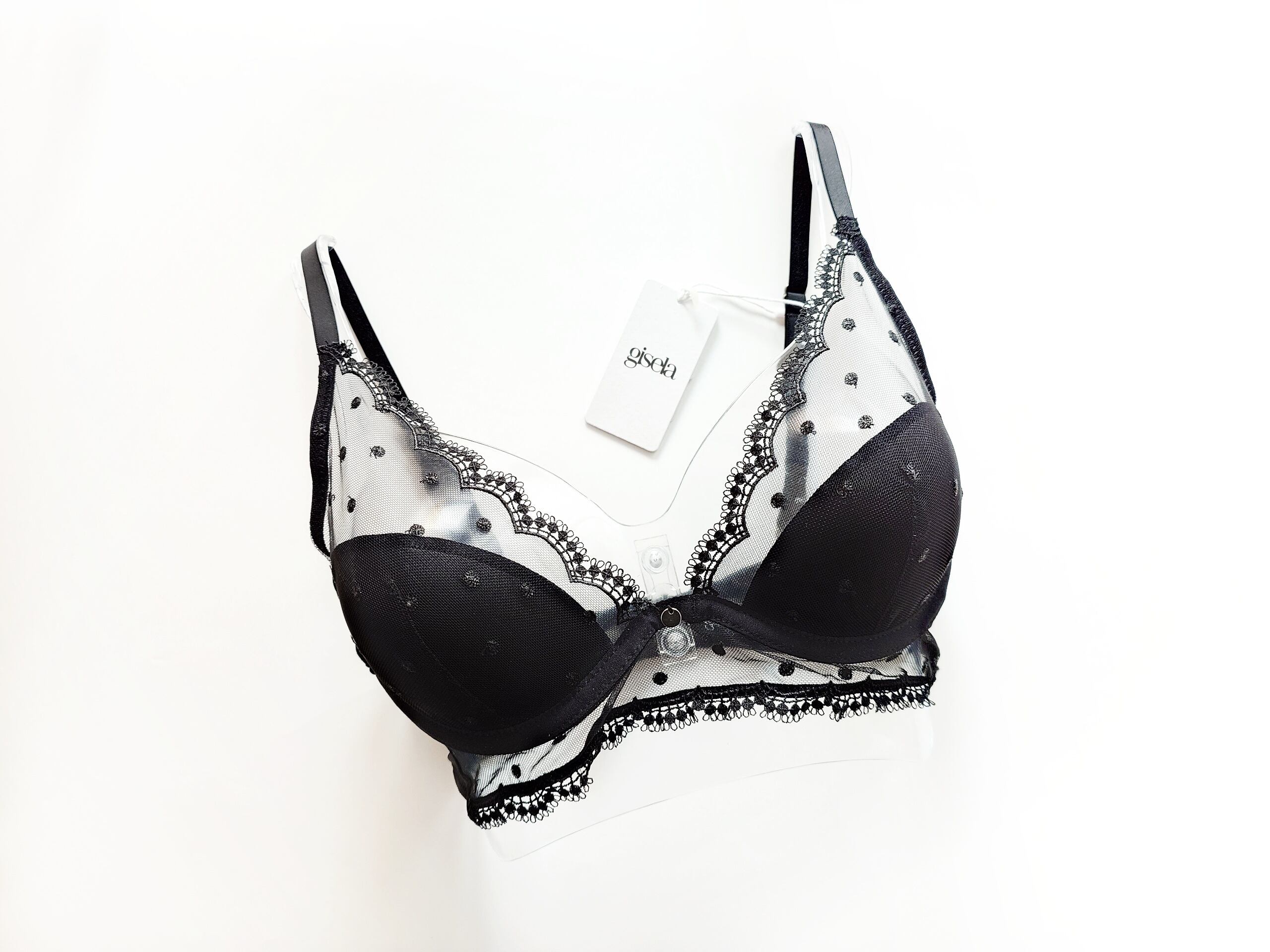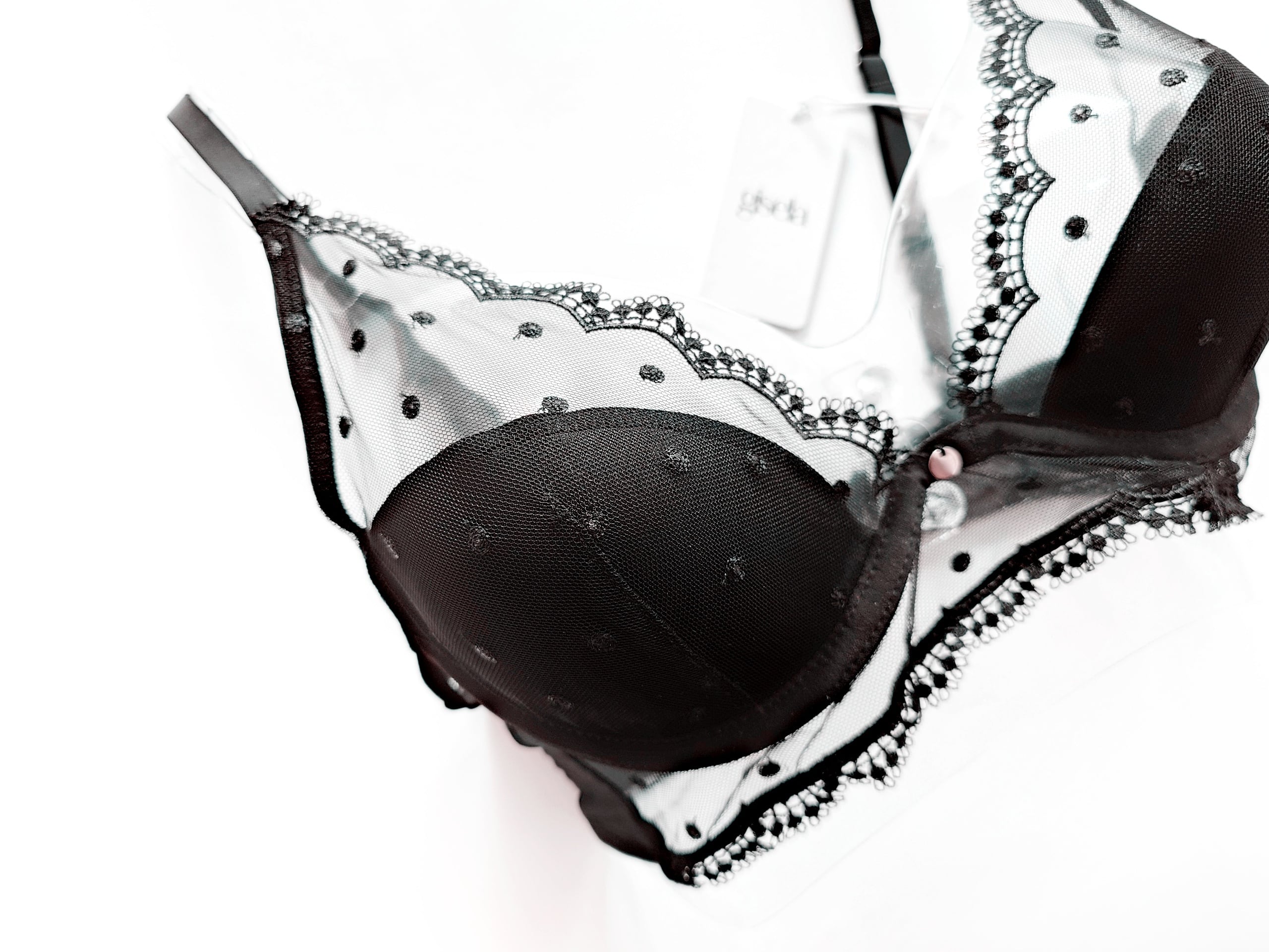 ドットチュールの下半分には浅めのフォームカップが付いているので、透け感デザインも楽しみつつカップもある安心設計。全体的に薄くて軽い着け心地です。