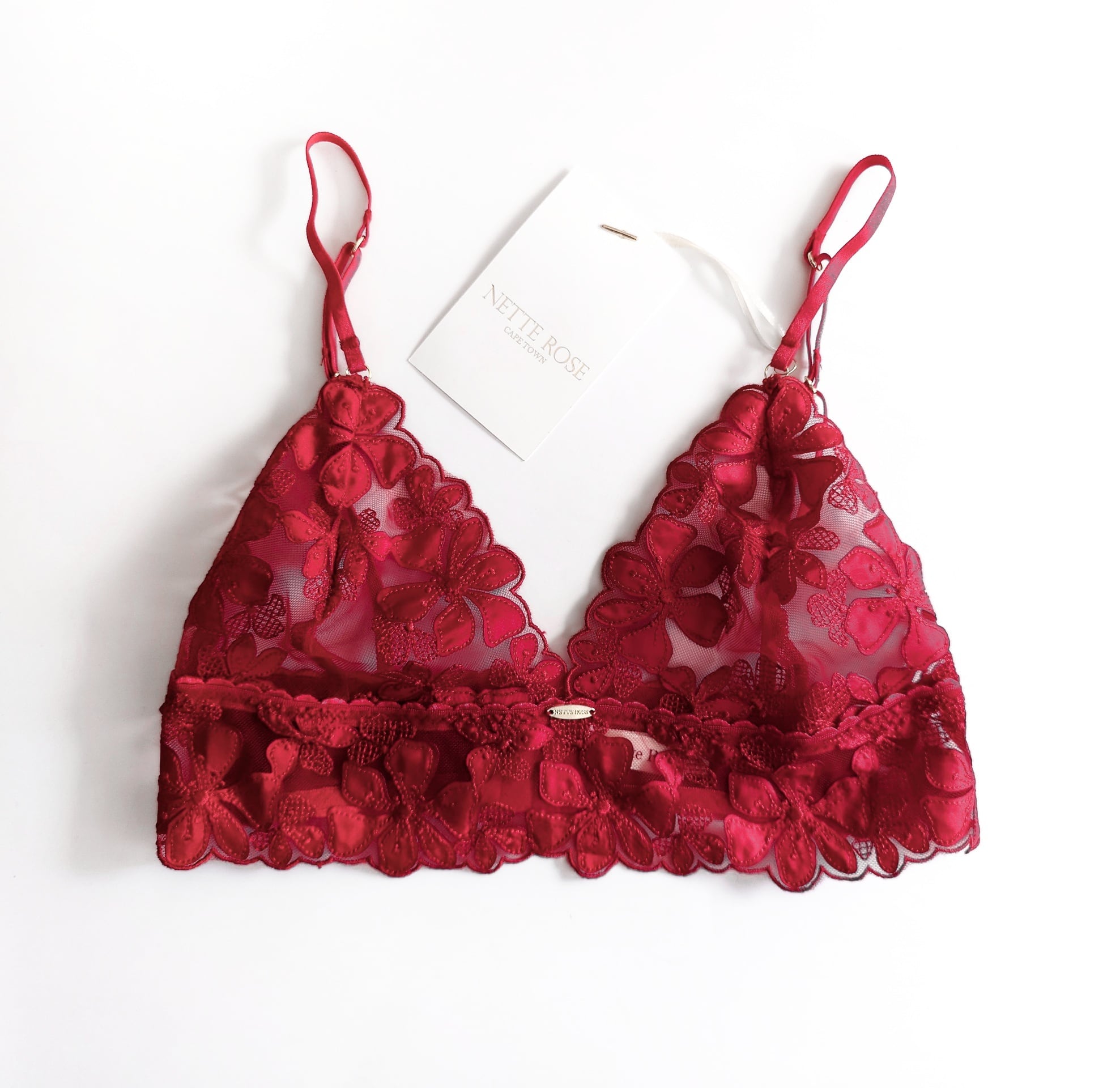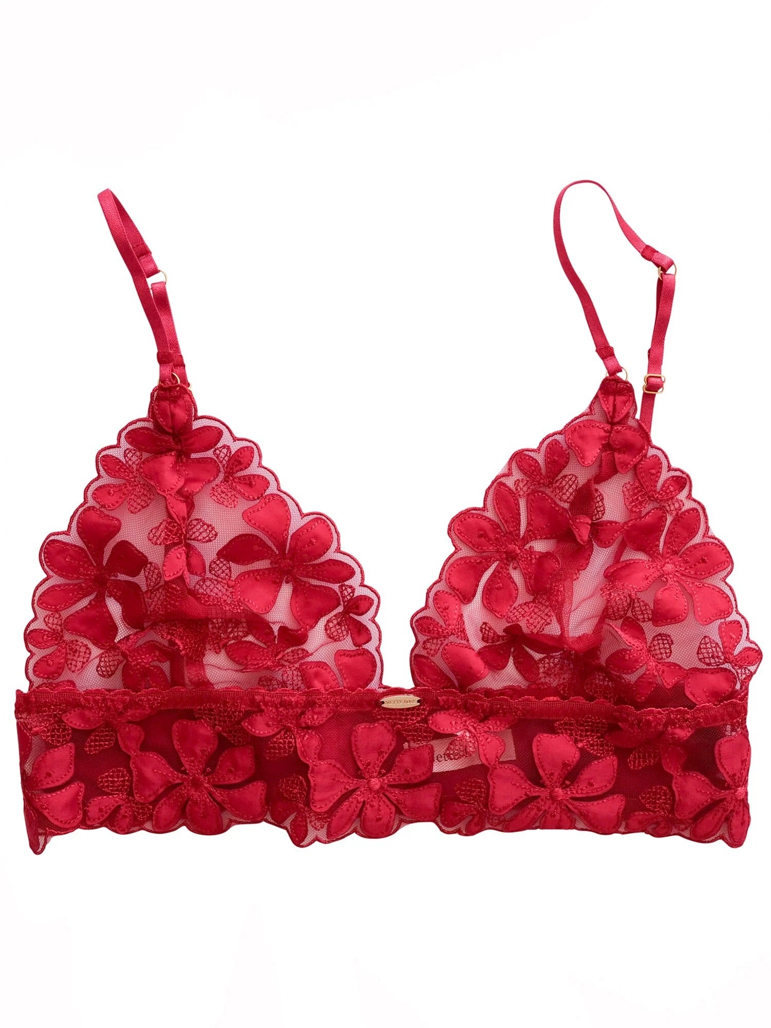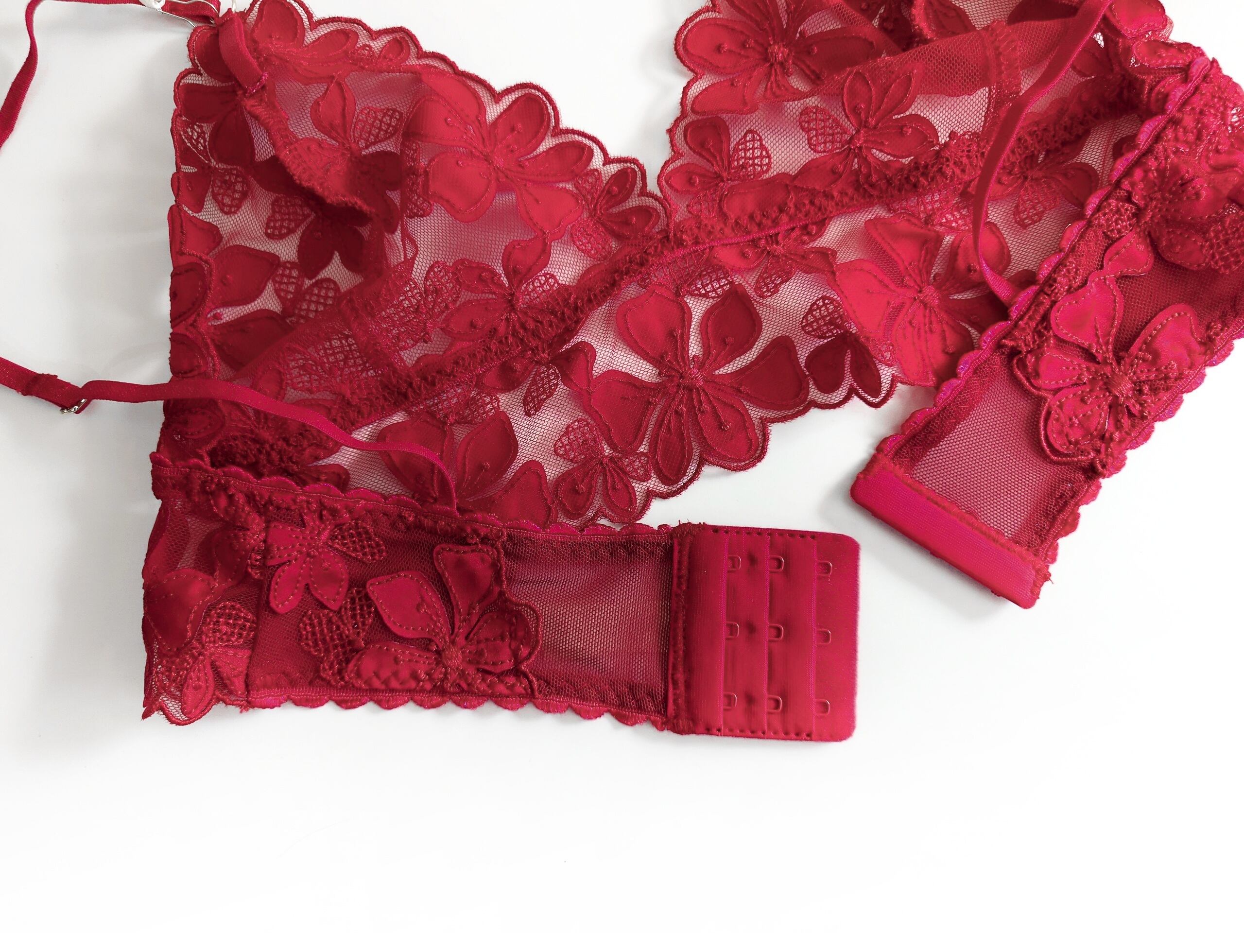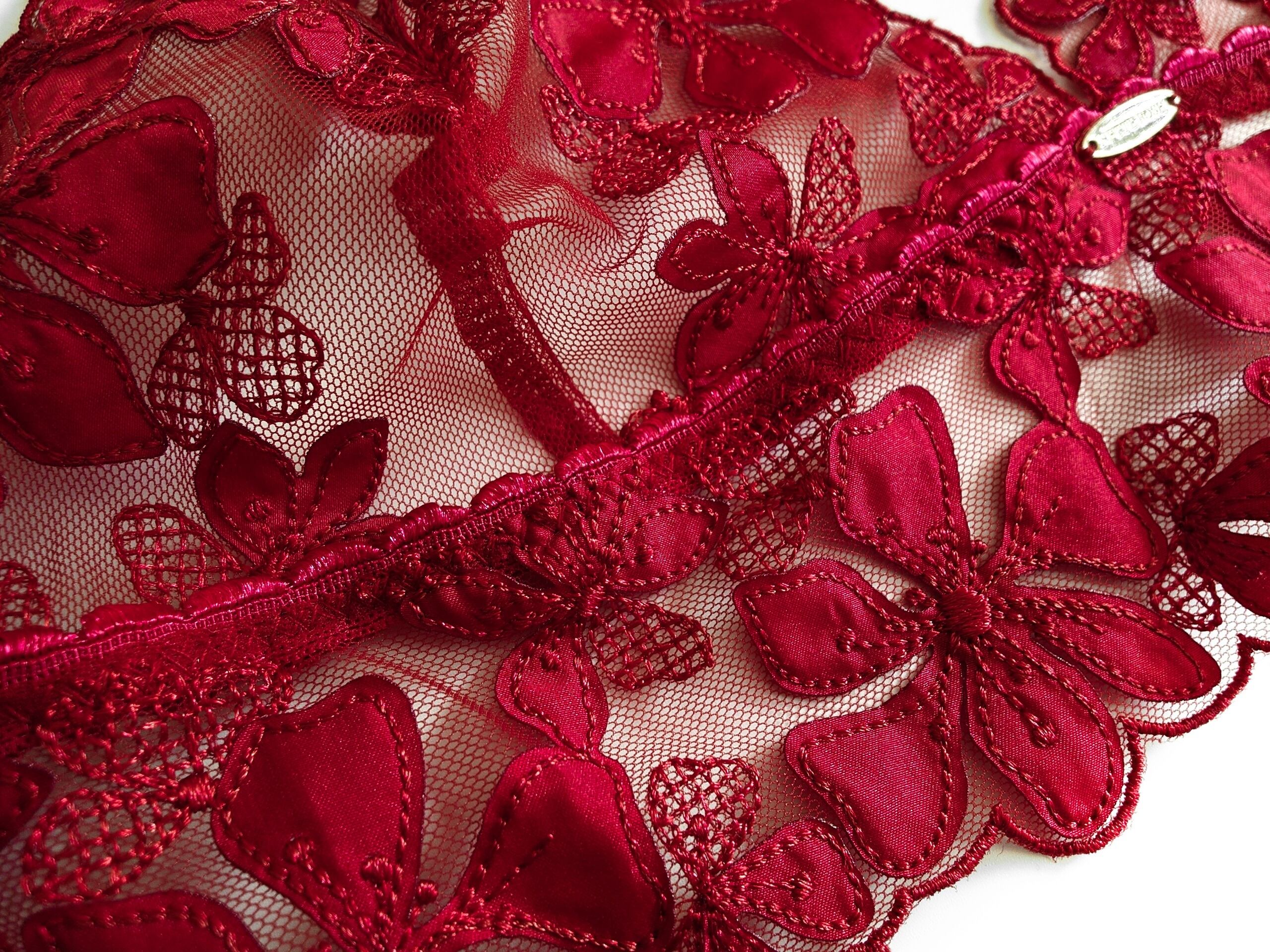 情熱的な深紅のチュールに同色の刺繍&縫い付けたサテンのアップリケで花柄を作り出したミドル丈ノンワイヤーブラレット。