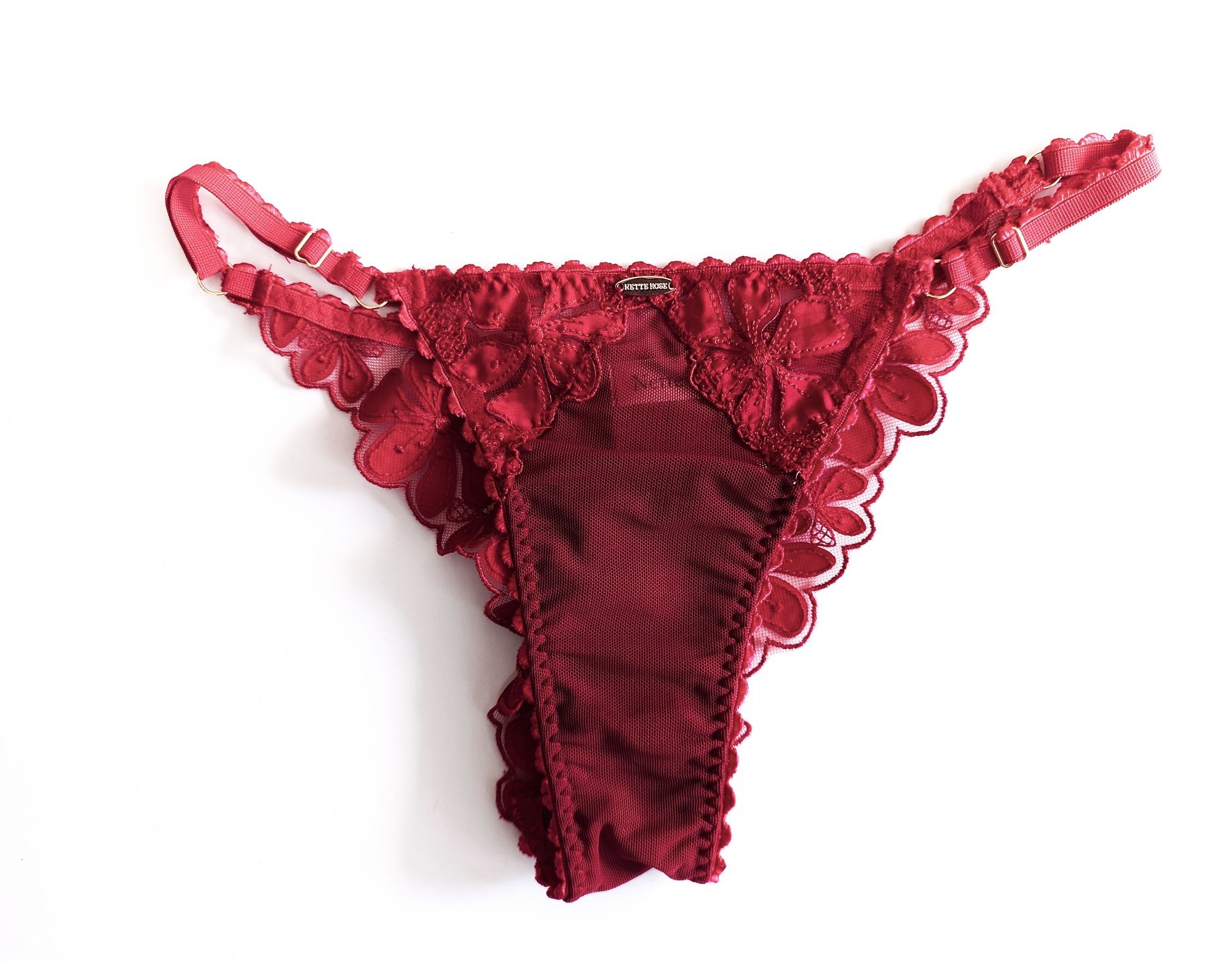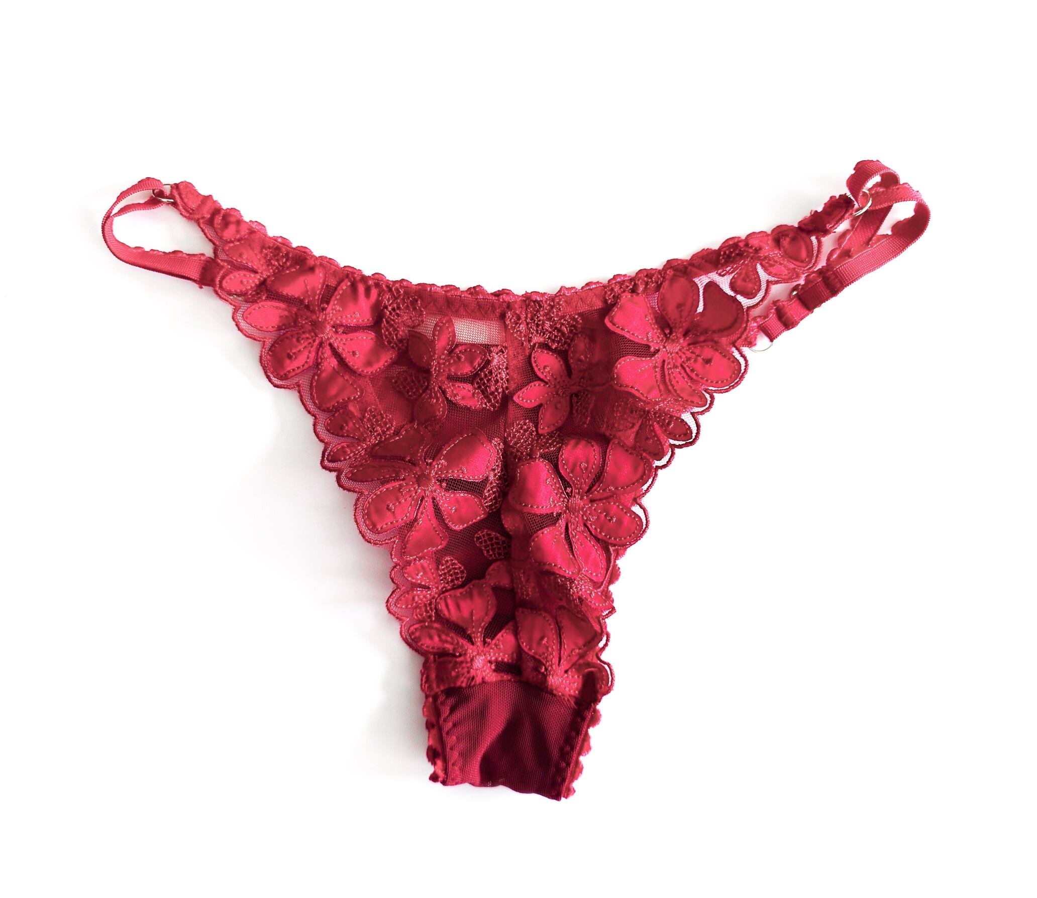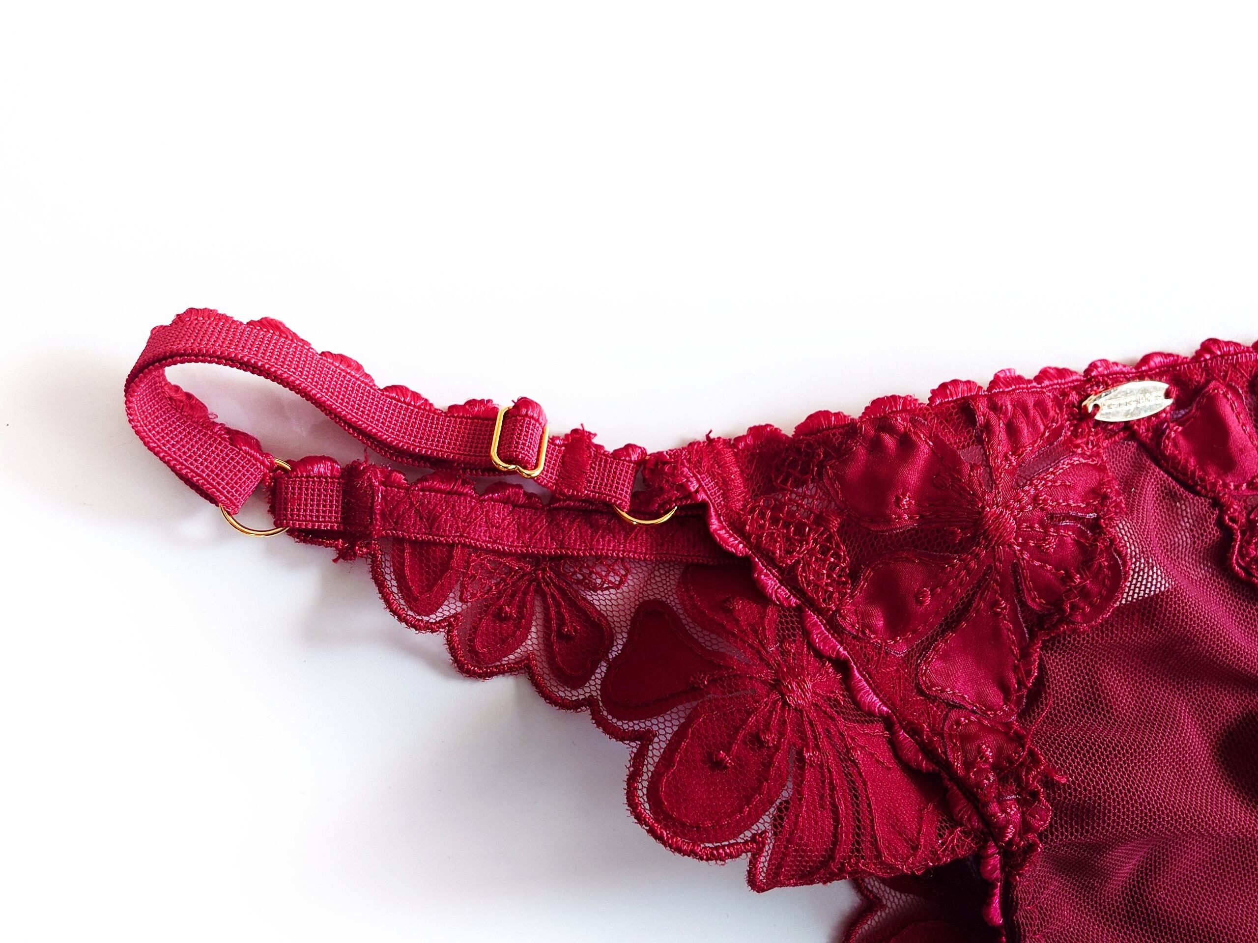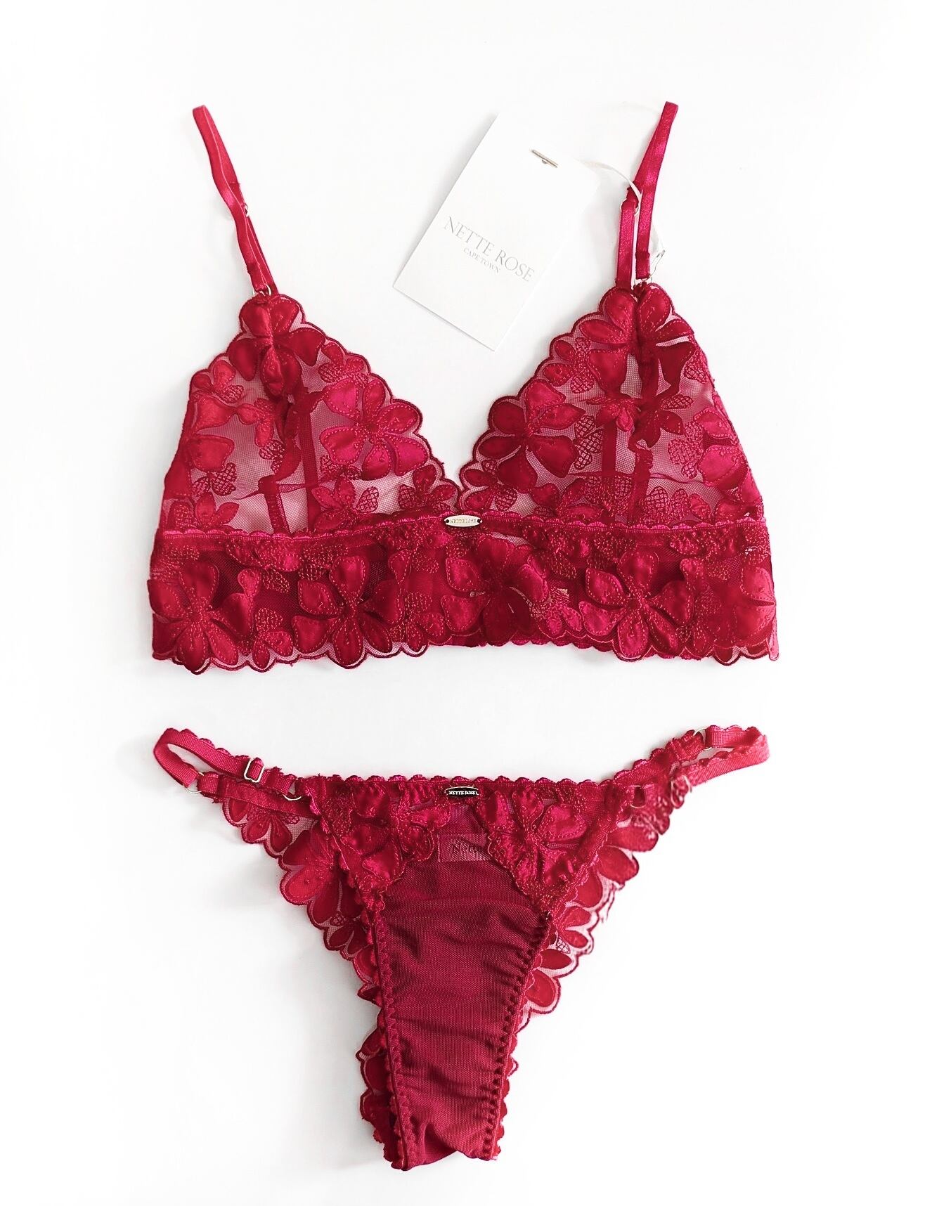 情熱的な深紅のチュールに同色の刺繍&縫い付けたサテンのアップリケで花柄を作り出したミドル丈ノンワイヤーブラレット。