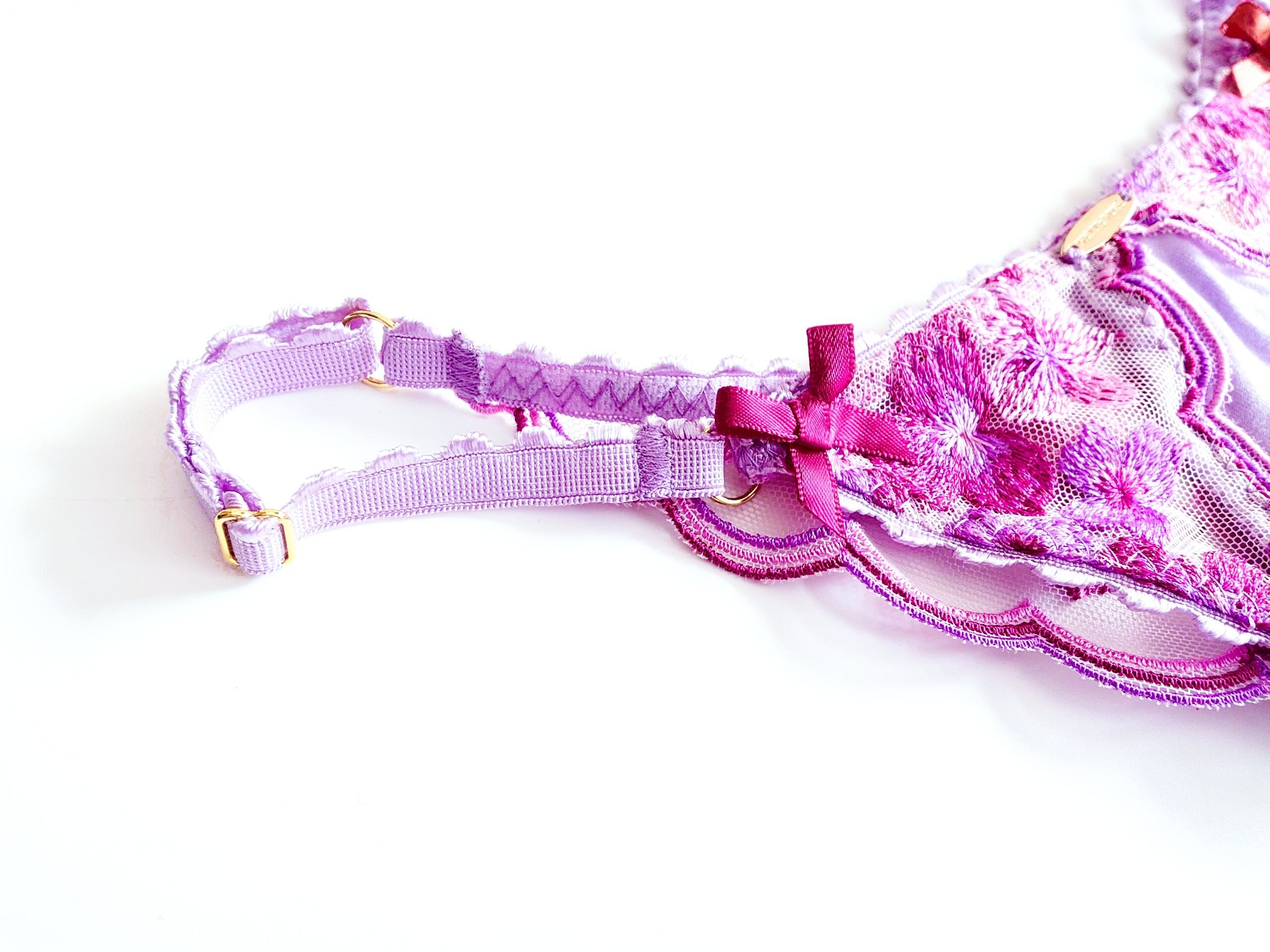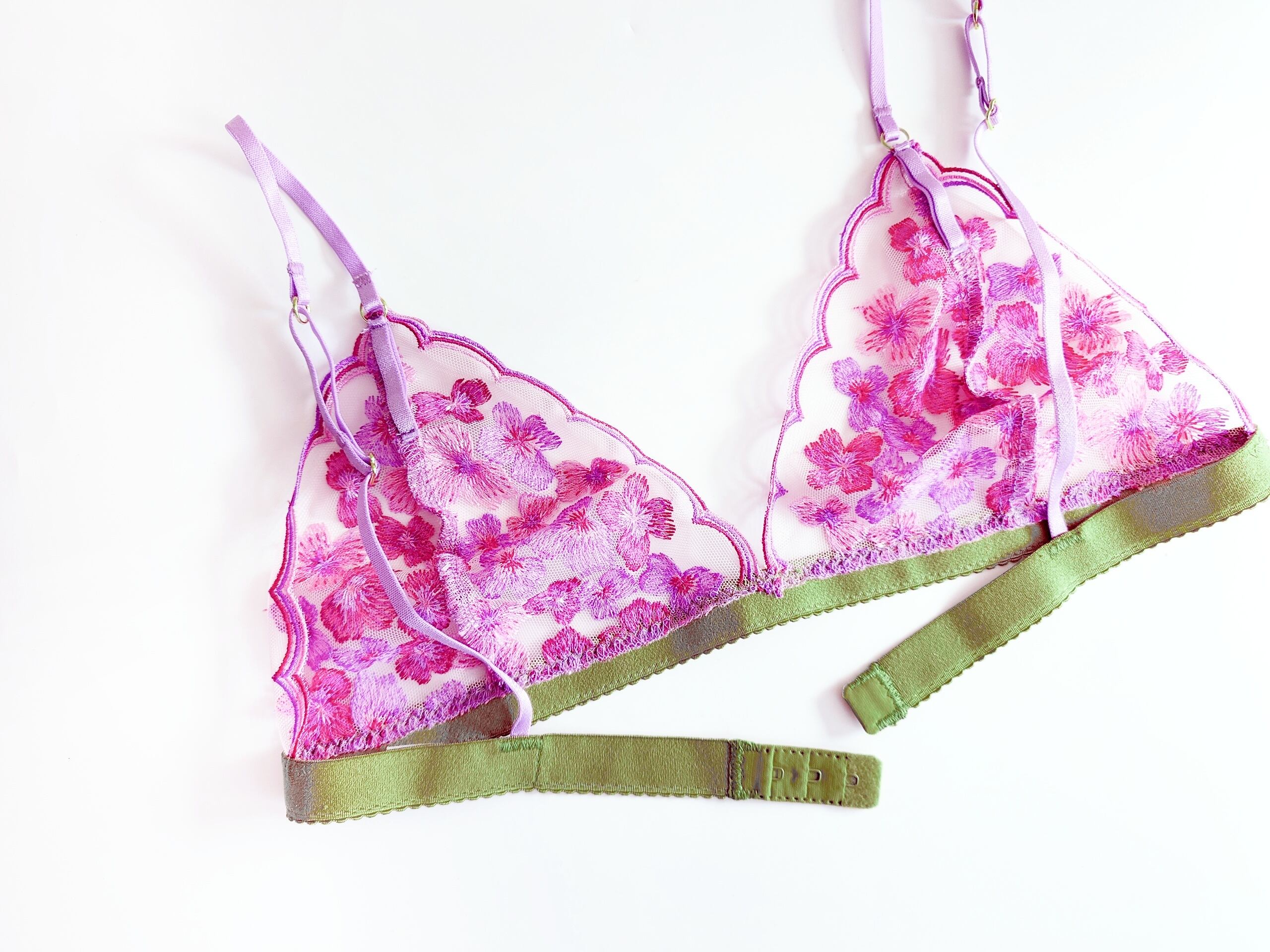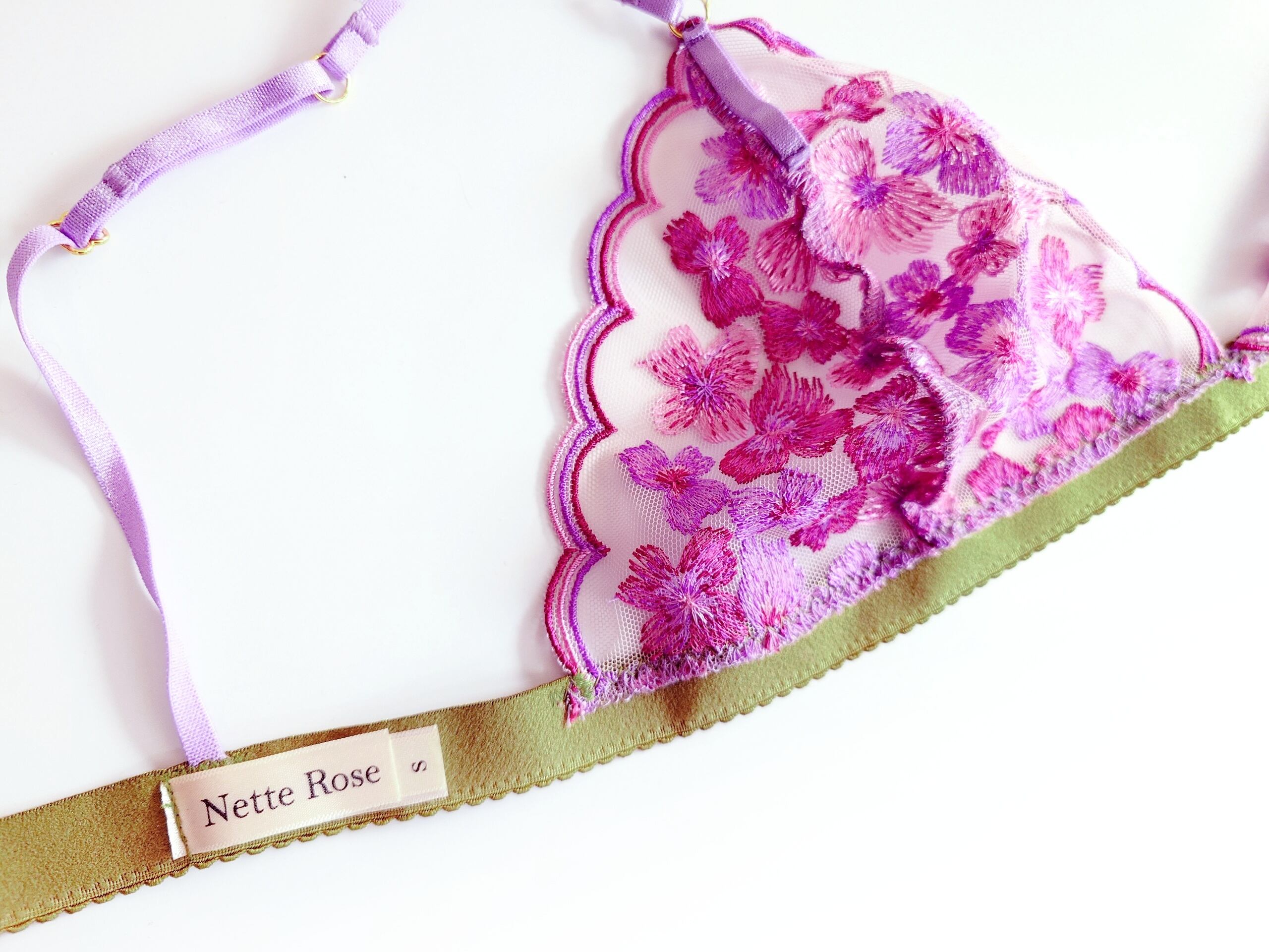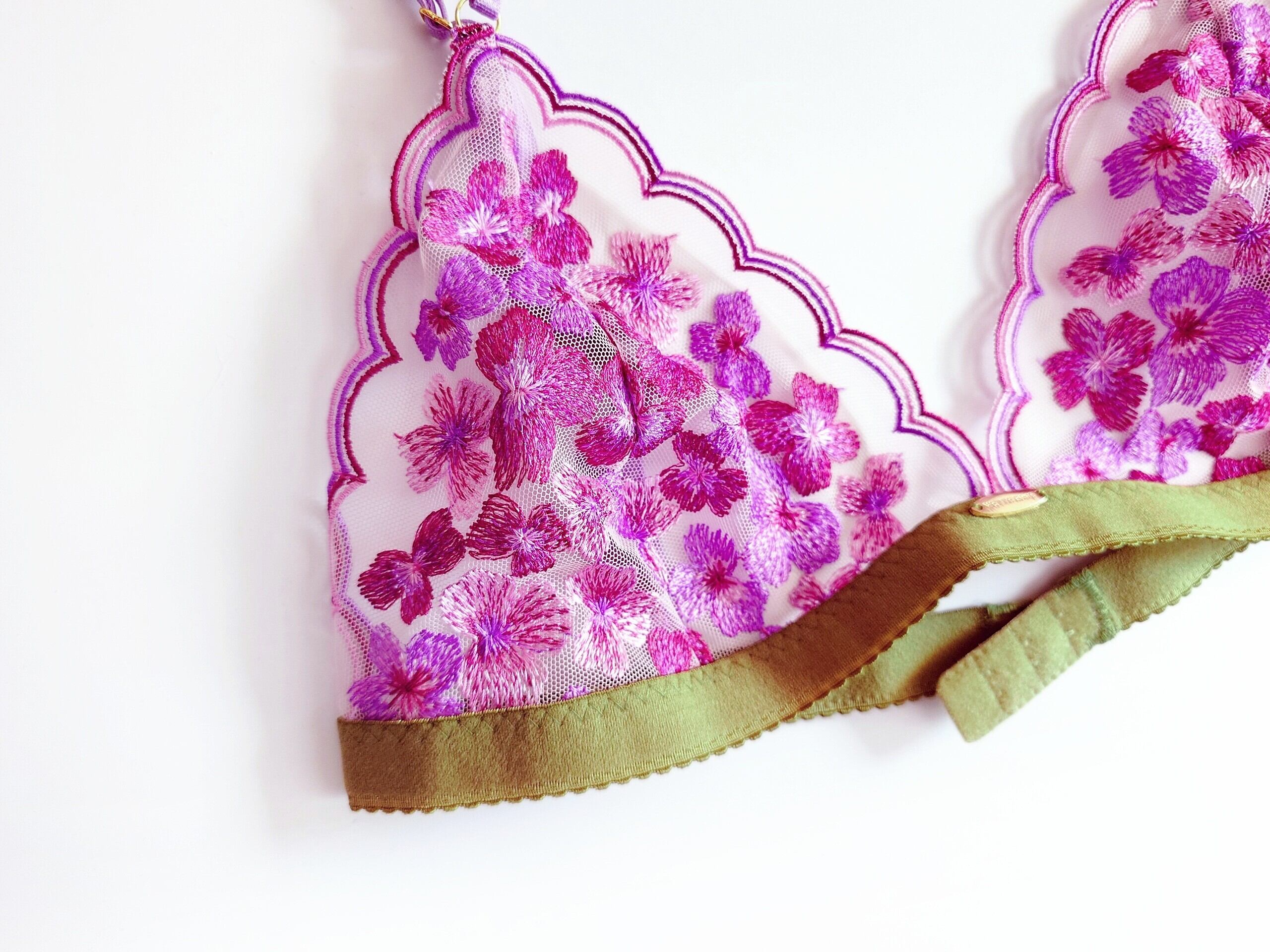 ピンクとライラックとワインカラーのスカラップ&フラワー刺繍のトライアングルブラレット。