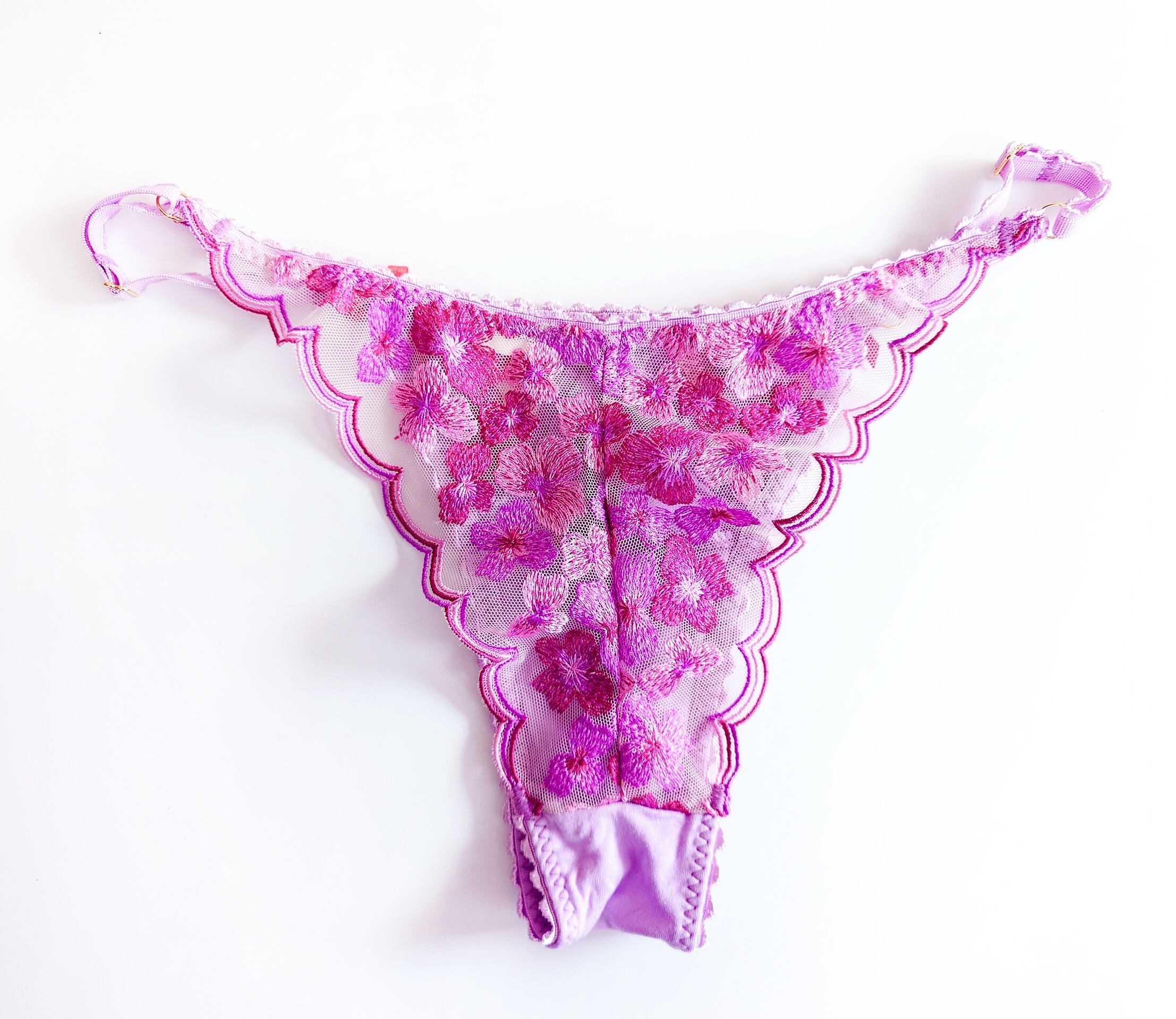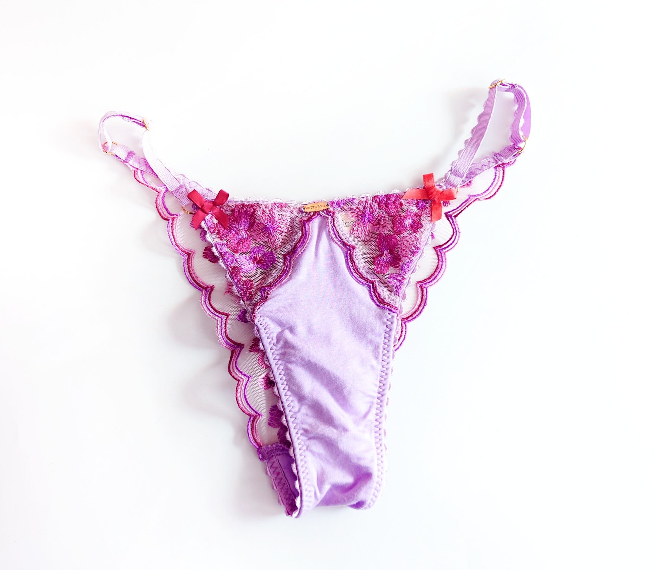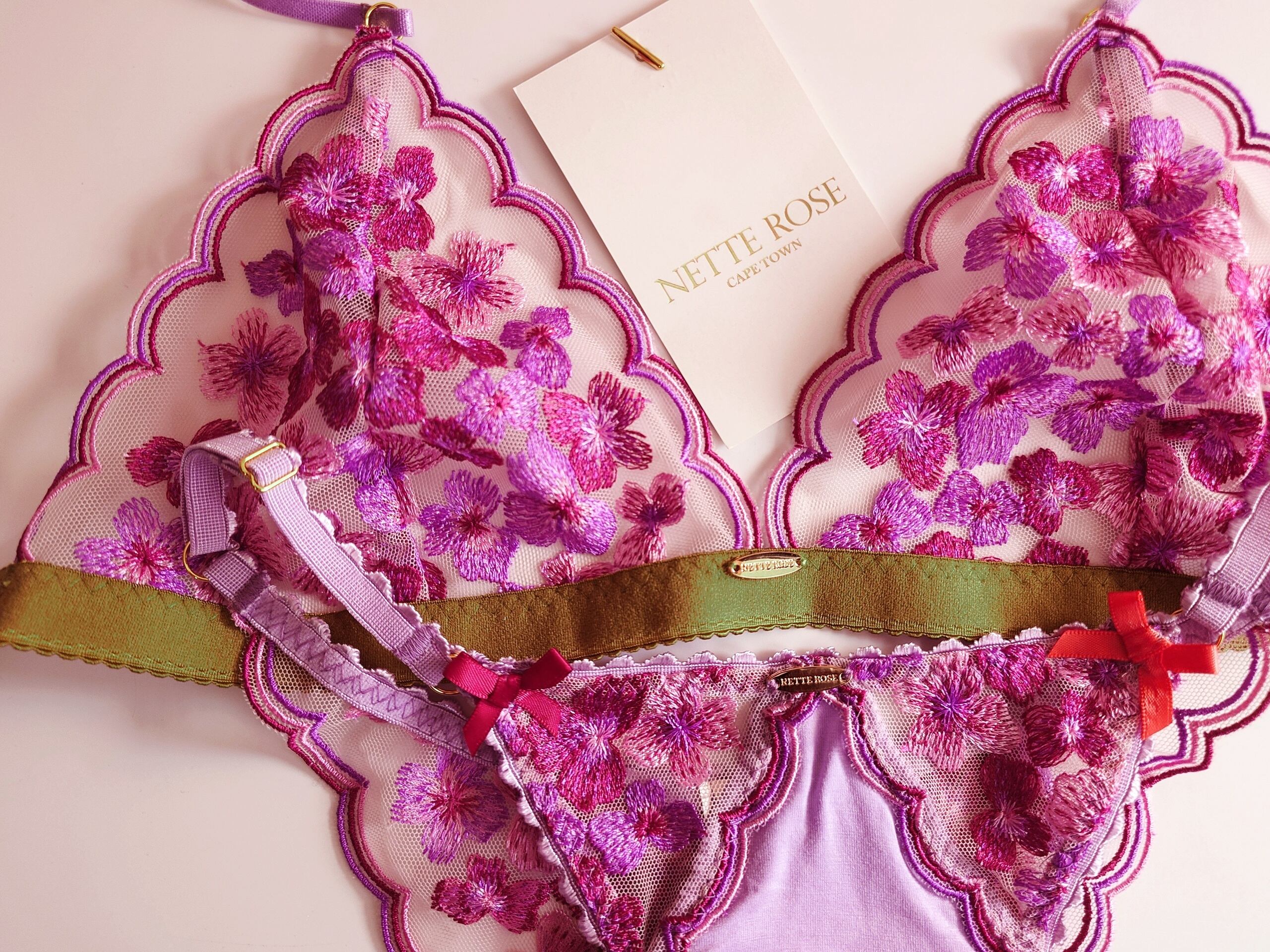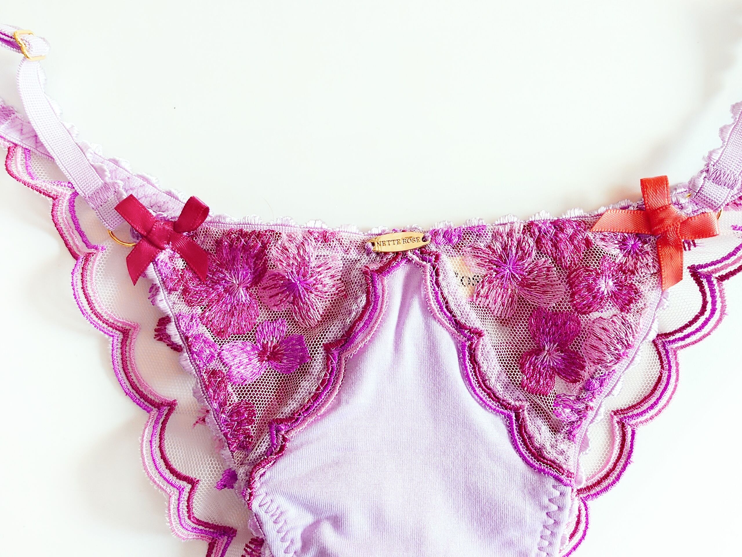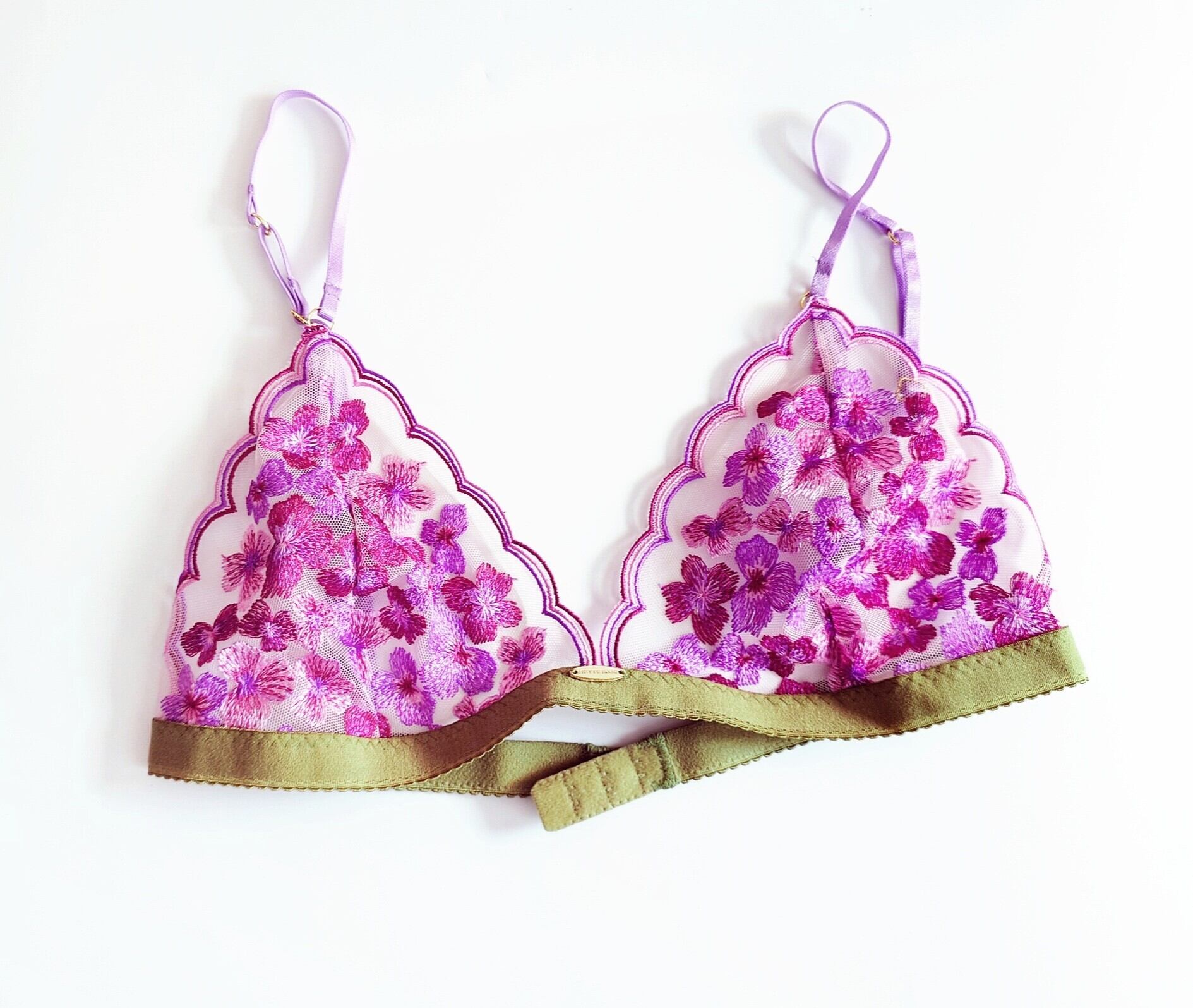 ピンクとライラックとワインカラーのスカラップ&フラワー刺繍のトライアングルブラレット。