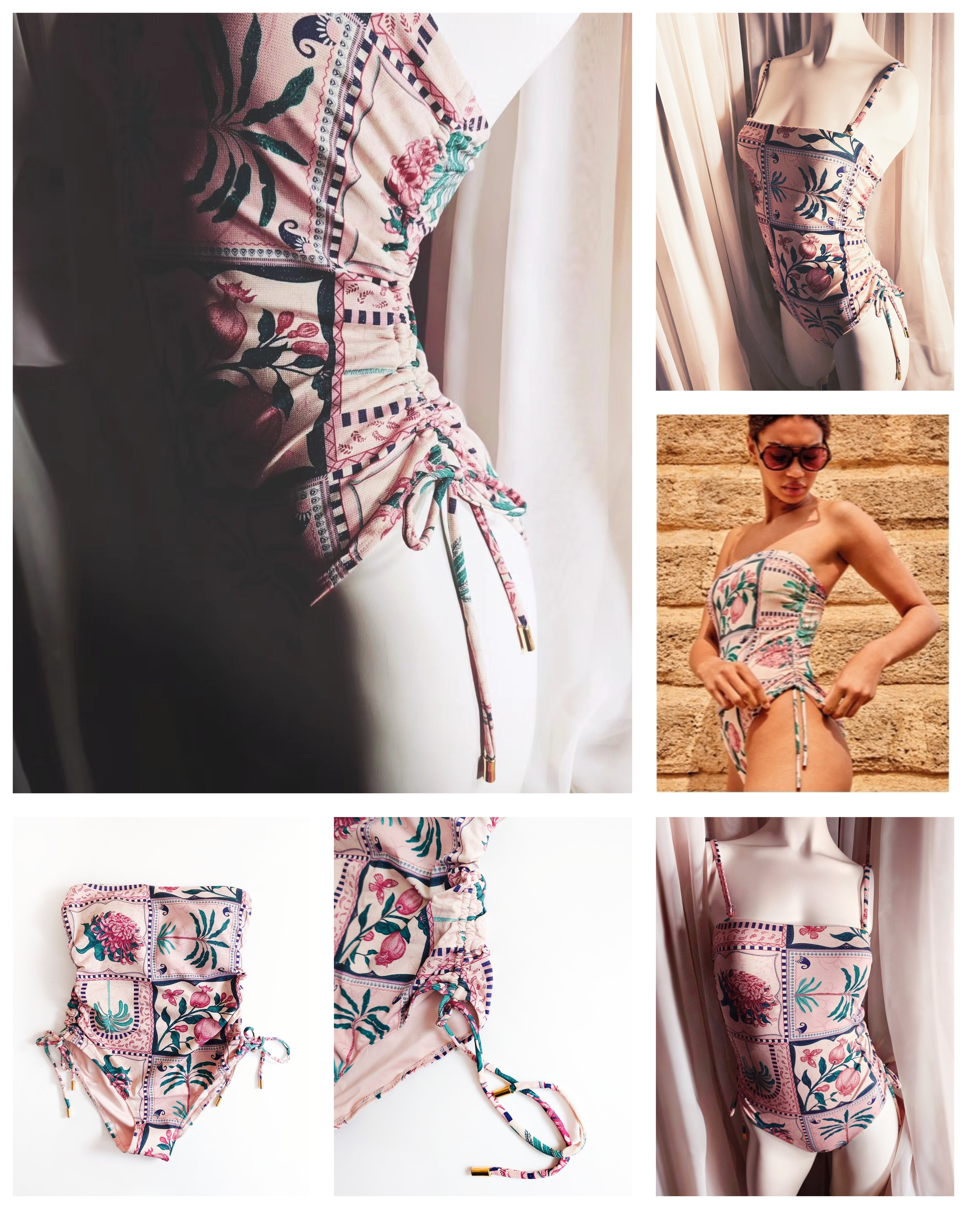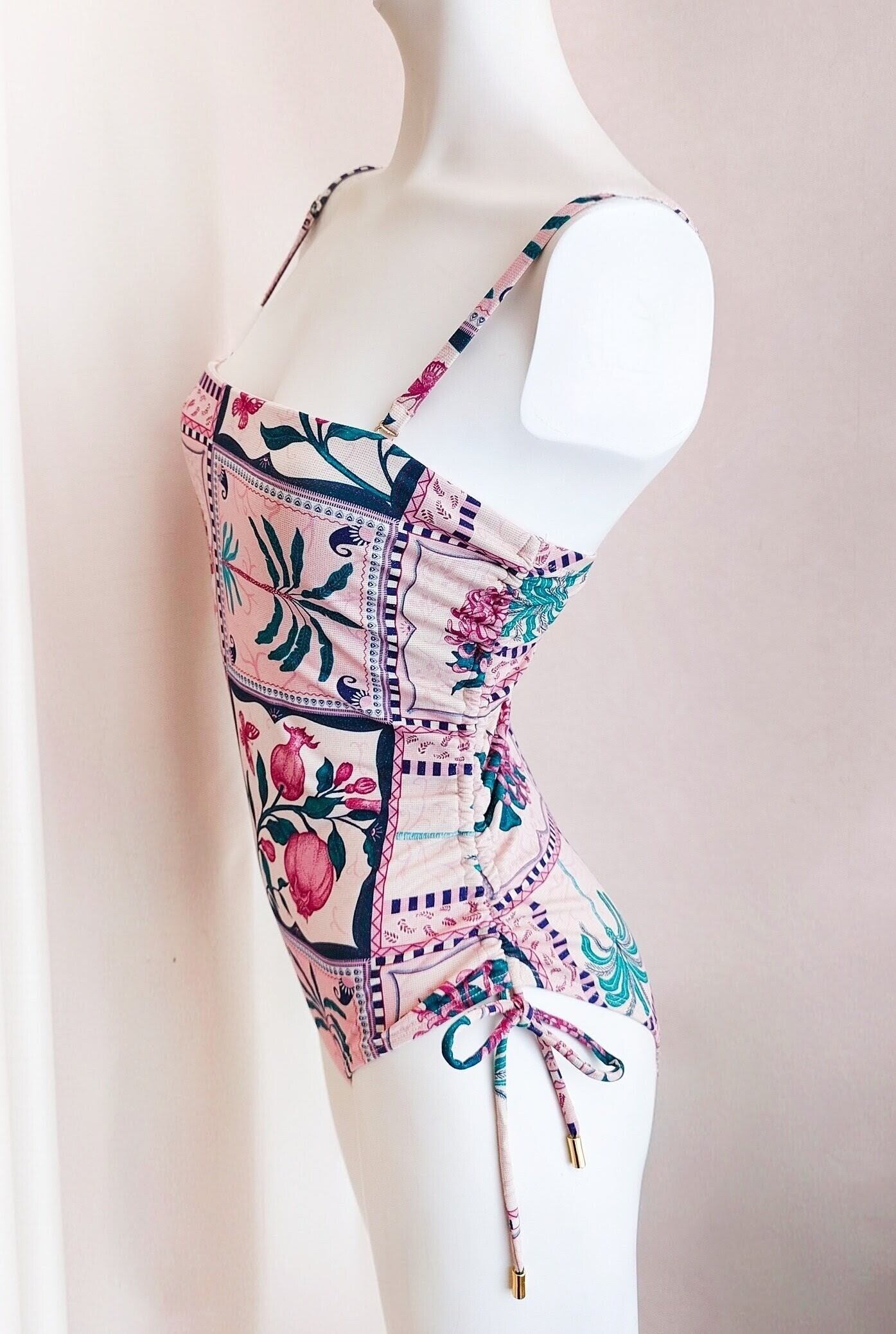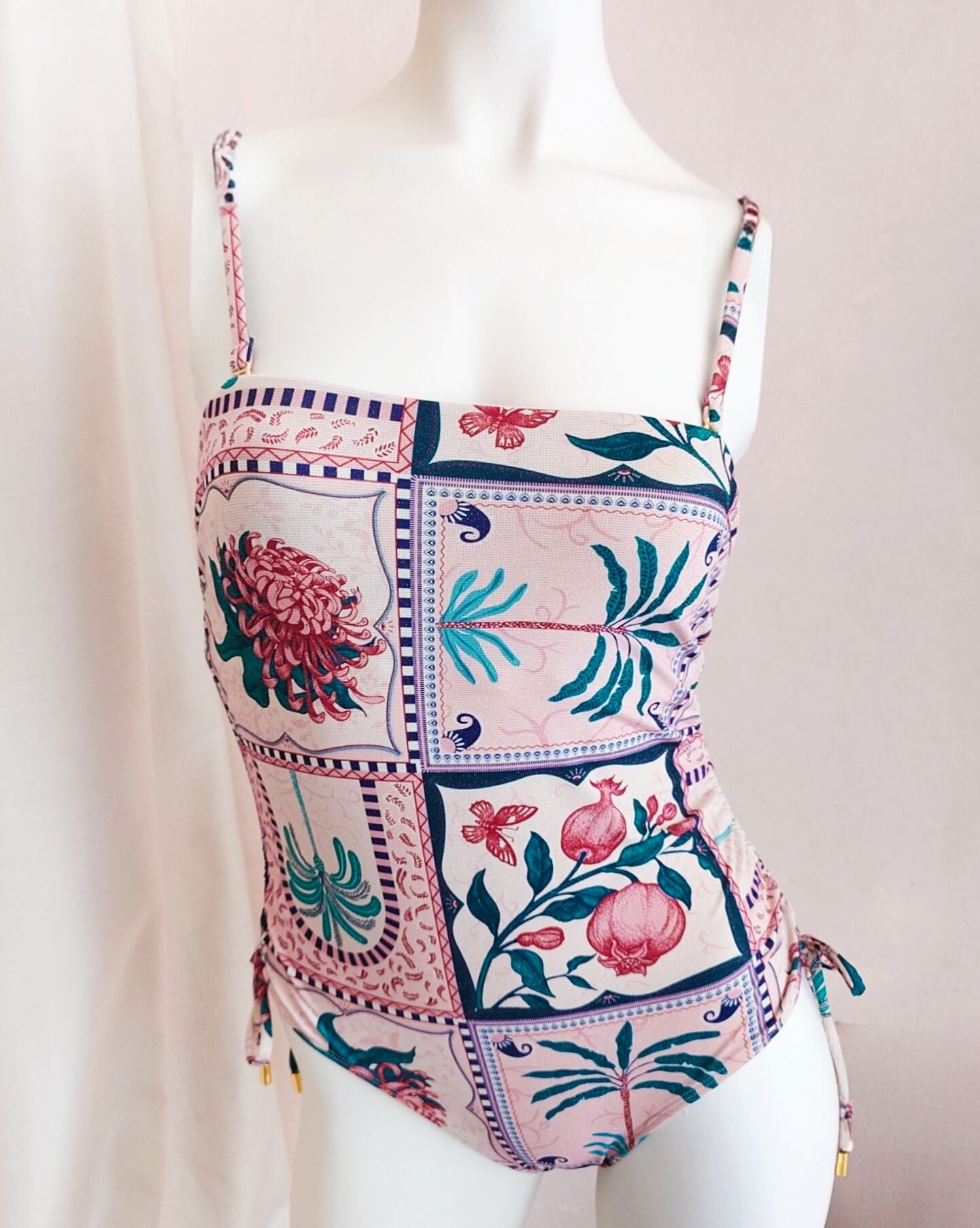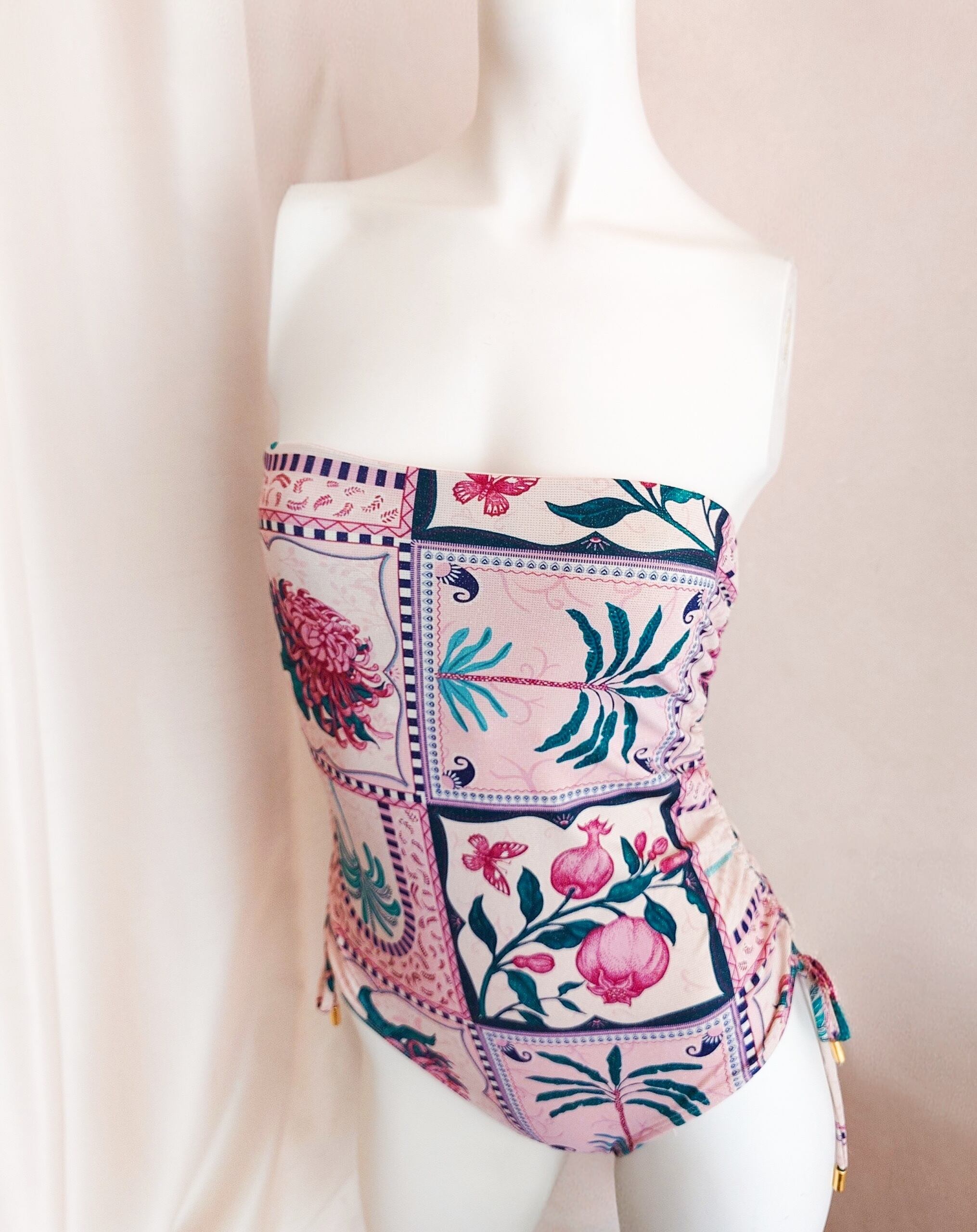 金糸を編み込んだニット生地なので、角度によって小さくきらめくゴールドがエキゾチックな風合いにマッチしたレトロかわいい水着です。