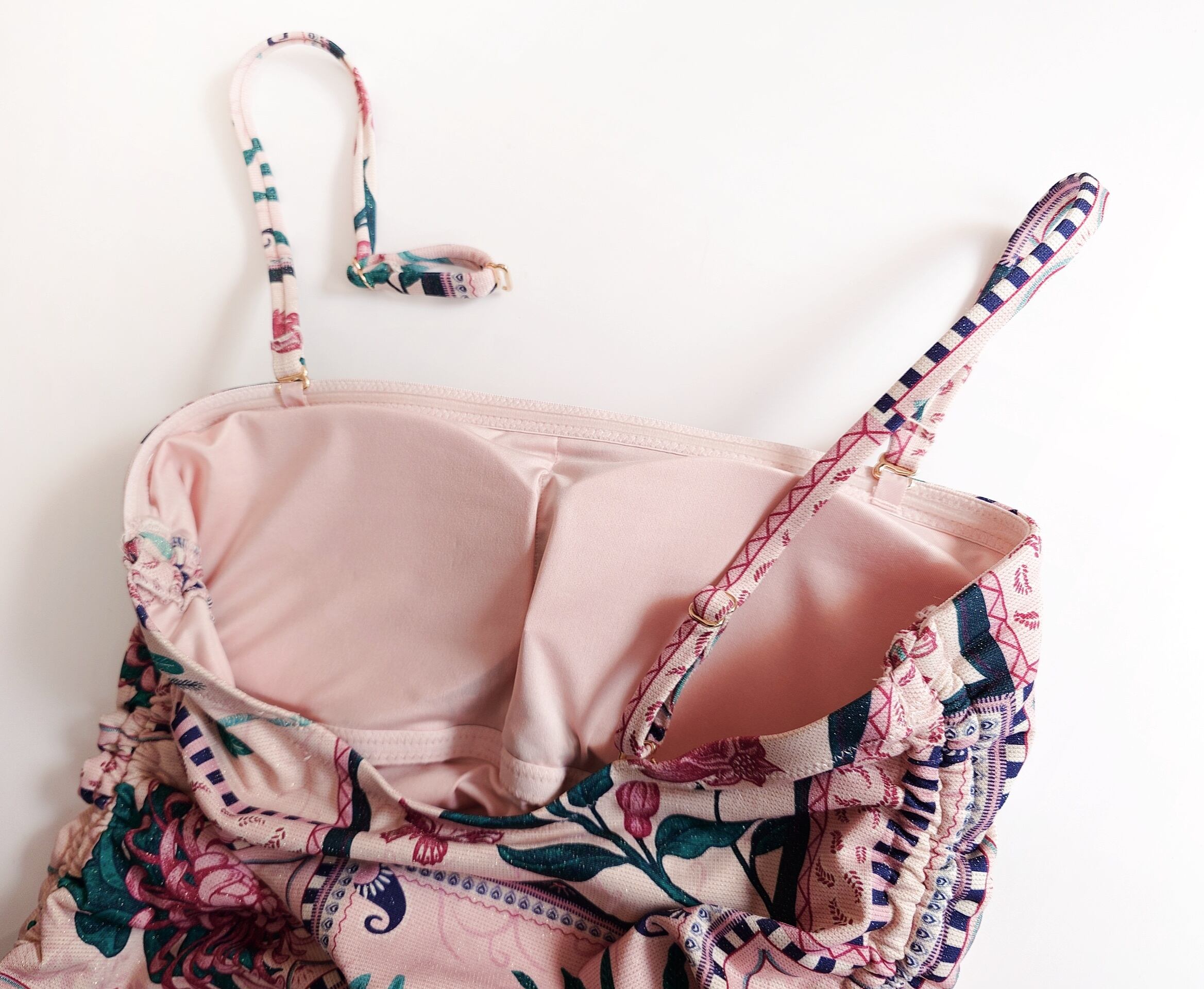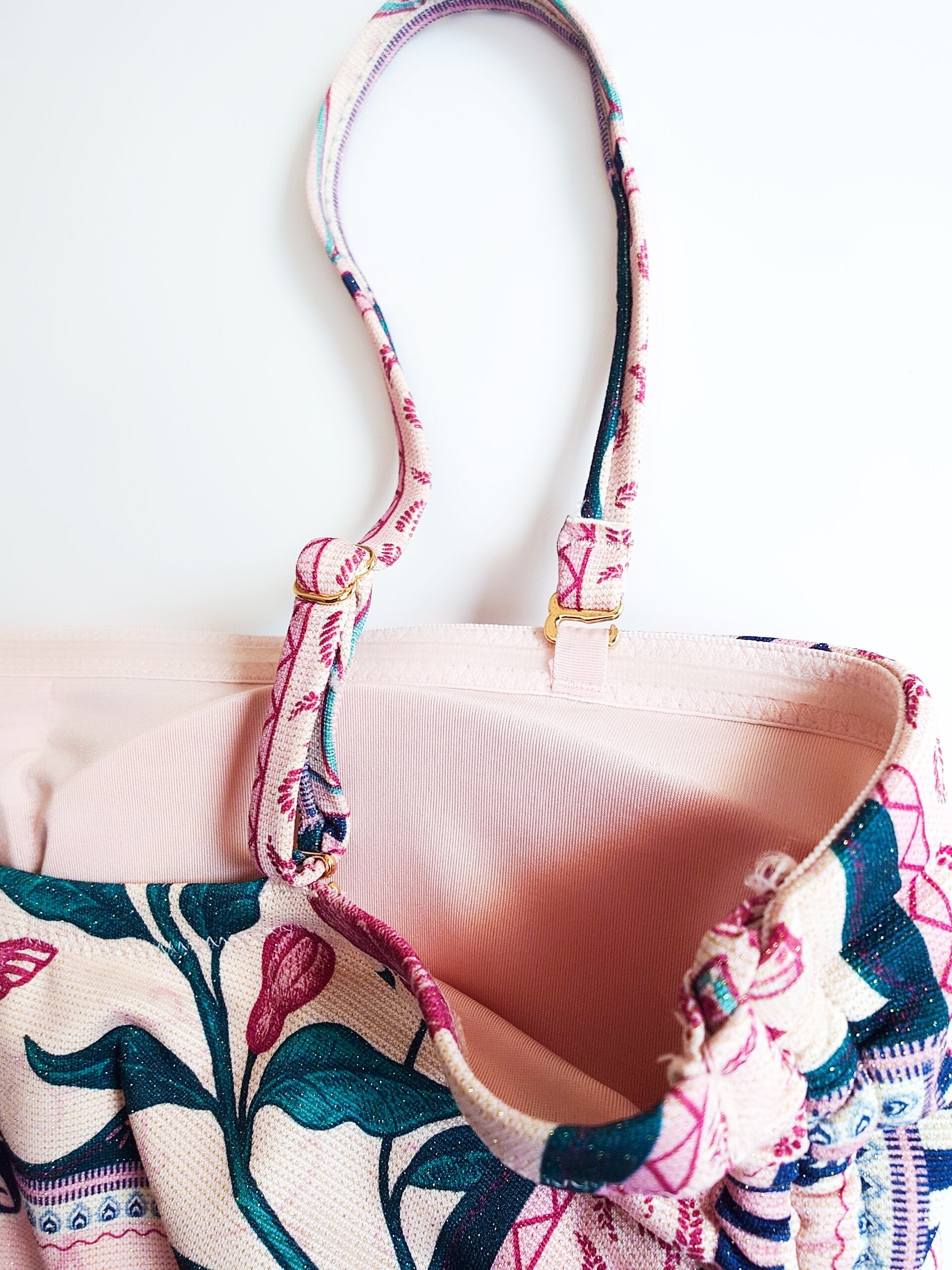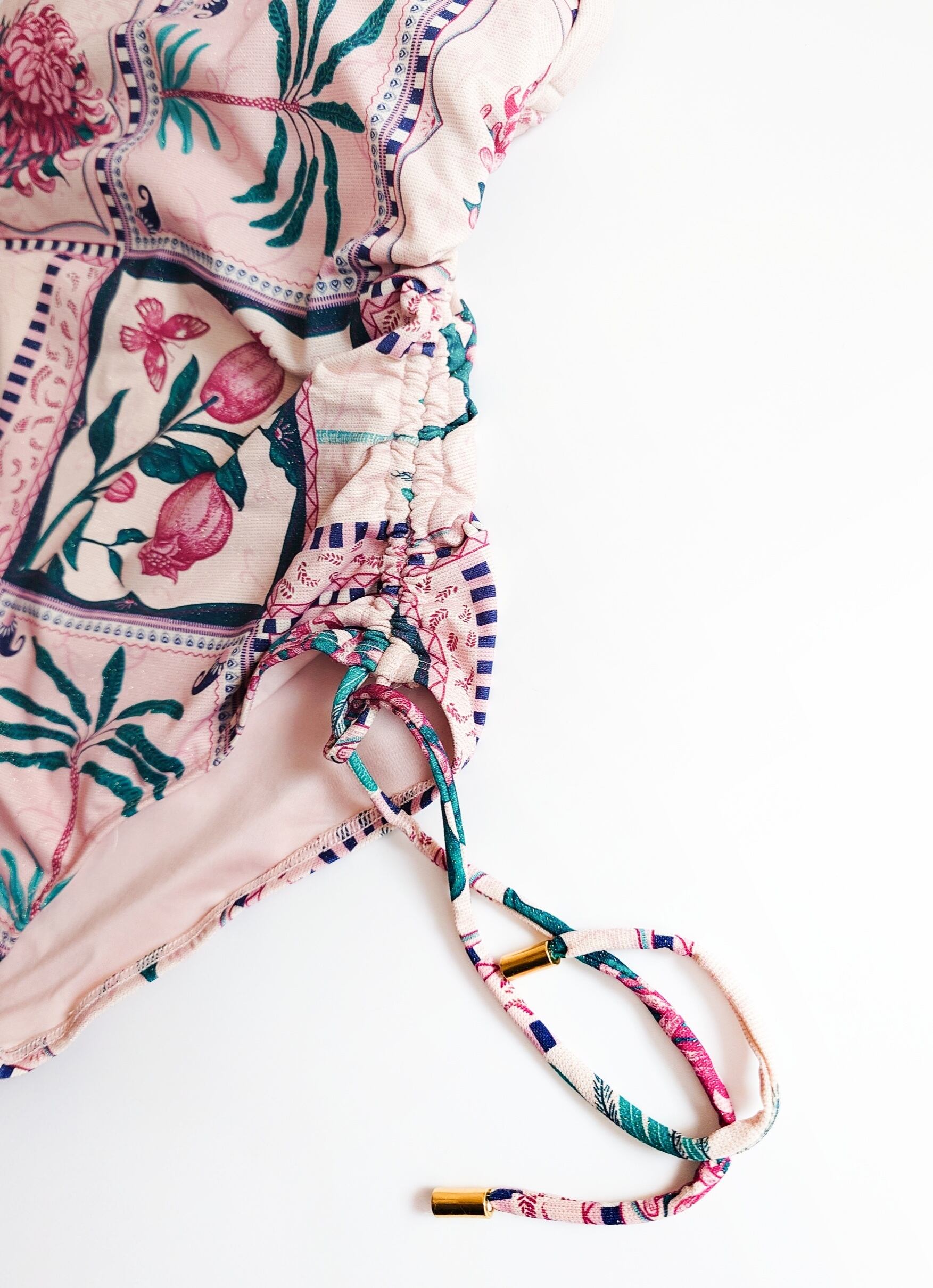 金糸を編み込んだニット生地なので、角度によって小さくきらめくゴールドがエキゾチックな風合いにマッチしたレトロかわいい水着です。