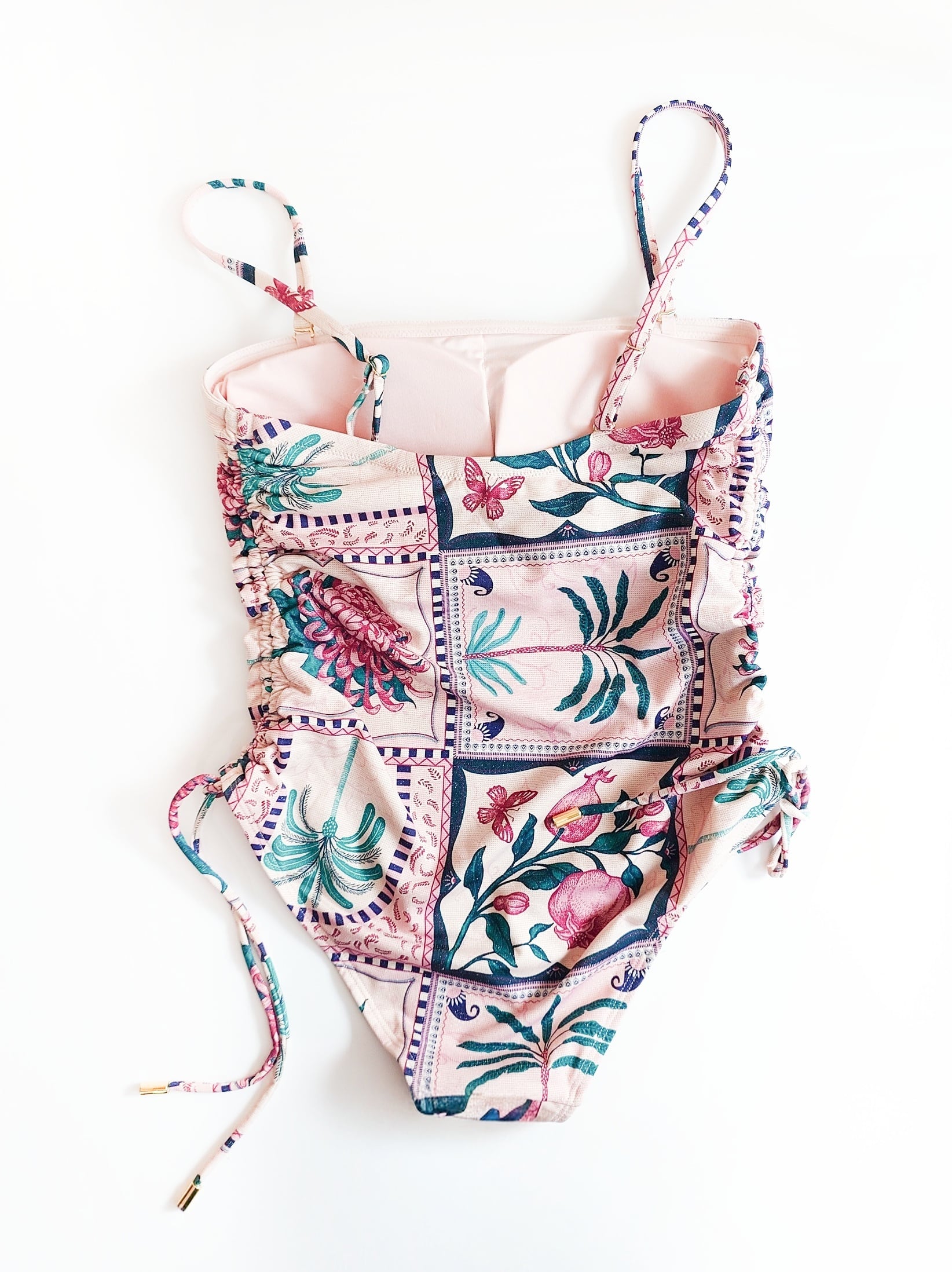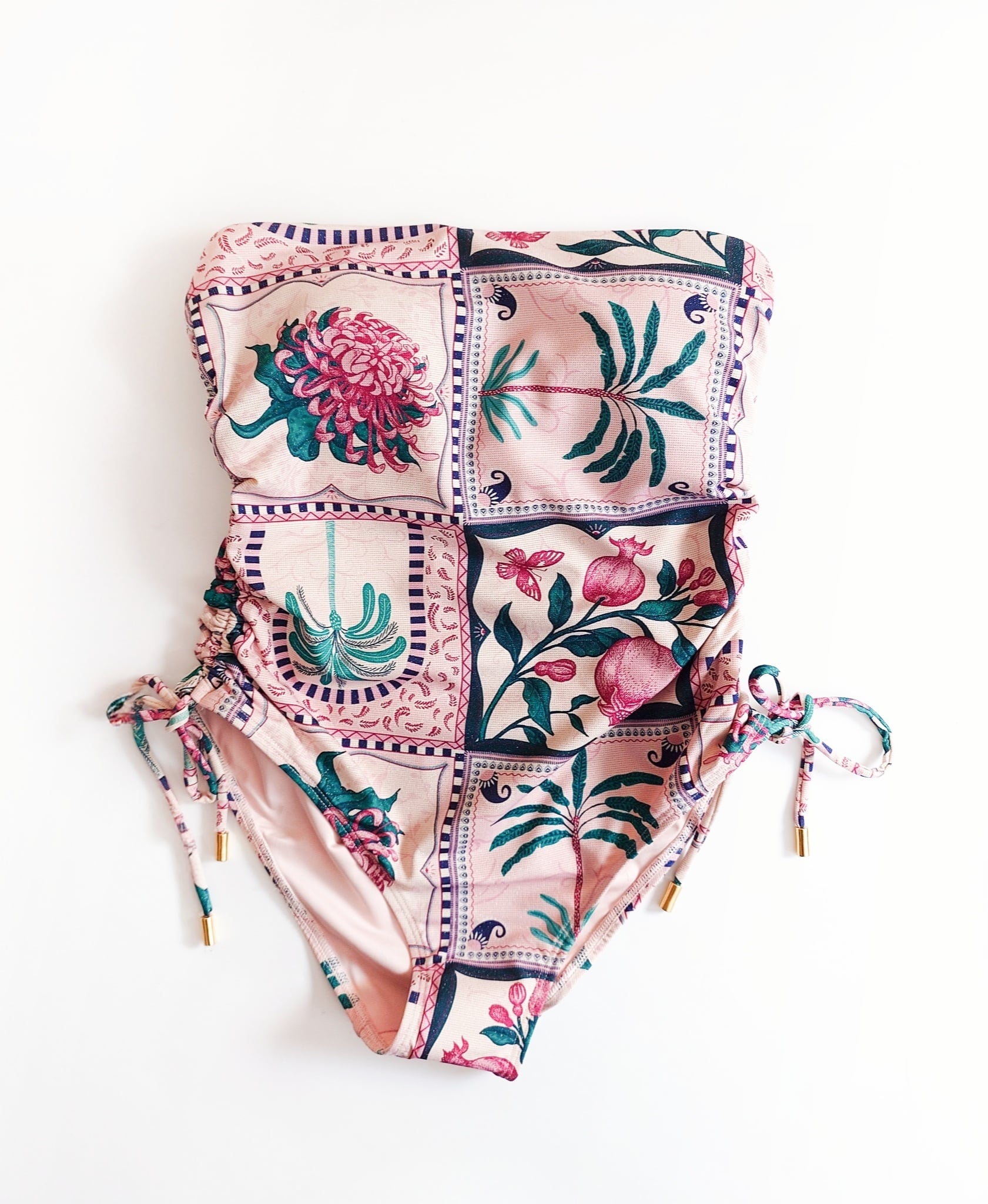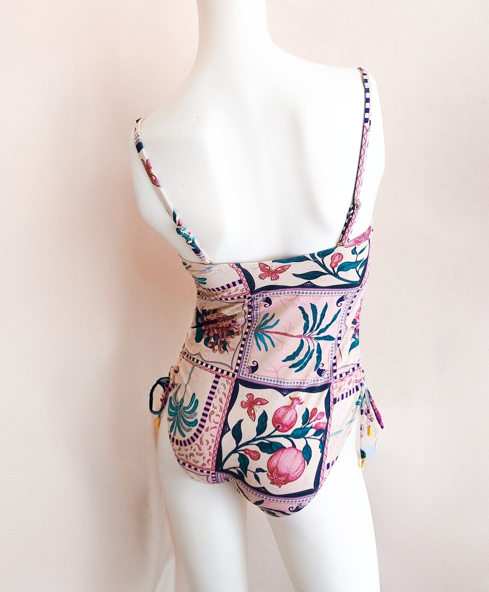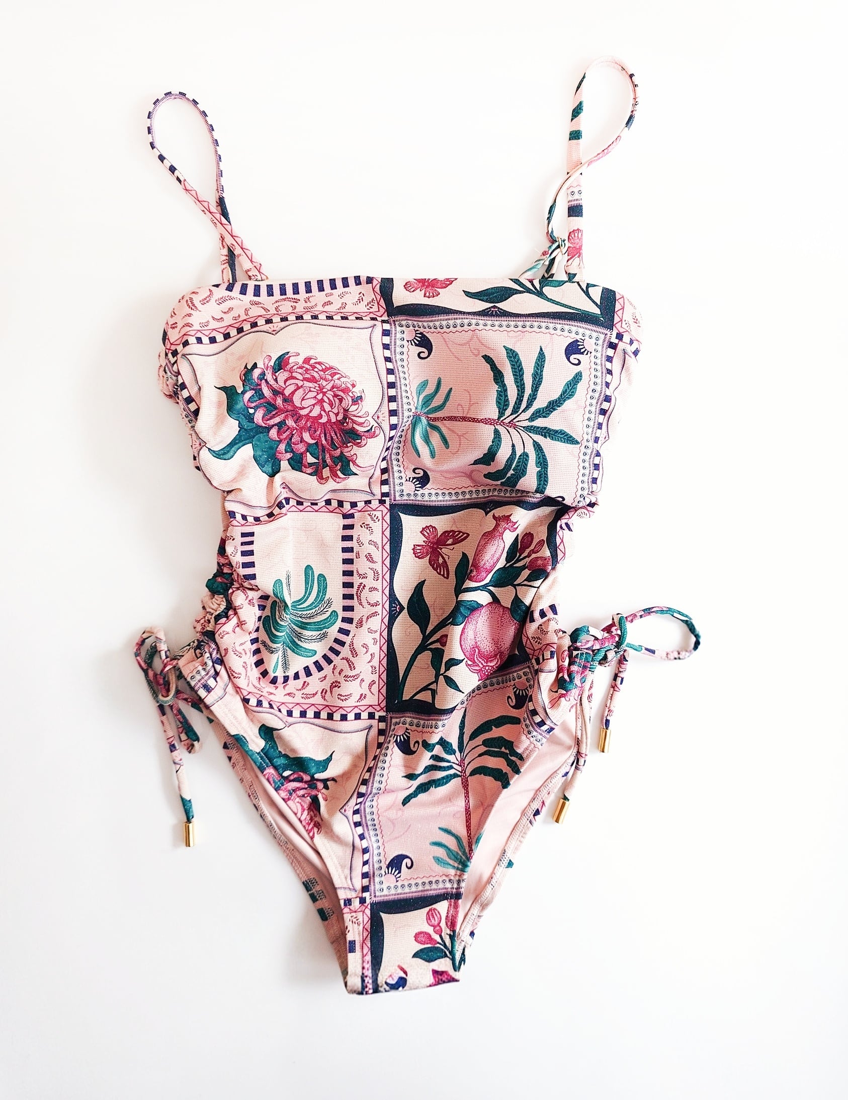 金糸を編み込んだニット生地なので、角度によって小さくきらめくゴールドがエキゾチックな風合いにマッチしたレトロかわいい水着です。