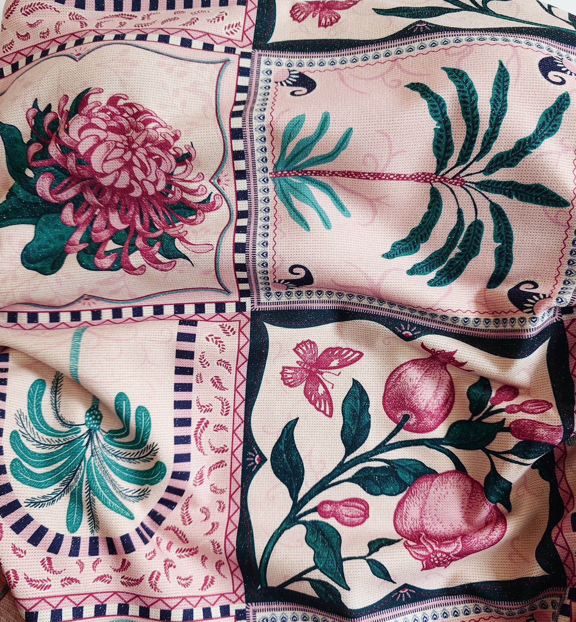 スモーキーピンクとグリーンのパッチワーク風ボタニカルプリント柄