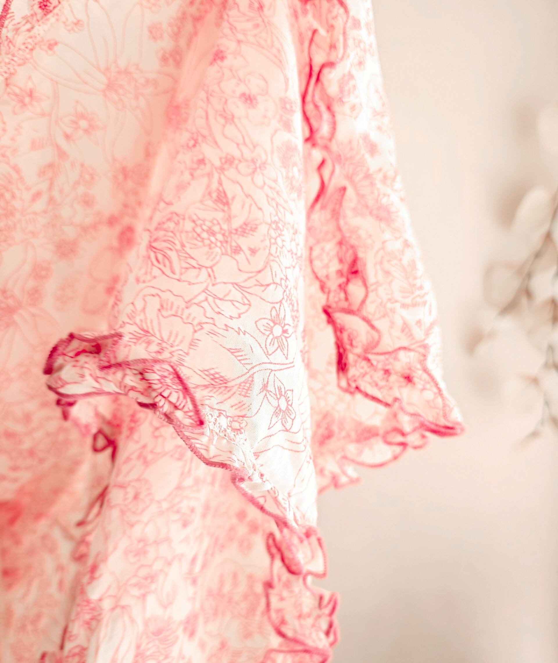 ふんわりとした軽やかな生成り色のモスリン生地にコーラルピンクで緻密なボタニカル柄がプリントされています。