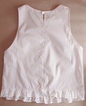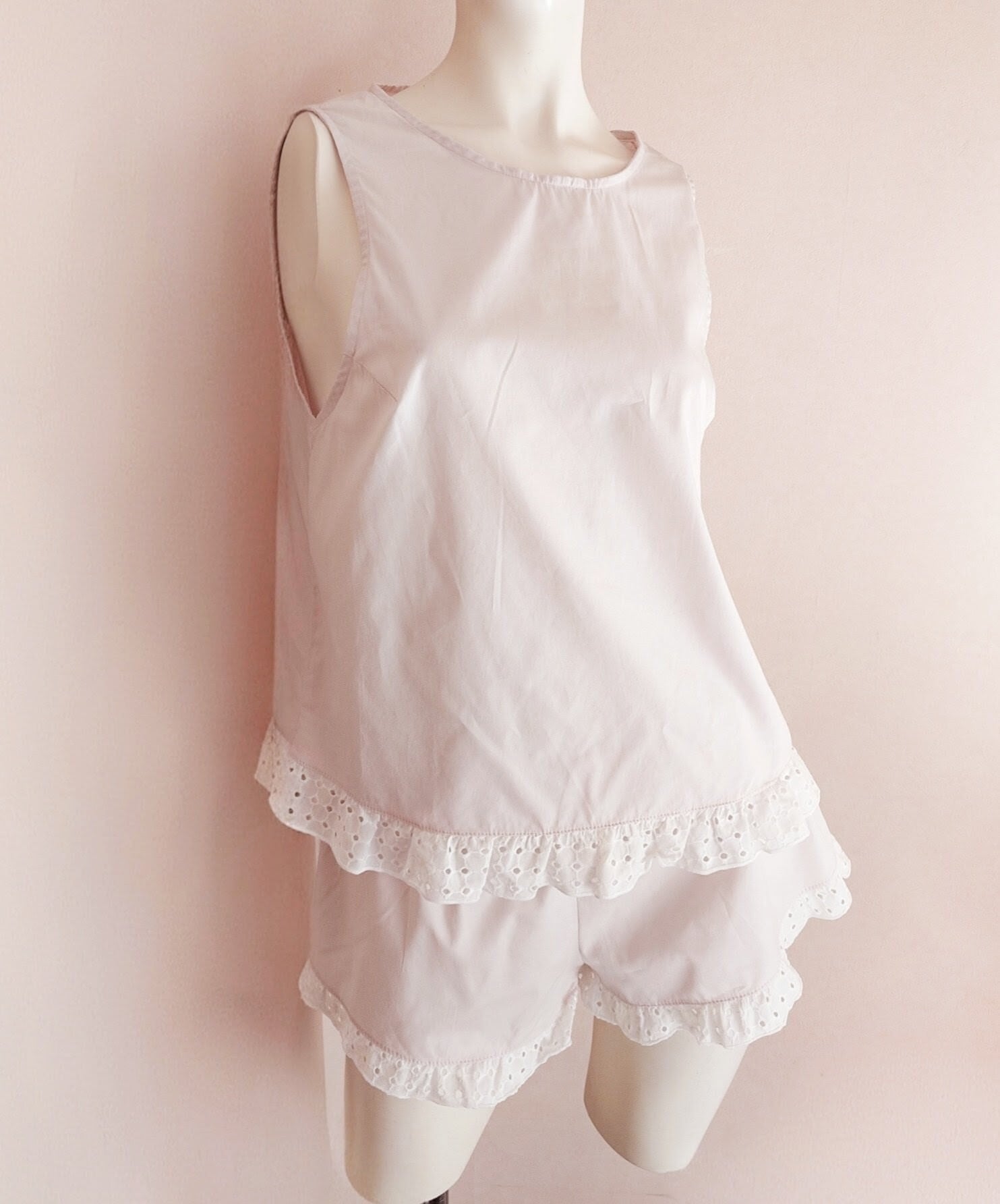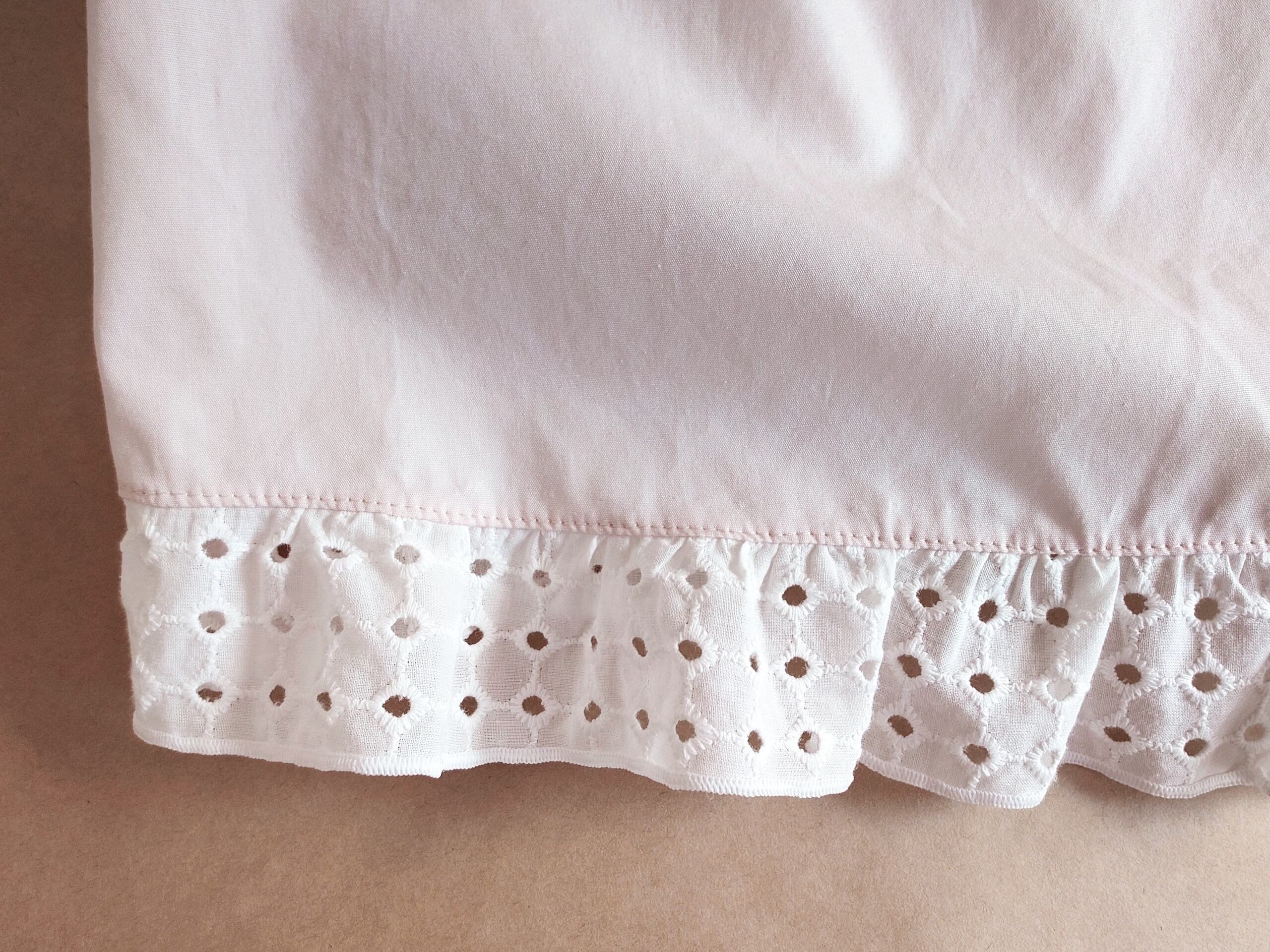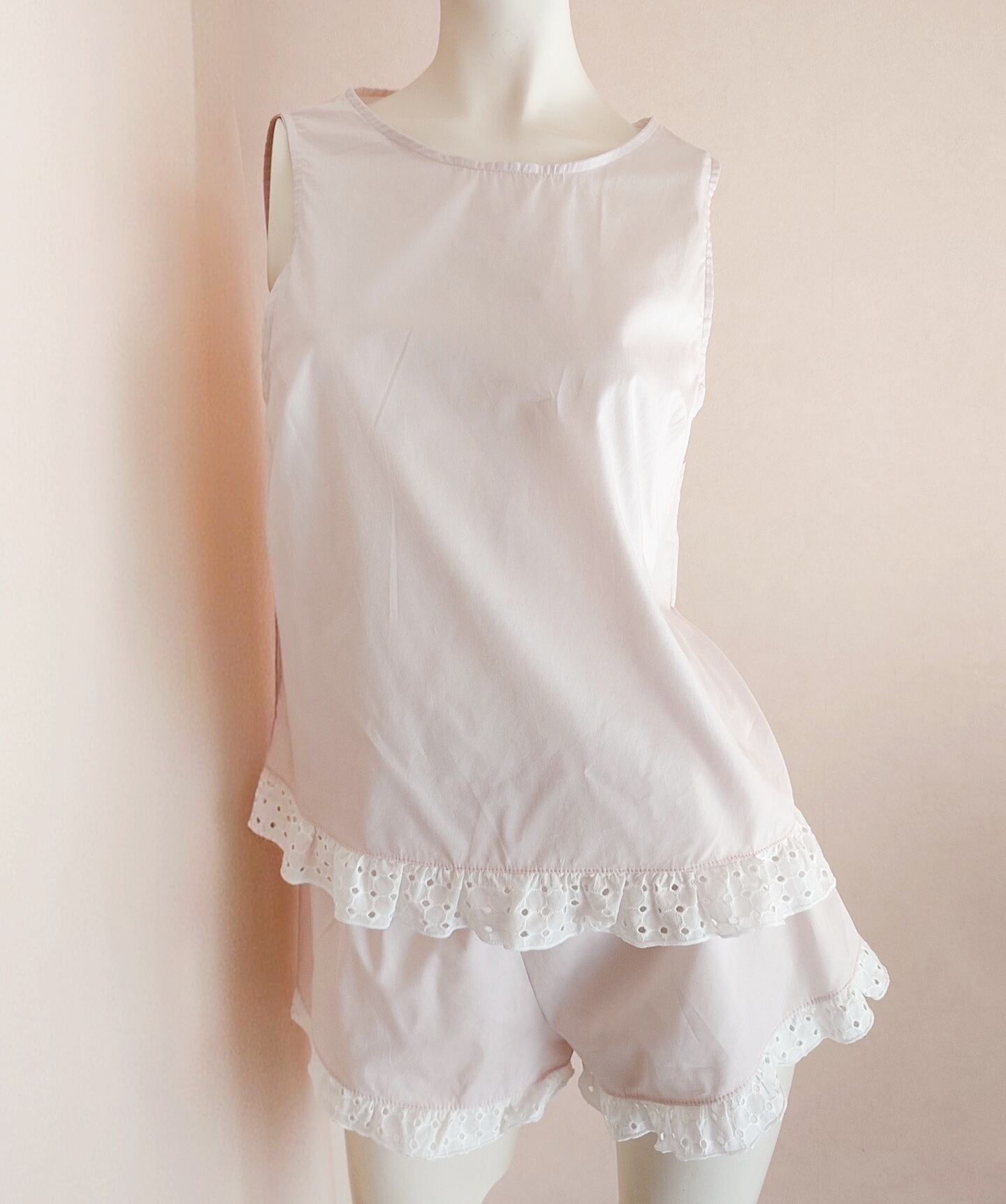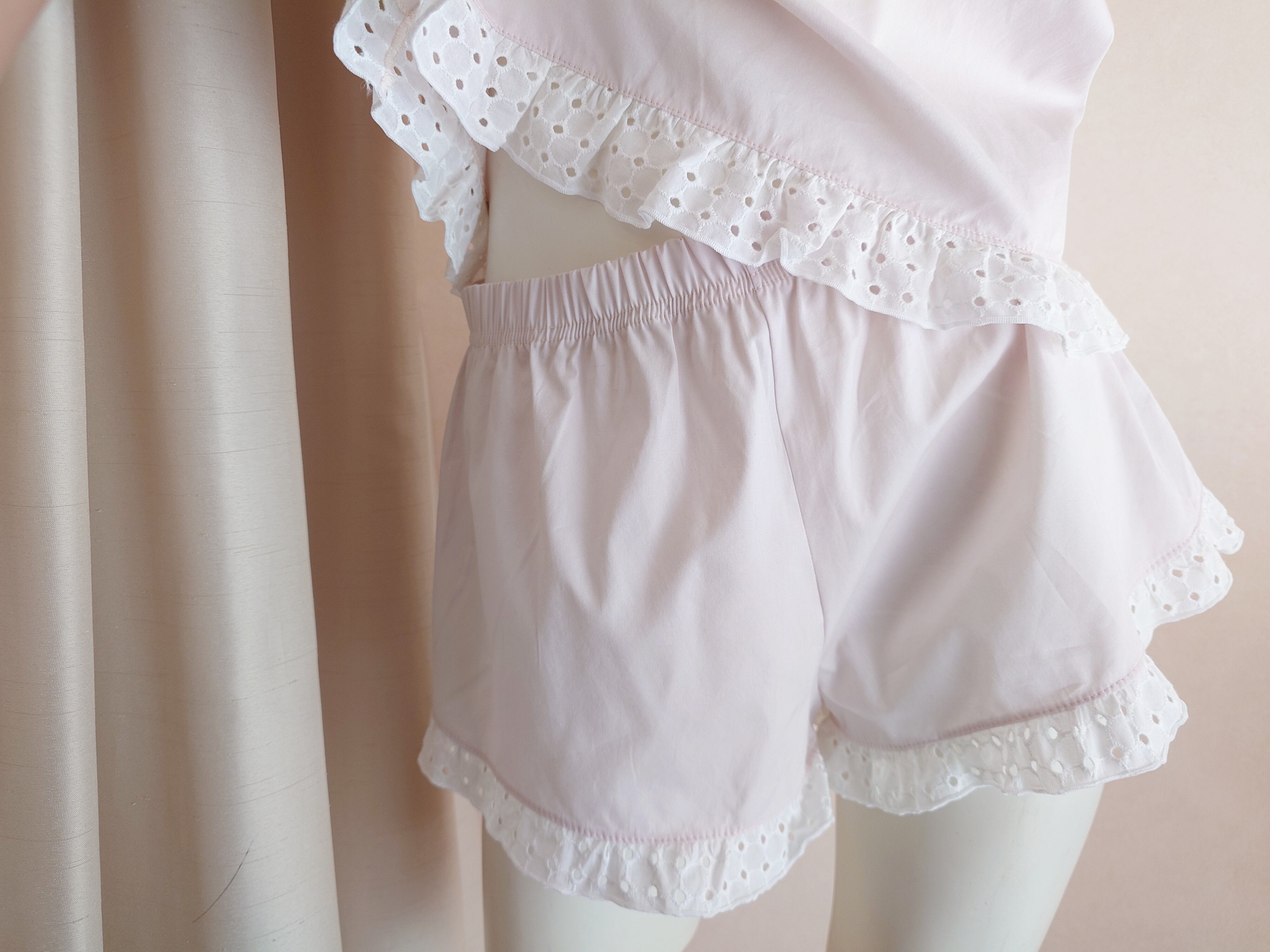 うすピンク色のコットン100%生地の裾にぐるりとホワイトのボーラーレースをあしらった、まさにGlassa(イタリア語でお砂糖のアイシング)のようなセットアップ。
