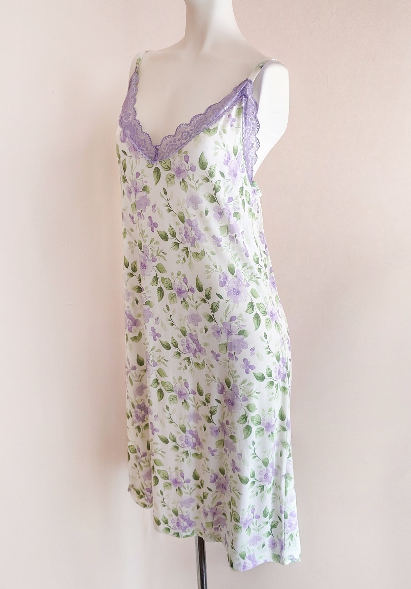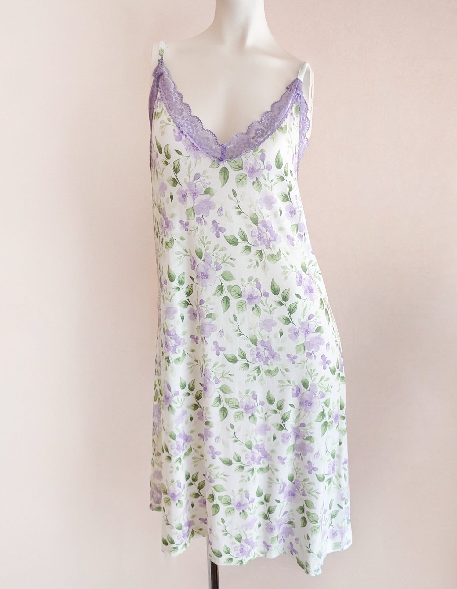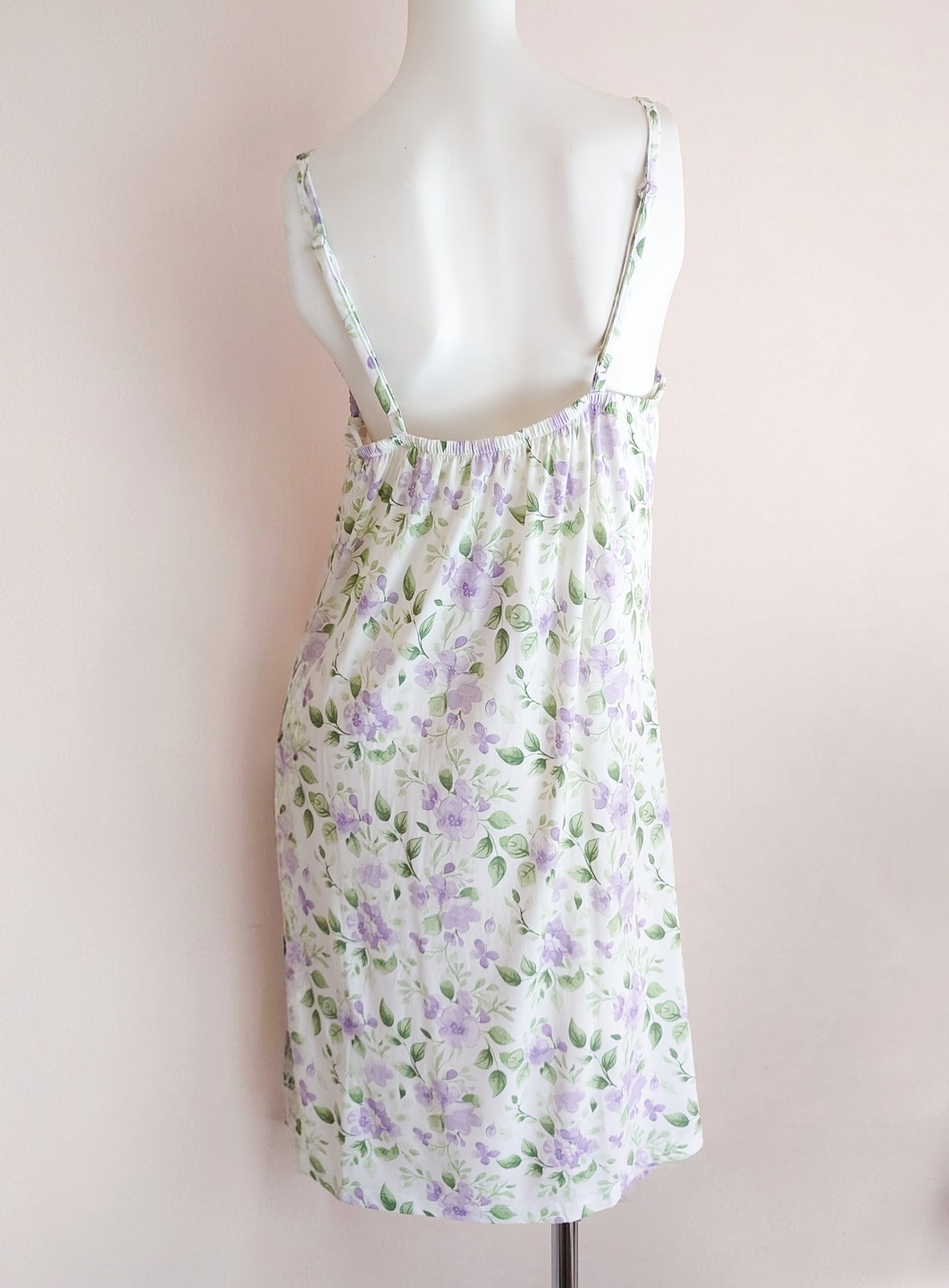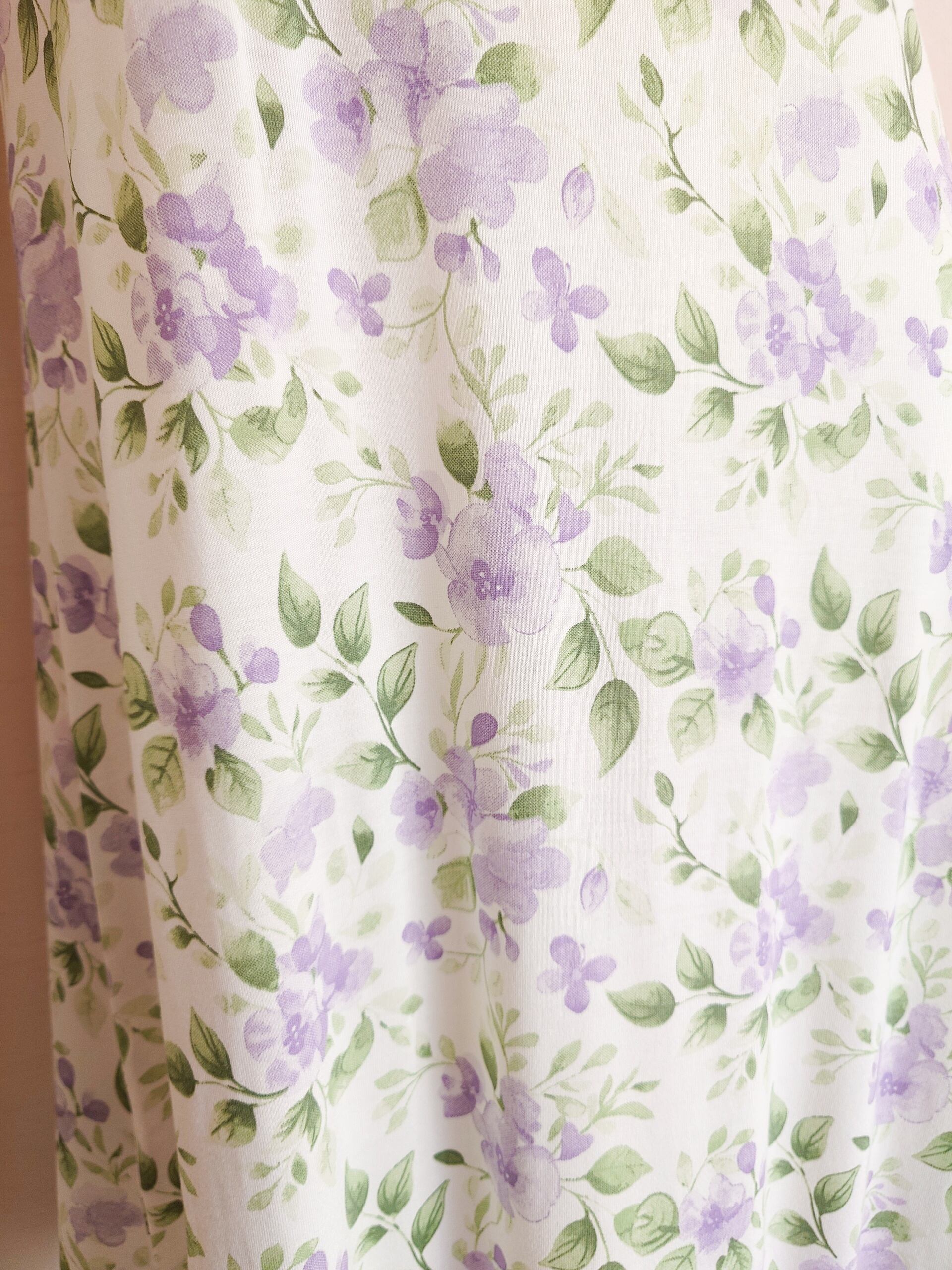 てろん、と落ち感のあるアイボリー色のレーヨン生地にスミレがプリントされたナイトドレス。