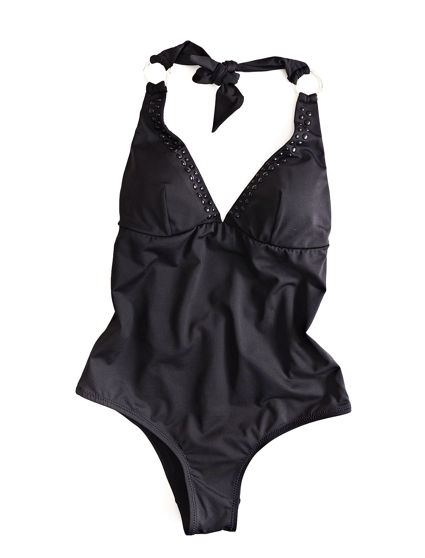 胸元にマットな質感のブラックスタッズをあしらったシンプルなワンピース水着。