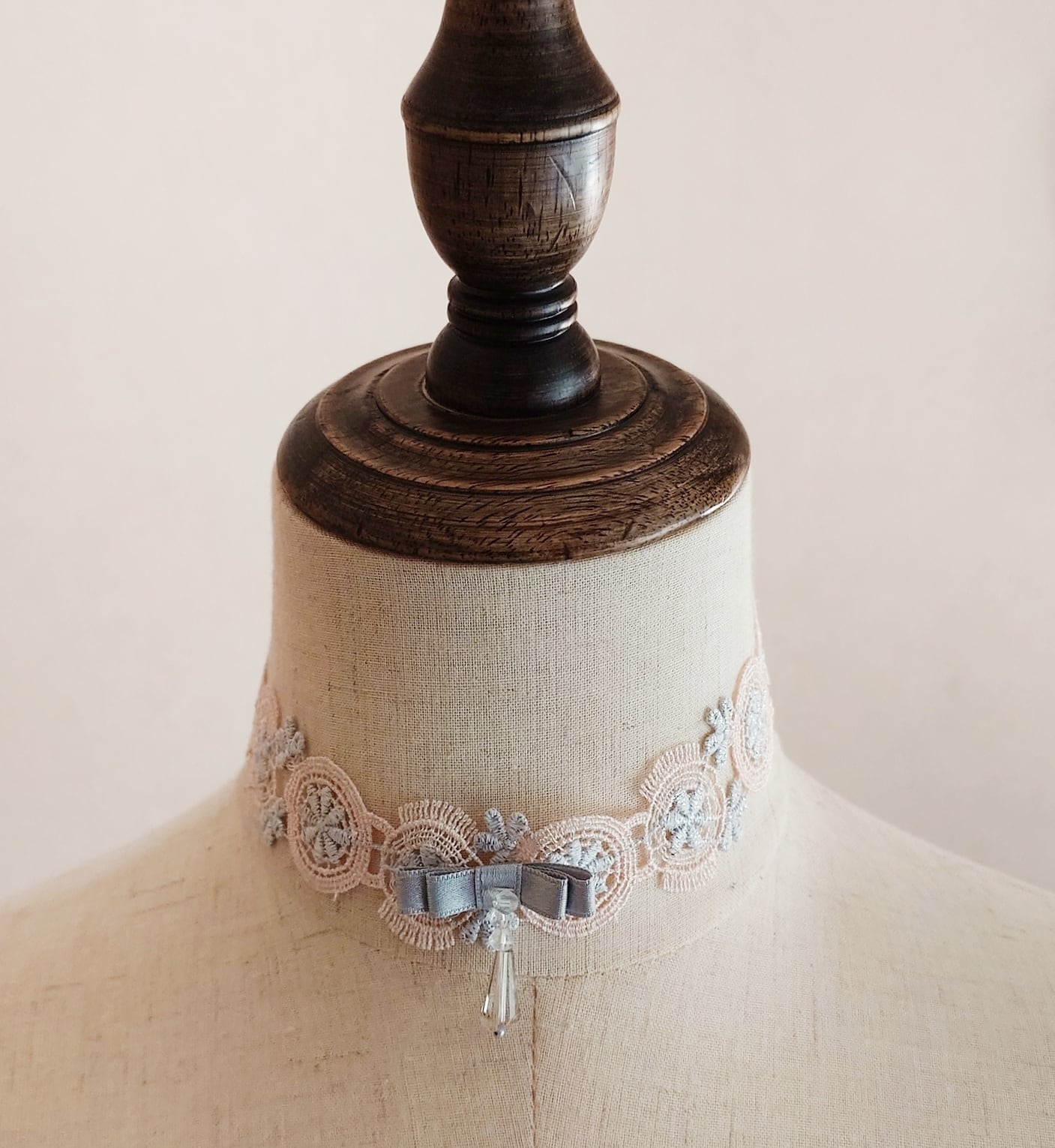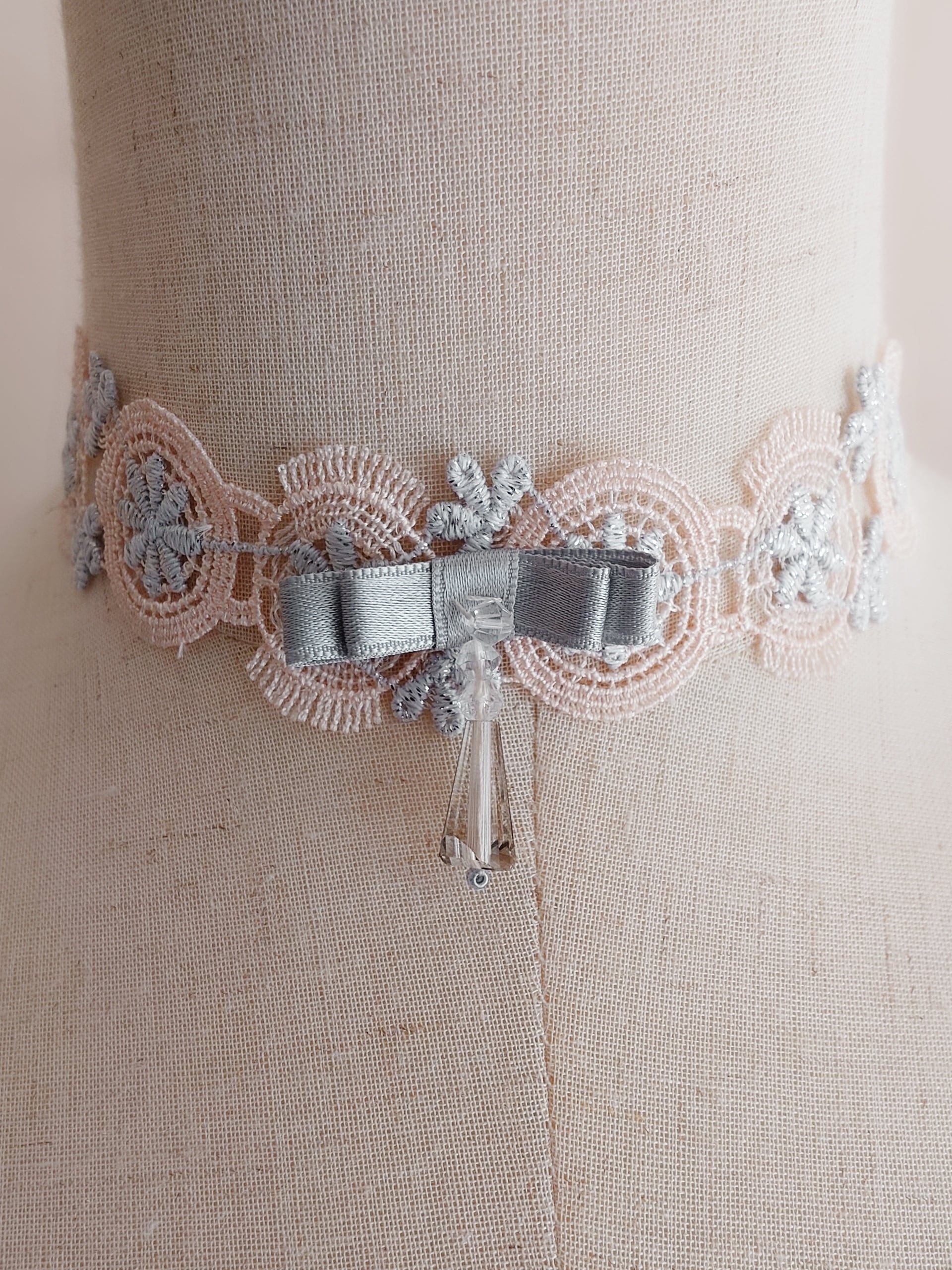 Petal Pinkと銀糸入りSilver Greyの刺繍レースでぐるりと首を飾ります。