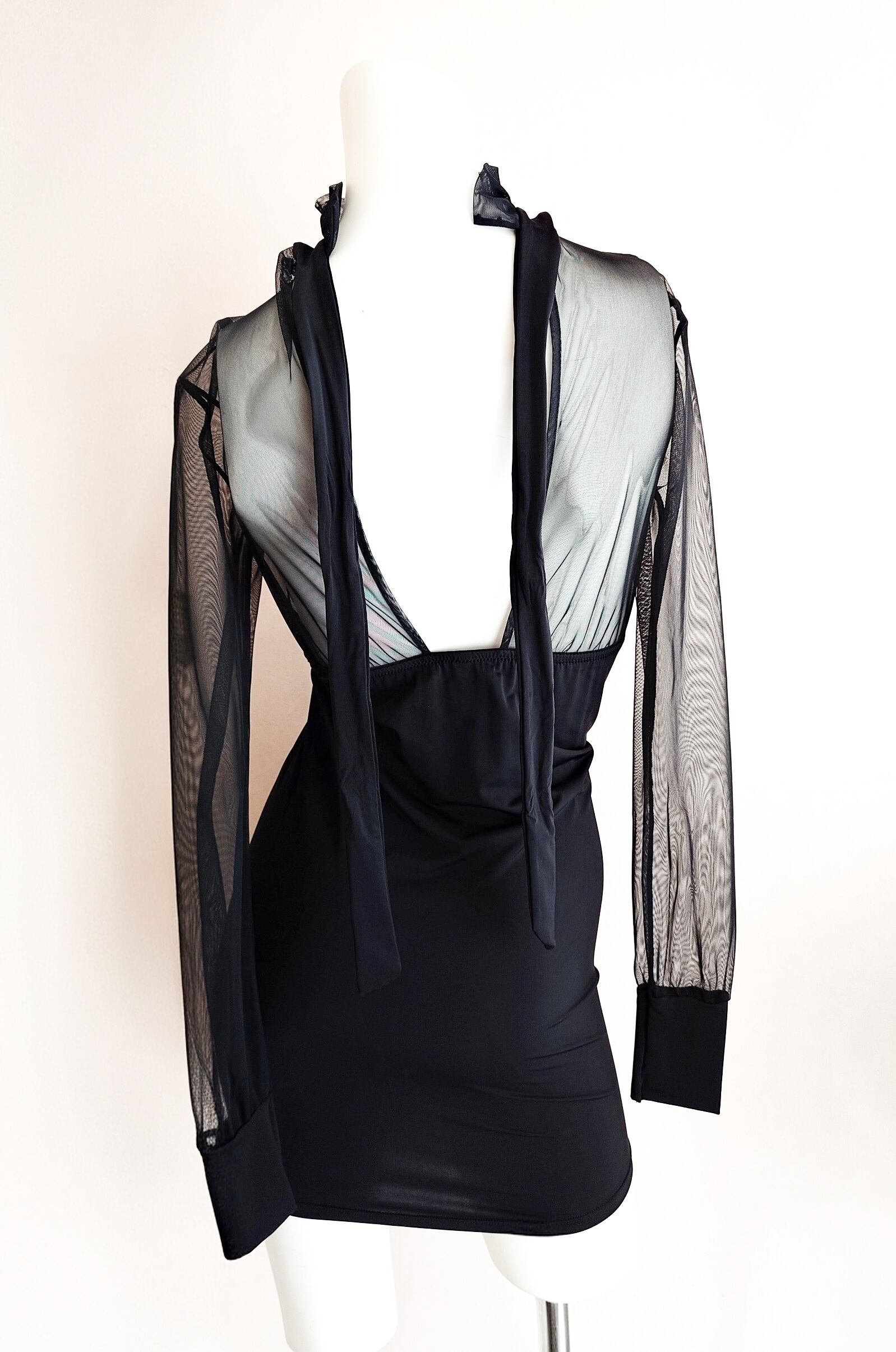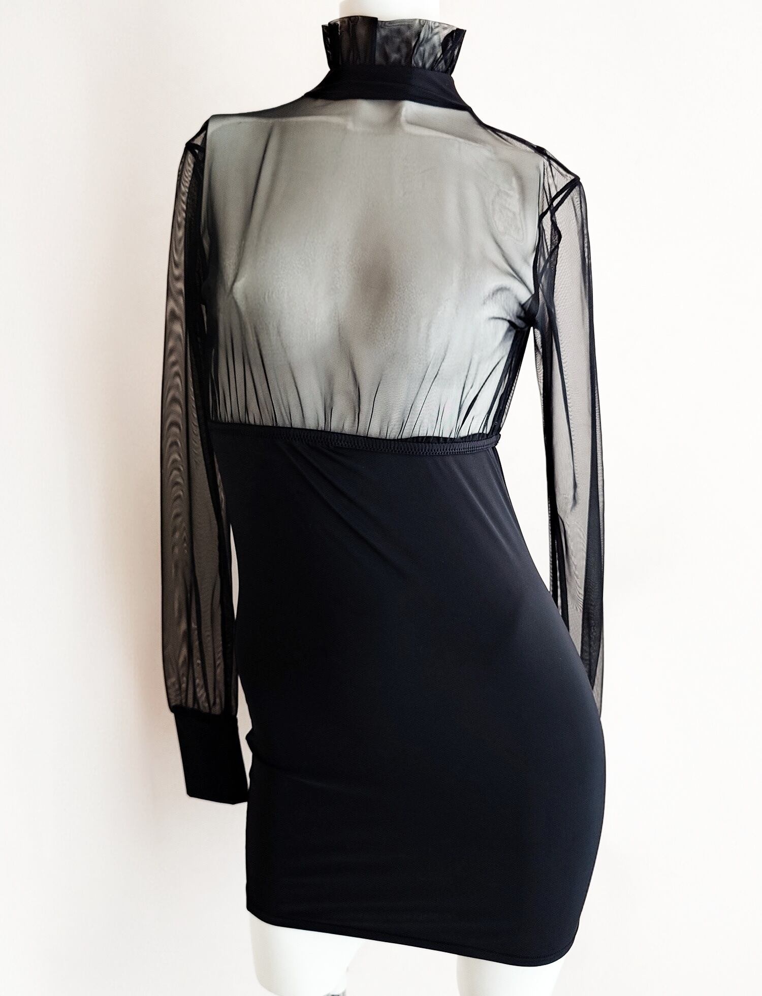 シアーなチュールネットとマットなストレッチ生地の異素材切り替えドレス。
