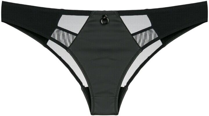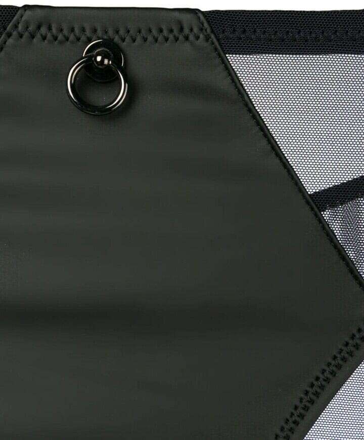 ツヤ消しレザーのような風合いのマットな生地と透け感のあるメッシュを組み合わせた異素材切り替えデザインショーツ。