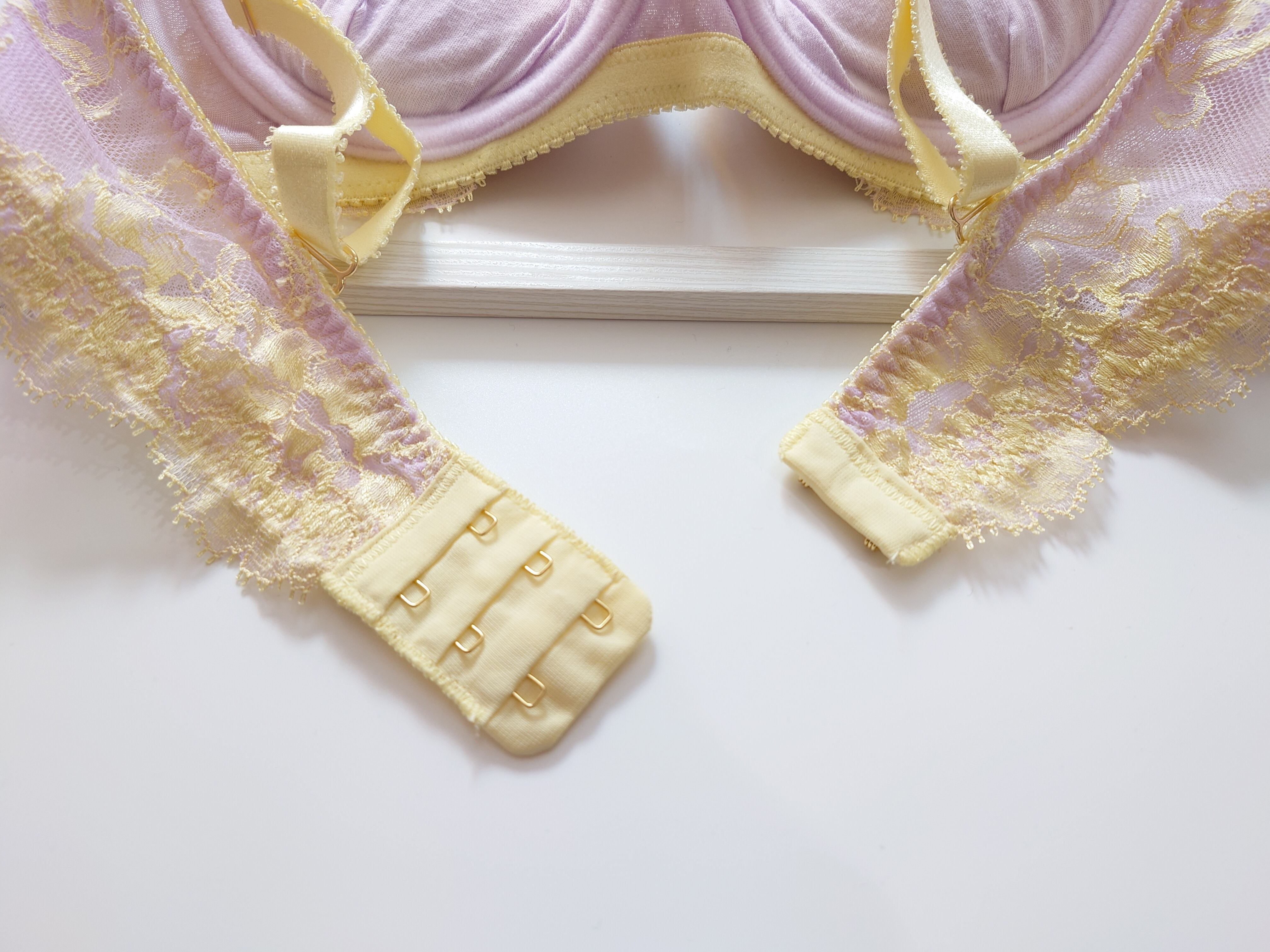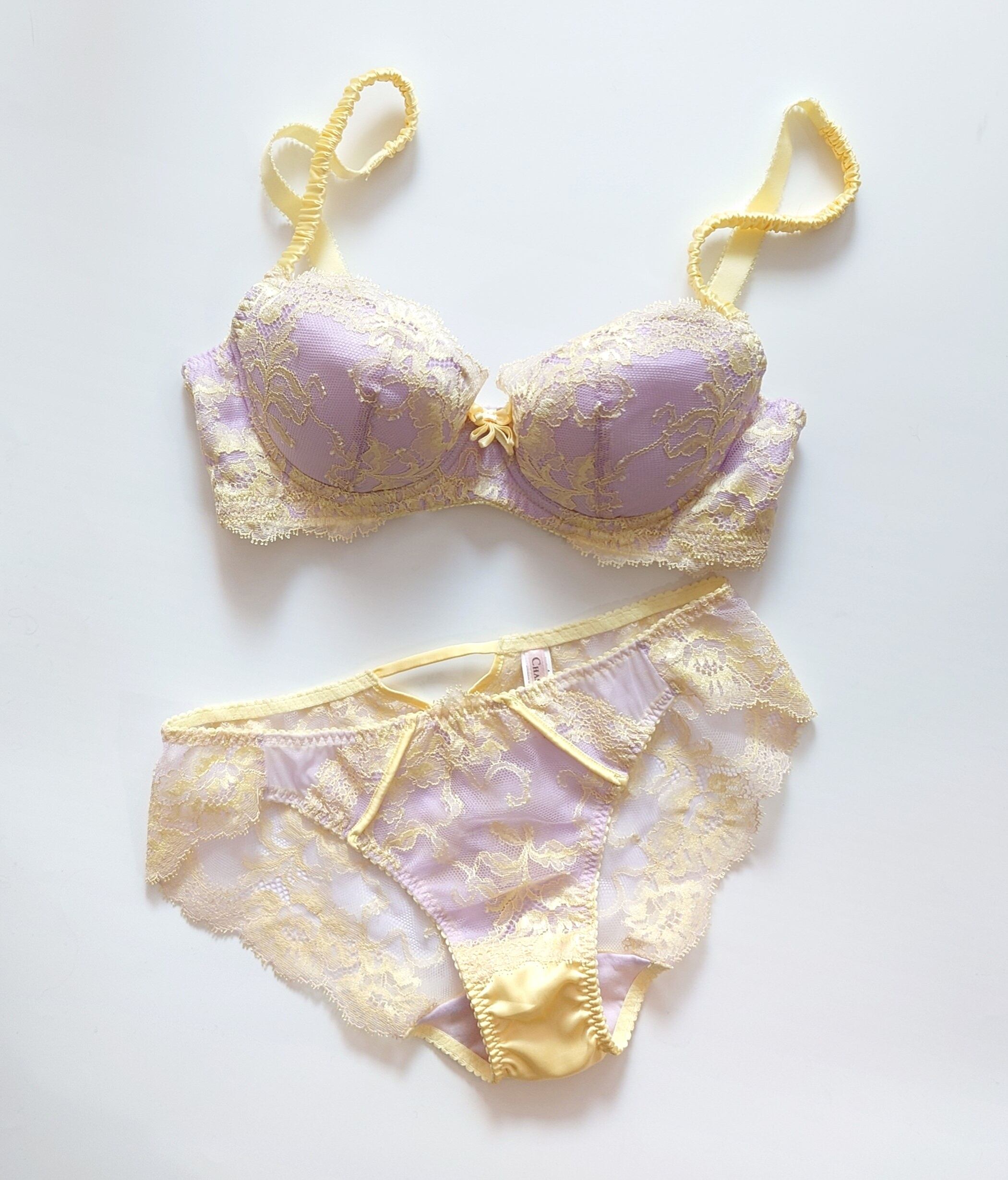 LILACはうすいむらさきをベースに、ストラップとレースの差し色はレモンイエローで明るくハッピーな配色。