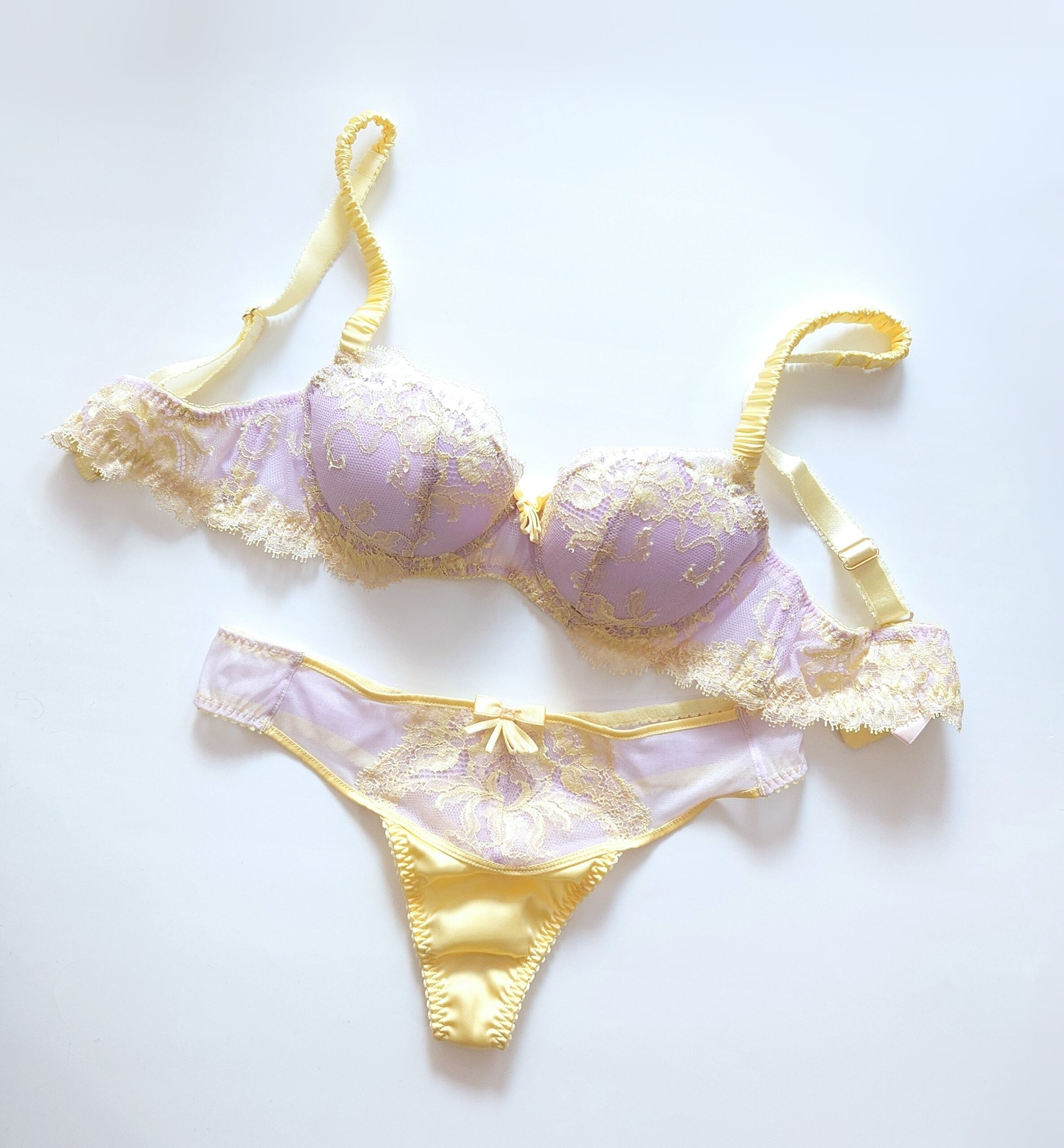 LILACはうすいむらさきをベースに、ストラップとレースの差し色はレモンイエローで明るくハッピーな配色。