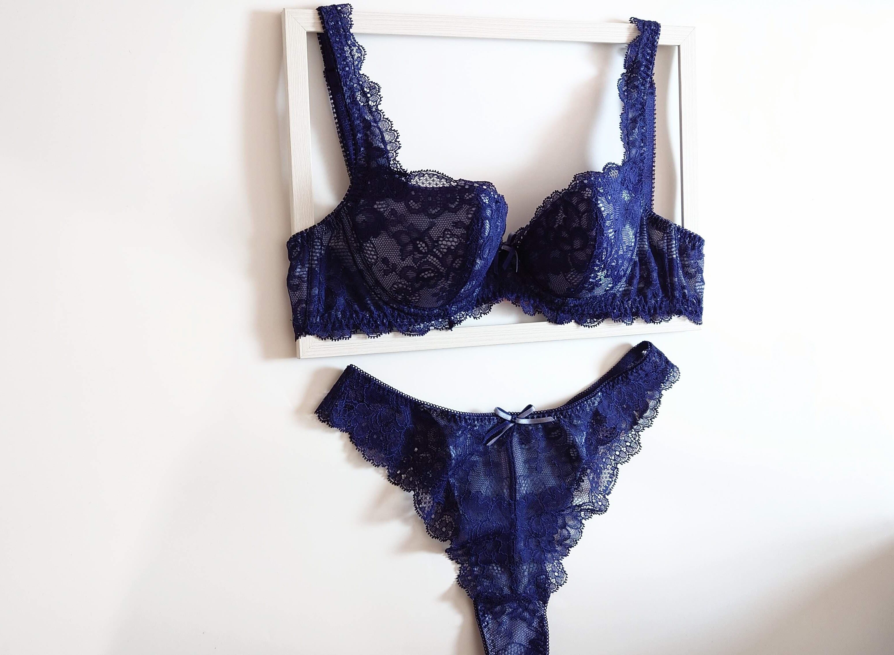 ネイビーは光沢のあるグレーがかったうすいブルーの生地にネイビーのレースを重ねた、爽やかで上品な配色です。