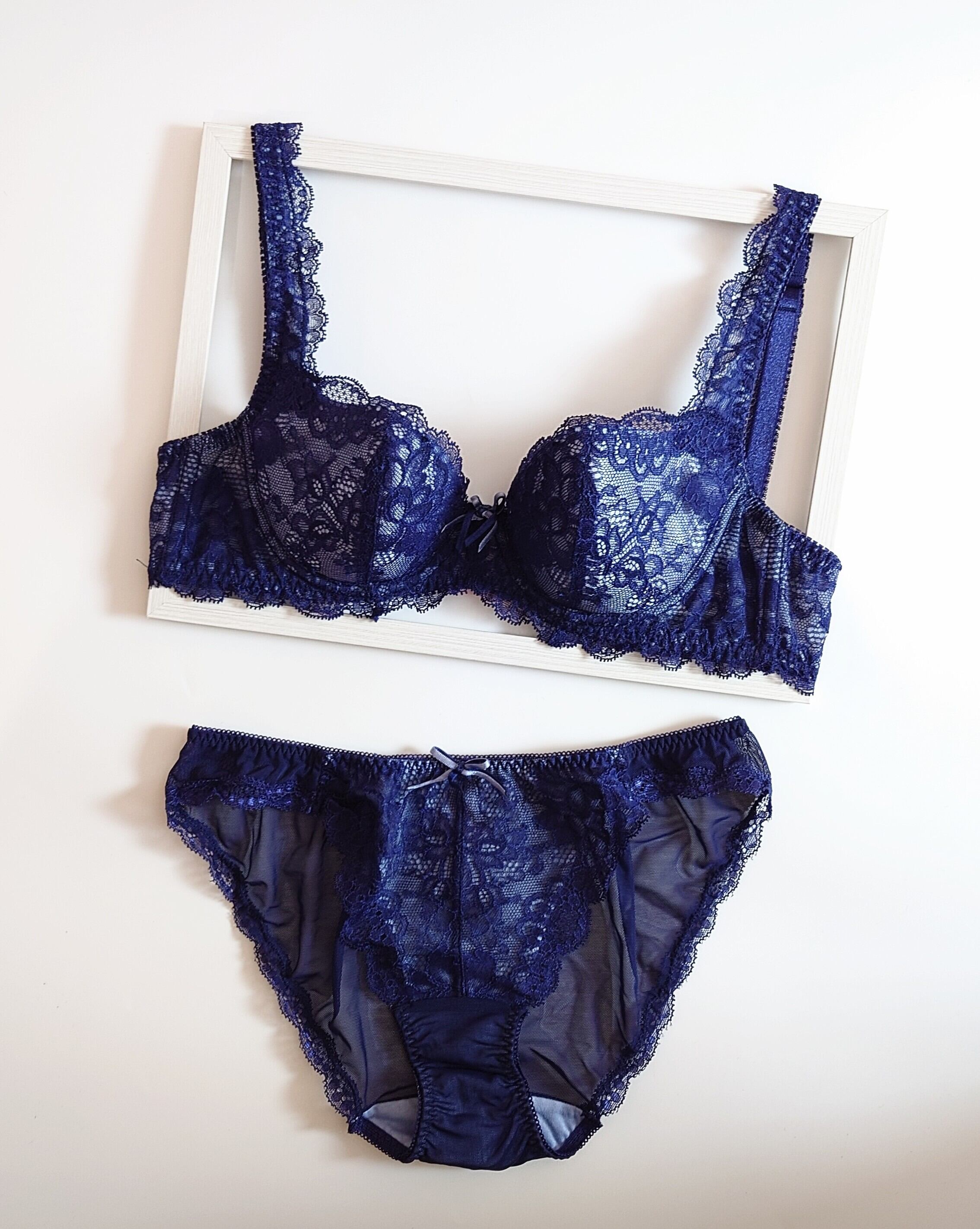 ネイビーはグレーがかったうすいブルーのフロント生地に濃紺のレースが映えるさわやかで上品な仕上がり。