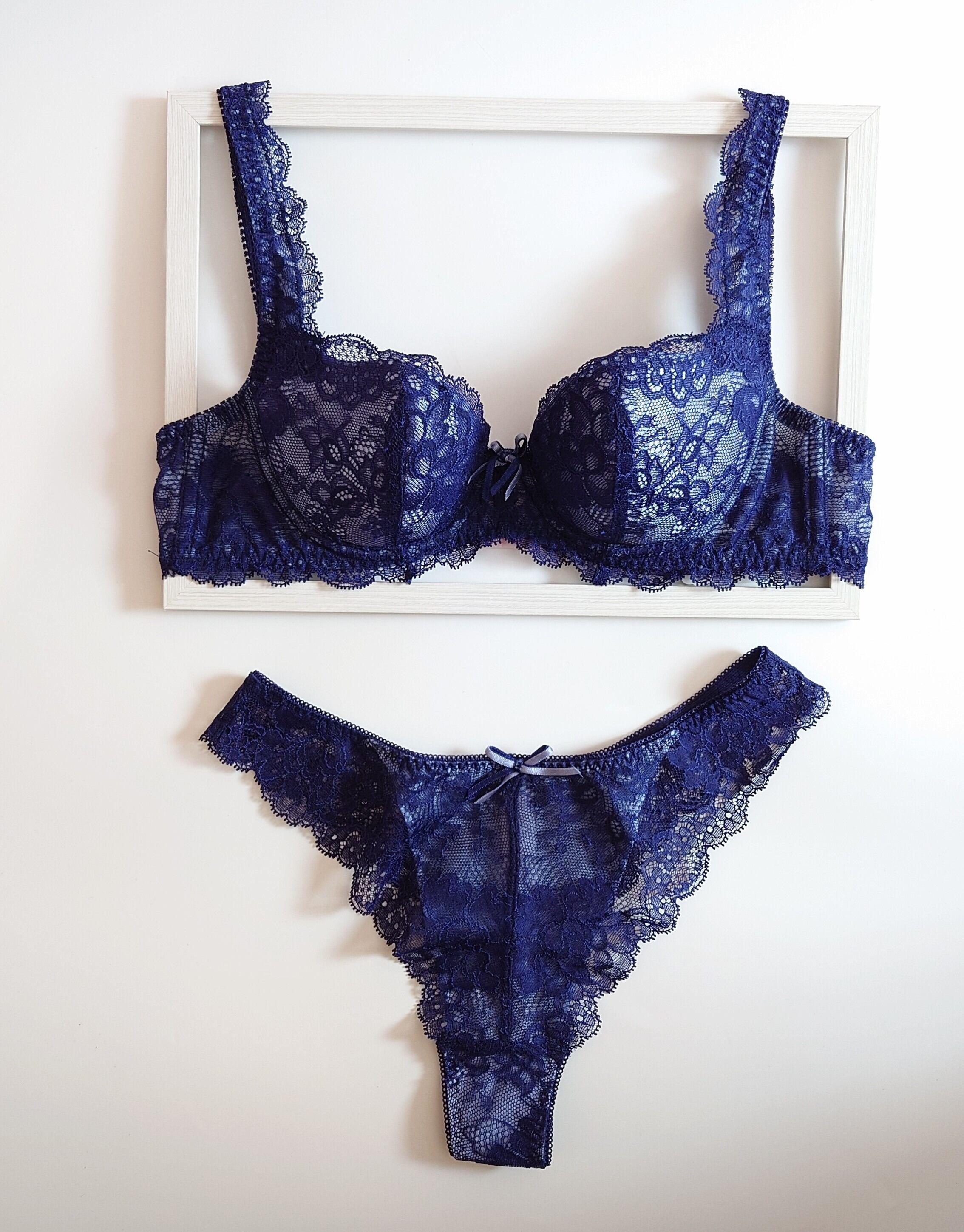ネイビーはグレーがかったうすいブルーのフロント生地に濃紺のレースが映えるさわやかで上品な仕上がり。