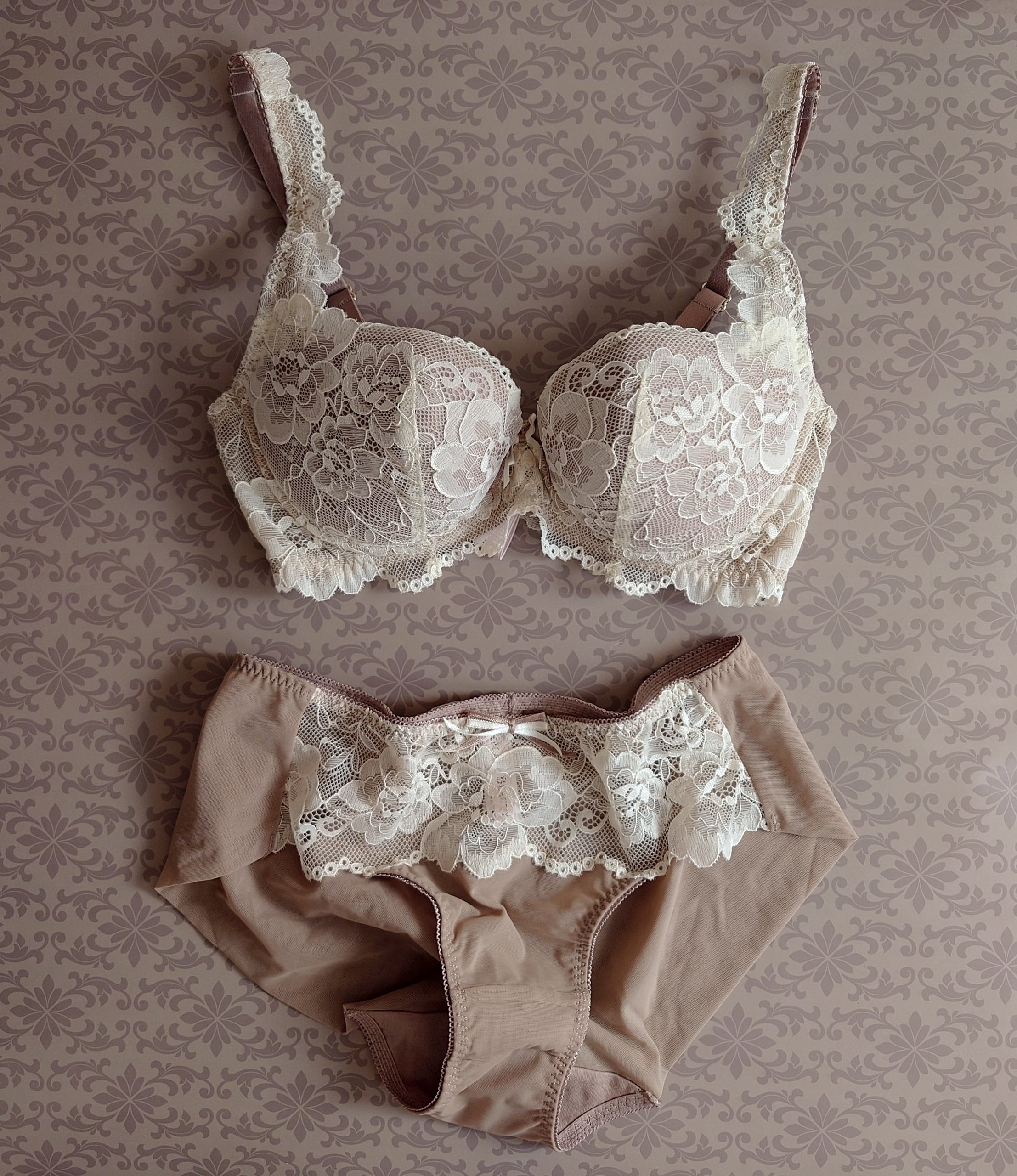 Cafe Cremeのお色はたっぷりミルクをとかしこんだコーヒーのようなまろやかなヌードベージュのベース生地にバニラ色のレースを重ねたノスタルジックなデザインです。