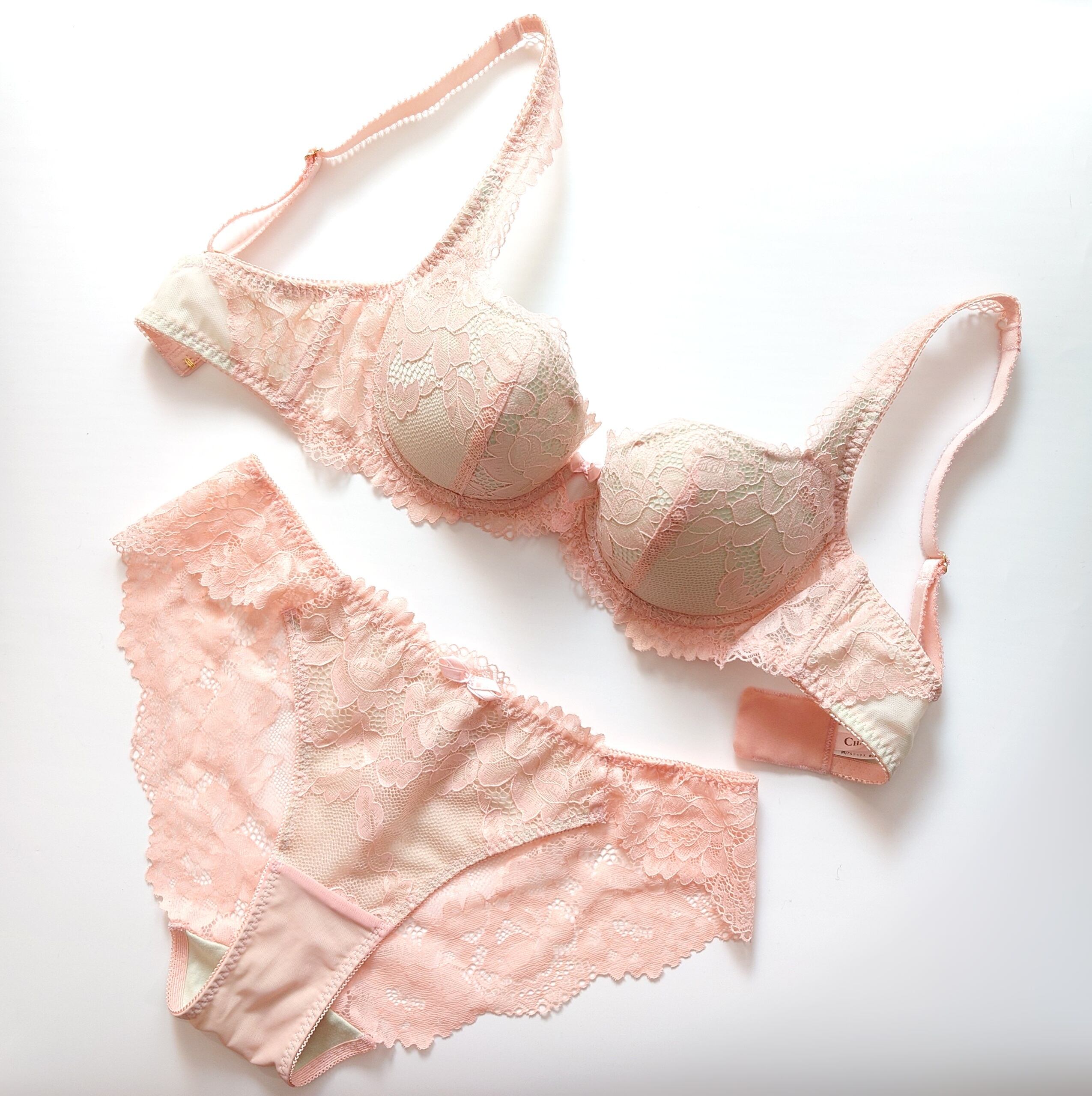 肌なじみの良いコーラル系ピンク#F8C6BDにグリーン#CFE1B9が引き立つマカロンカラーが目にも楽しいエミリーは、丸みを抑えたカップですっきりシルエットに仕上がります。