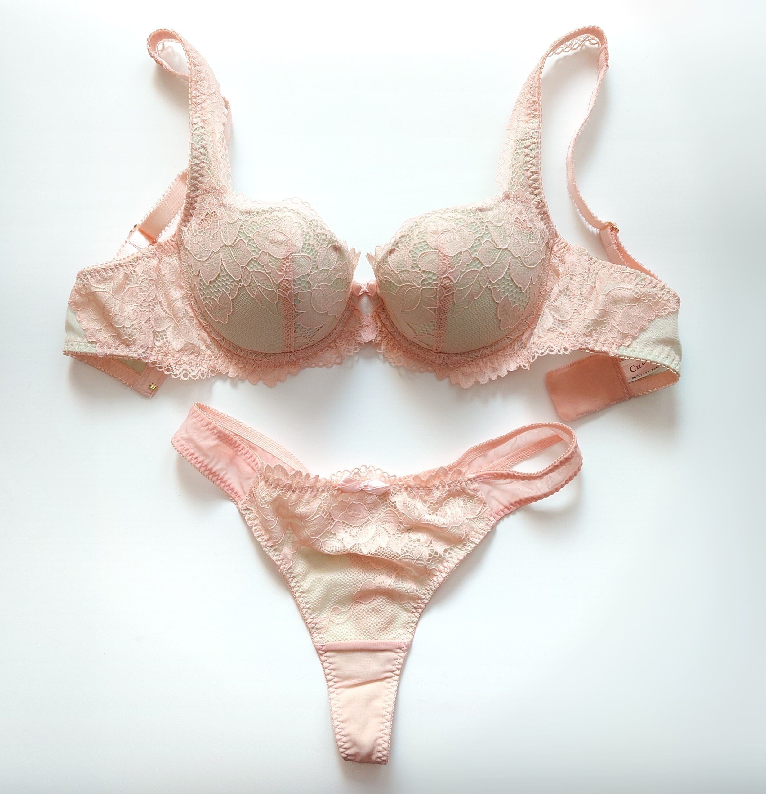 お揃いのボトムは総レースショーツとソング(Tバック型)の2種類ございます。