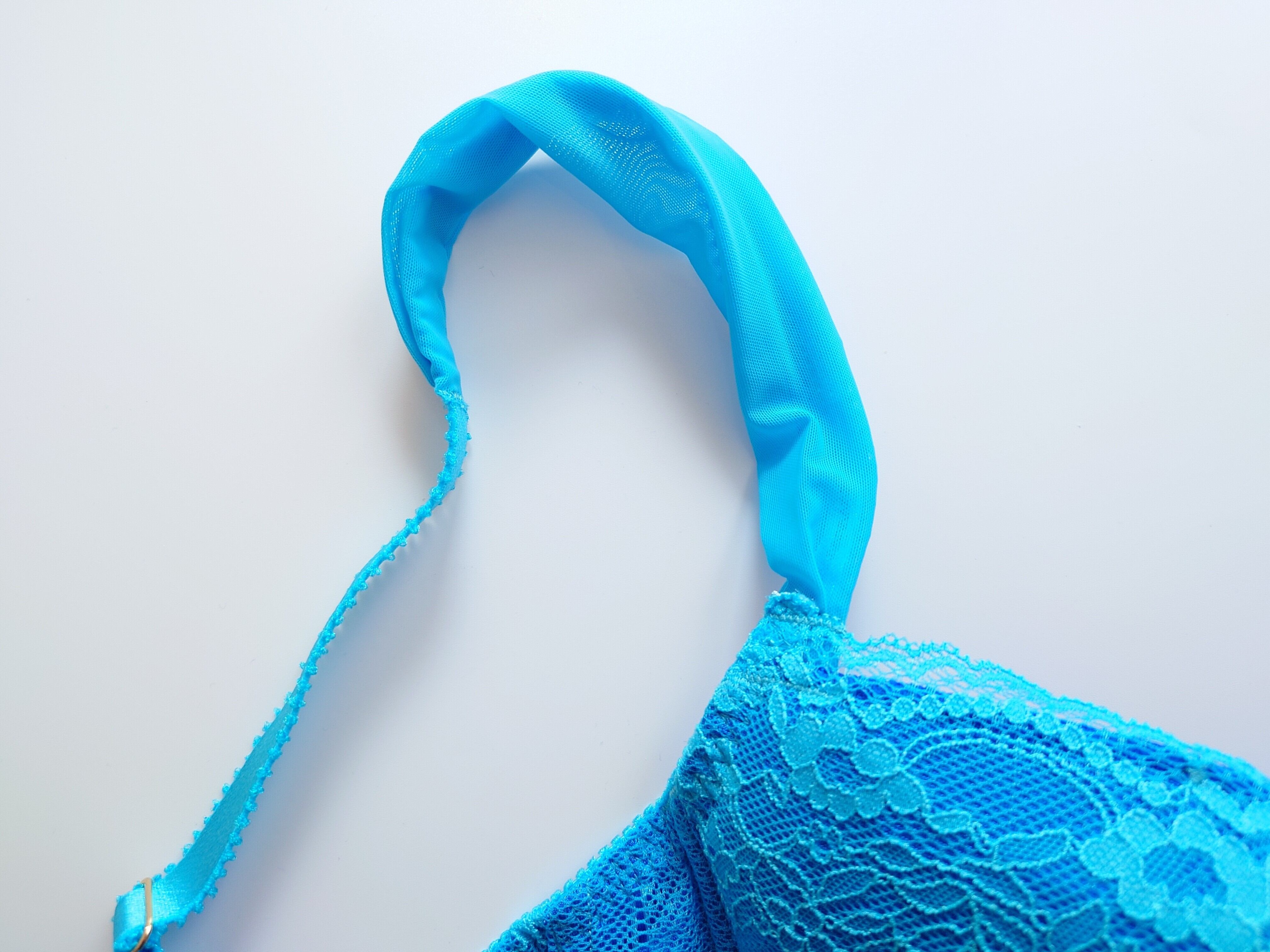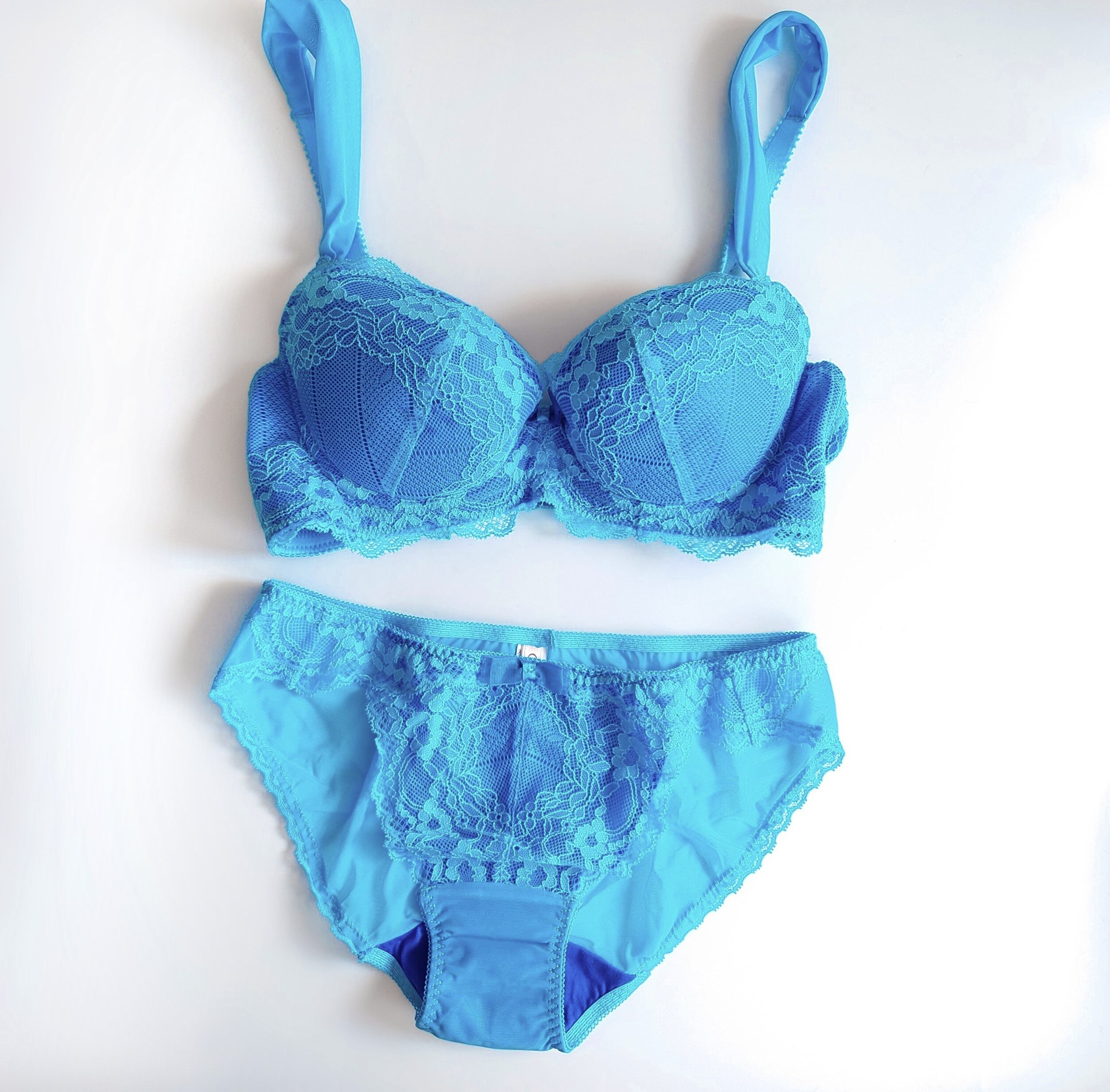 ロイヤルブルーのベース生地にアクアブルーのレースが爽やかです。