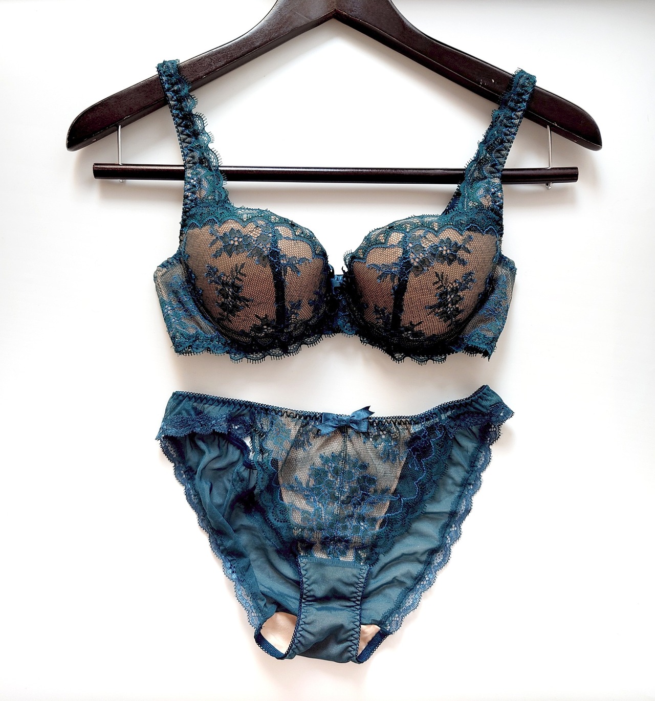 Teal Greenはシャンパンカラーの裏地とダークグリーンのレースのコントラストが大変美しく、全体的にダークトーンでシックなまとまり。