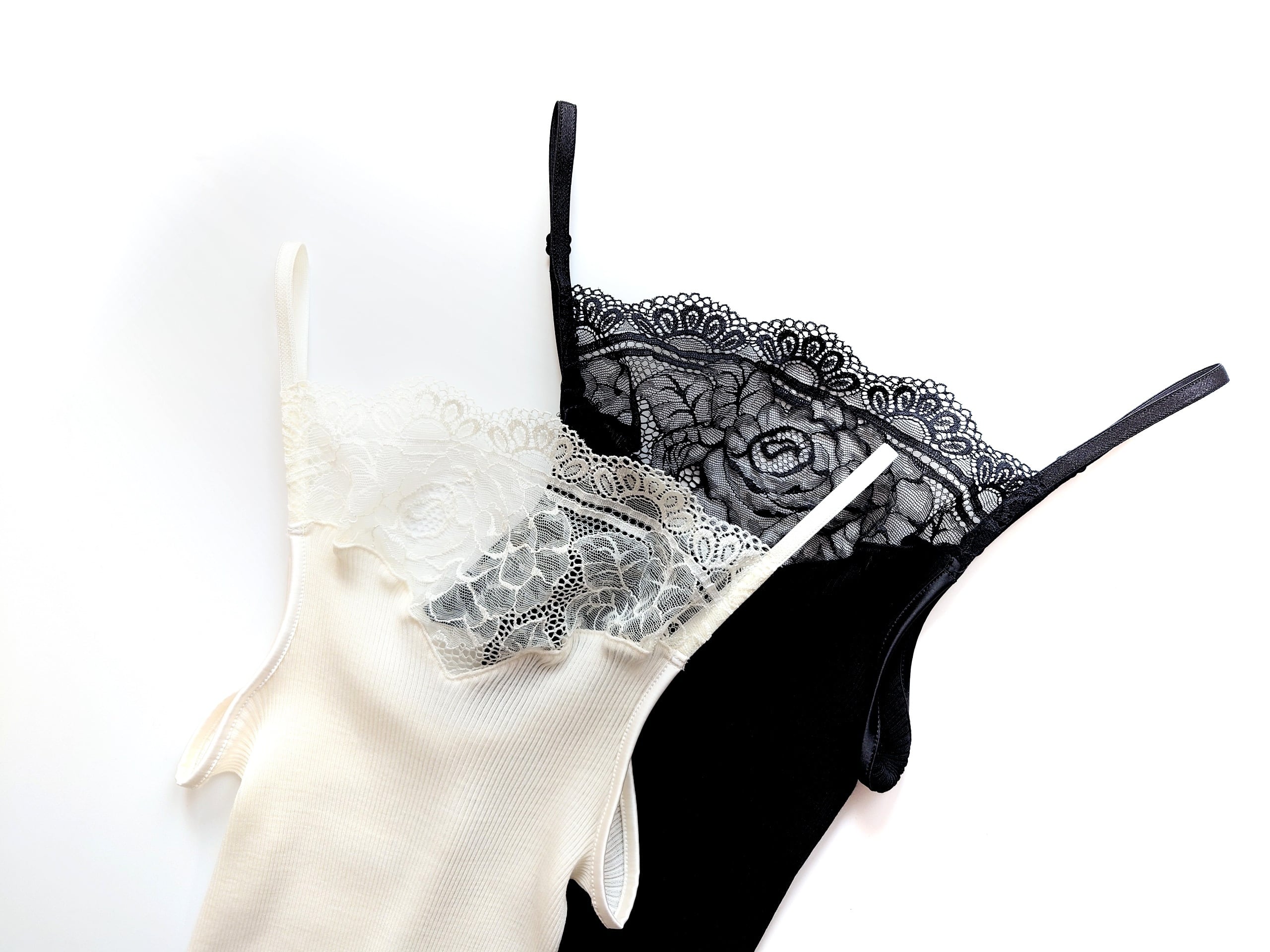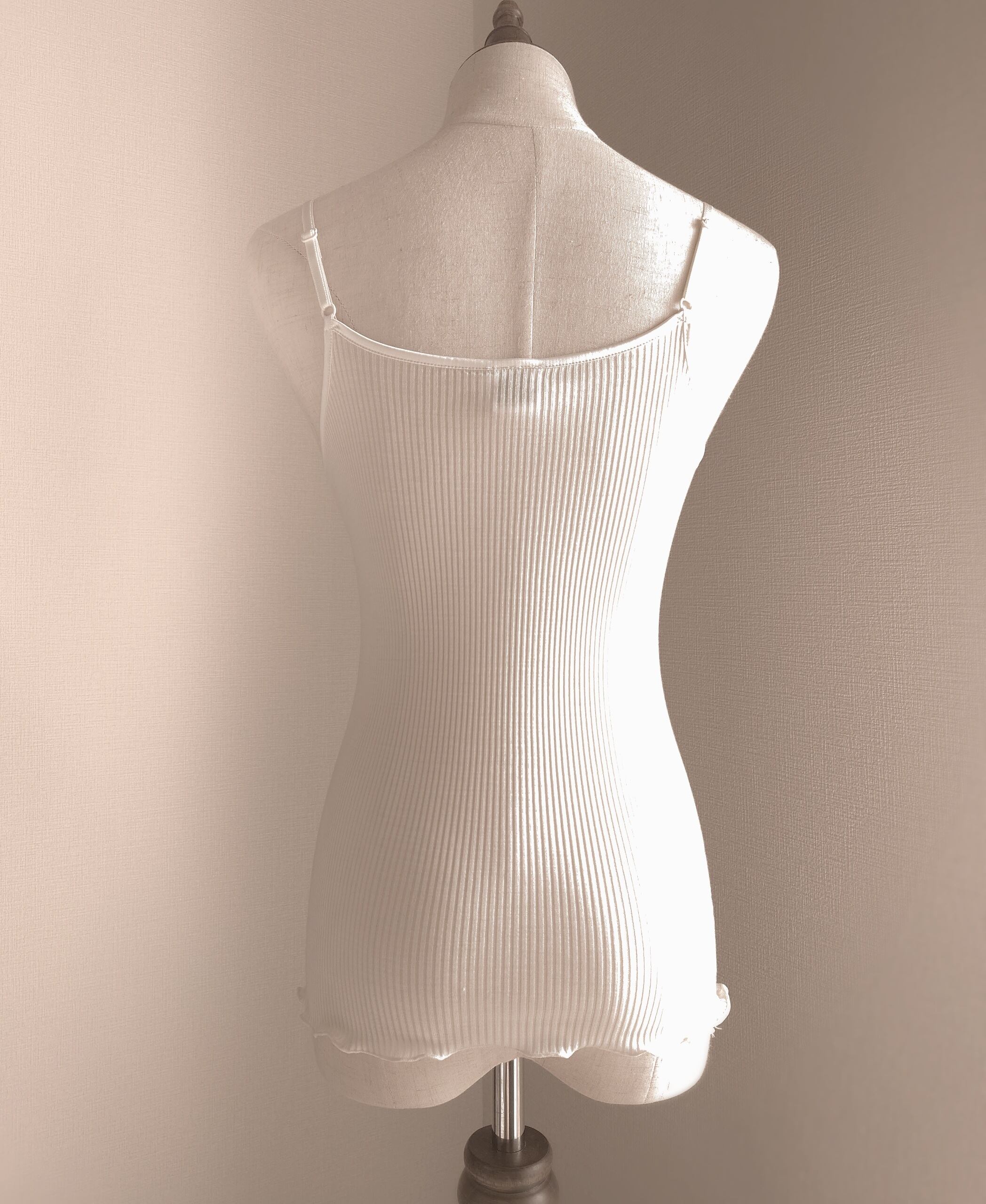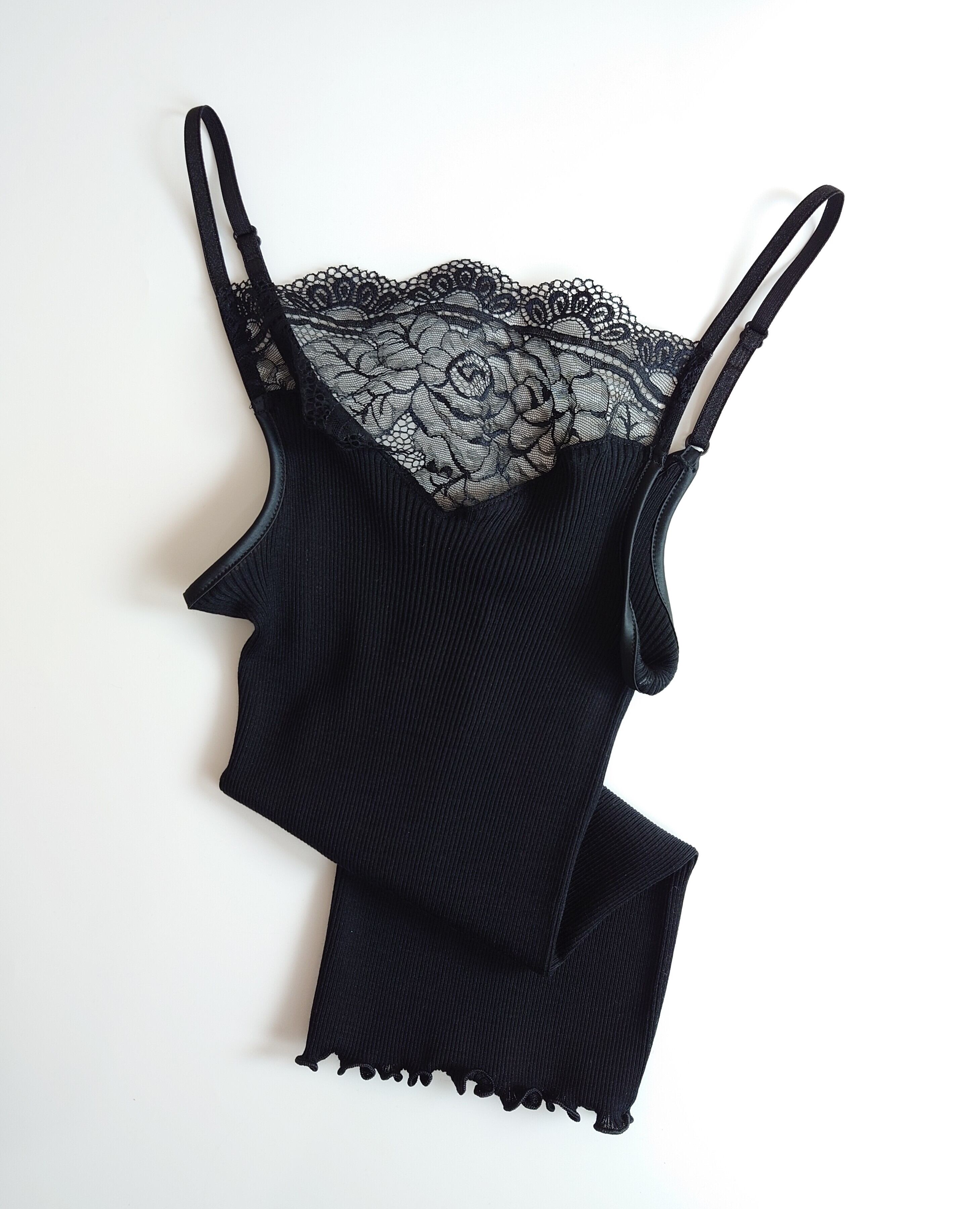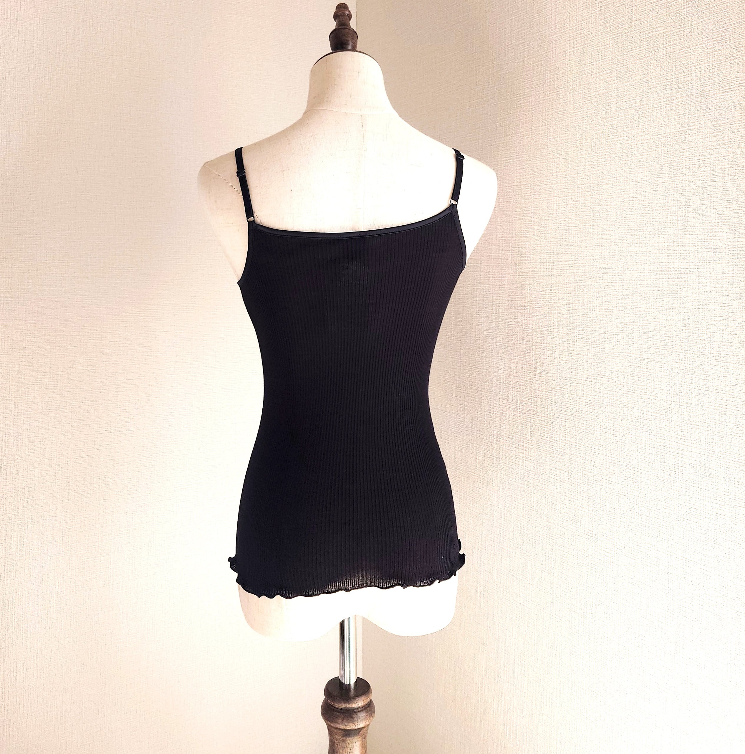 【Oscalito】オスカリートの2024FW限定デザインのリバーレースリブキャミソールです。こちらはウール70%/シルク30%の丸編み細リブ仕立て。