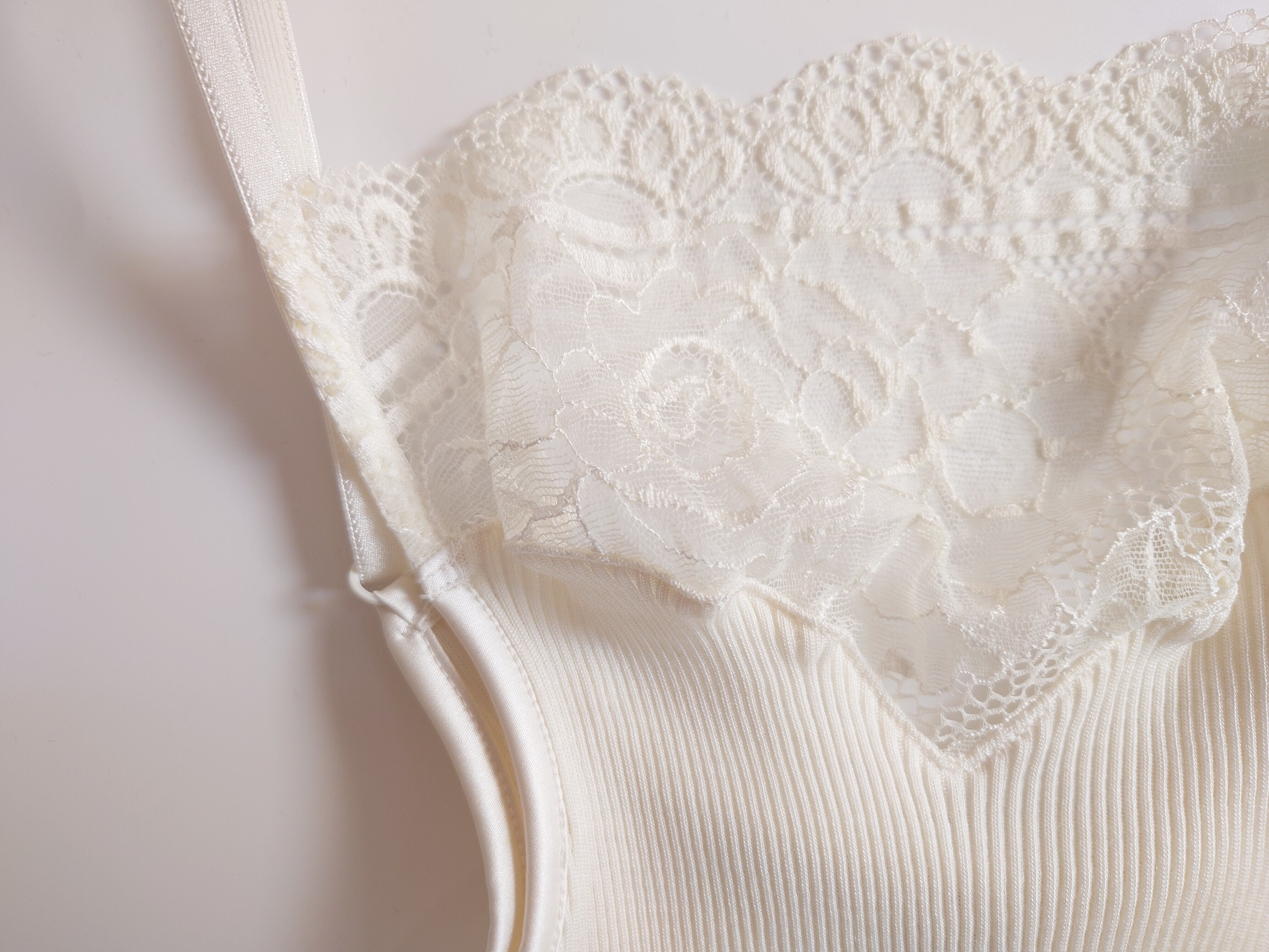 身頃のニット部分の胸元はV字に切れ込んでいて、その上のレース部分はスクエアネックになっております。