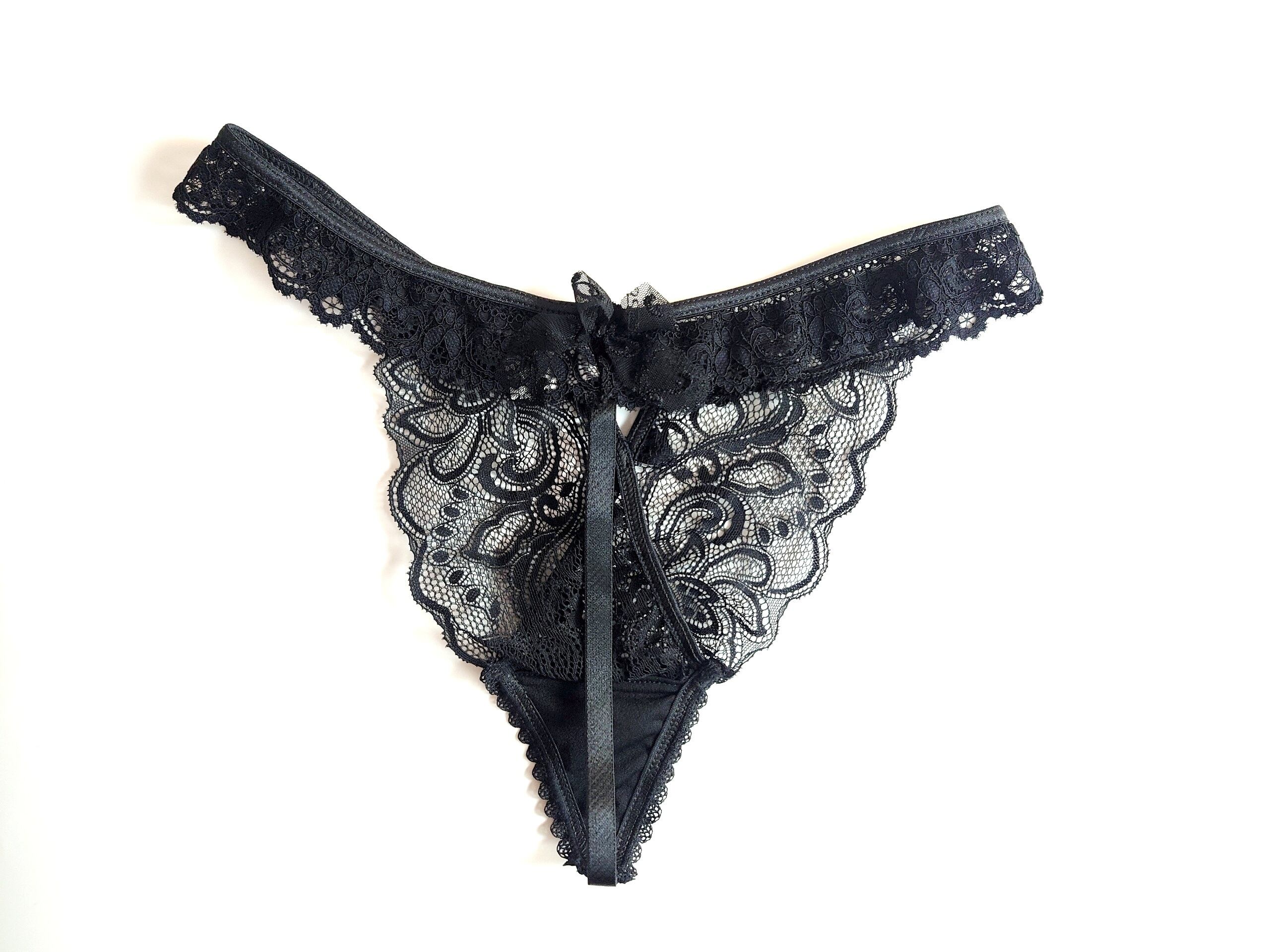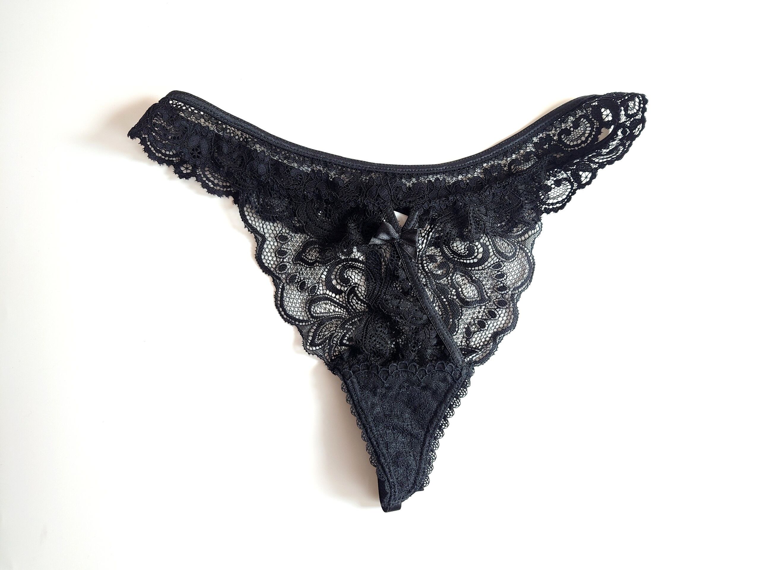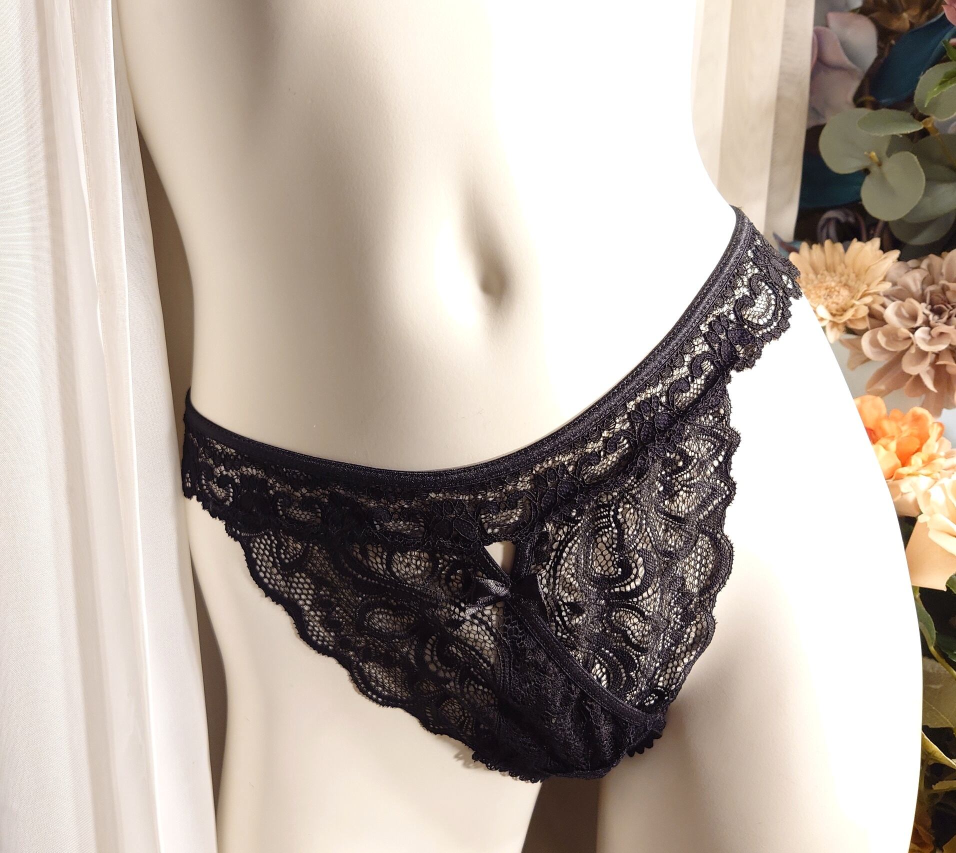 レースのトライアングルをストリングで囲む甘辛デザイン。