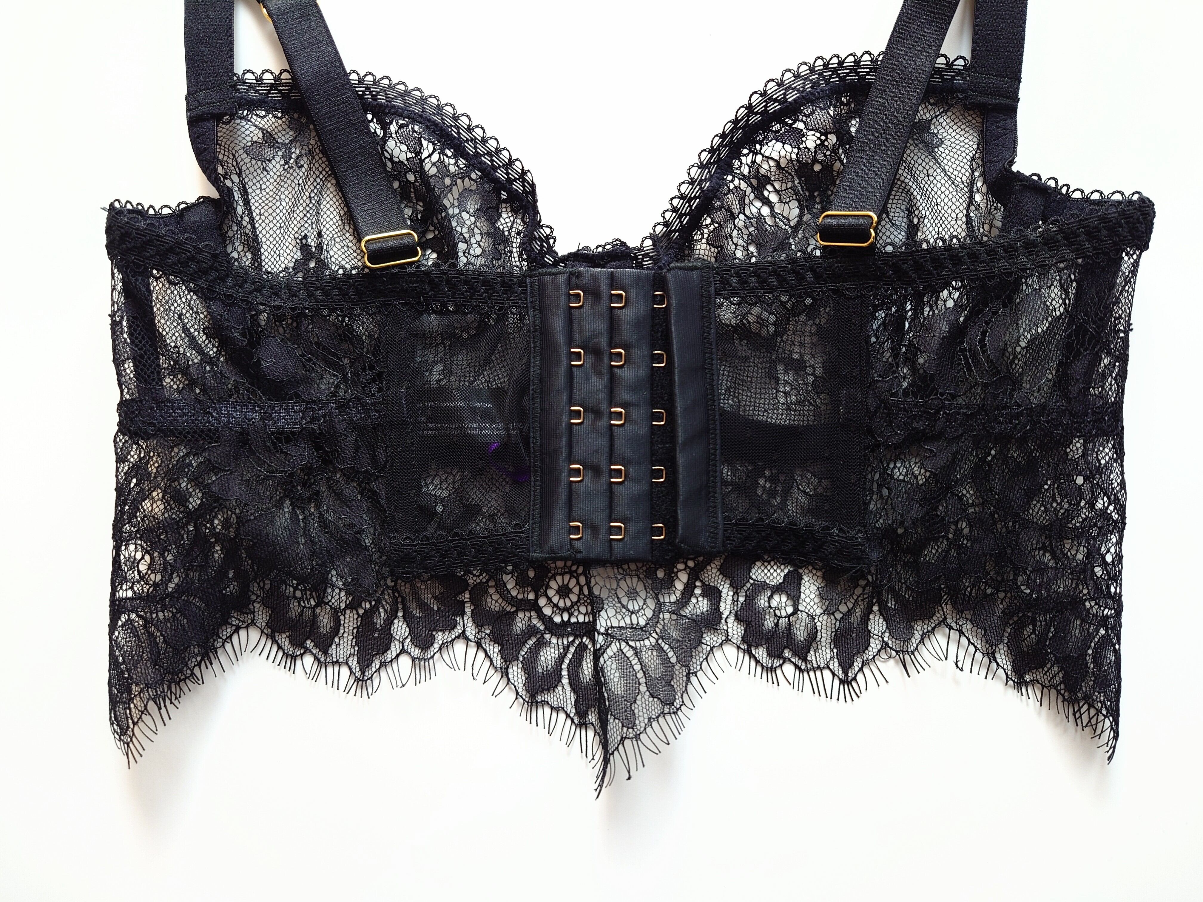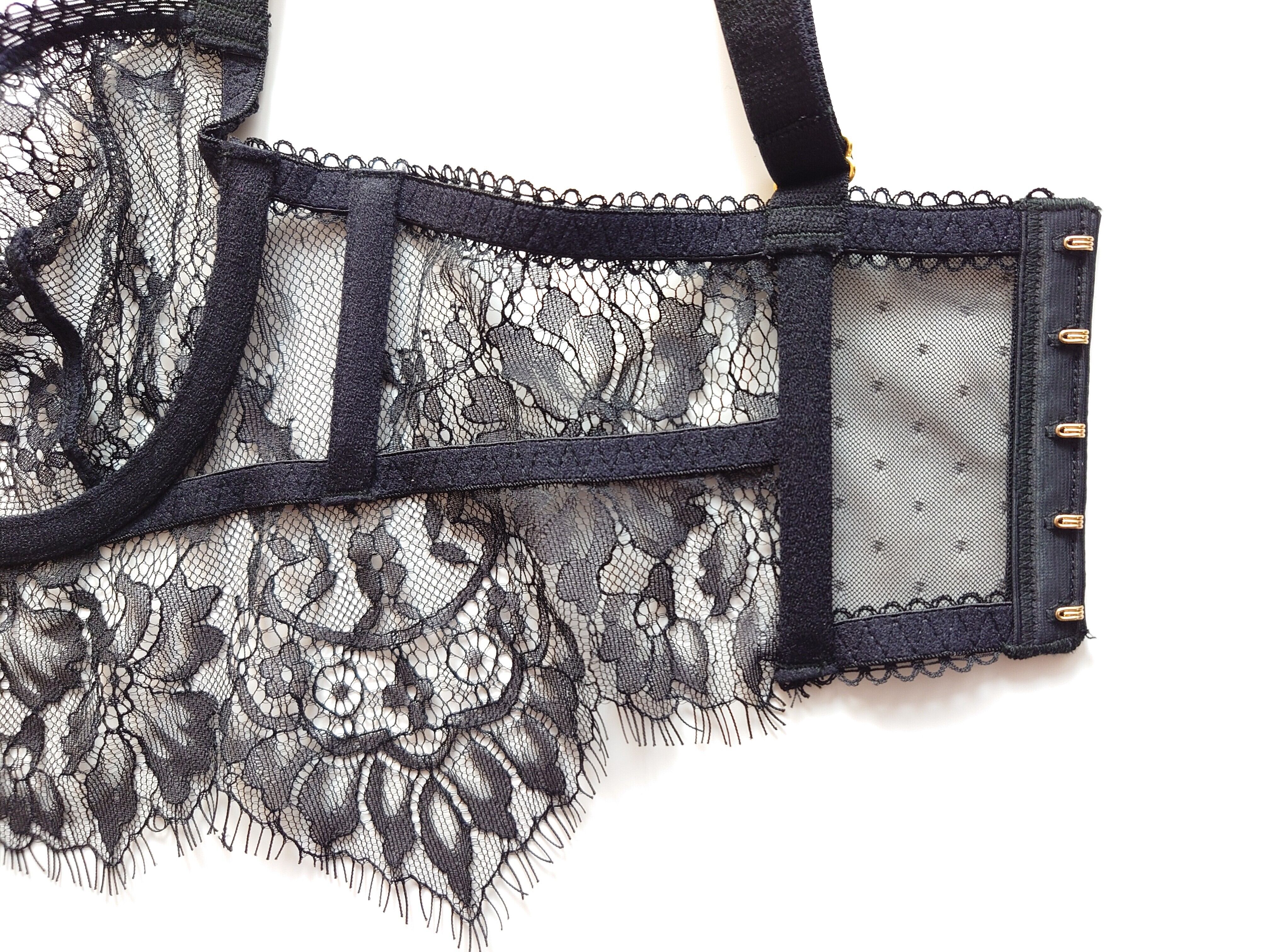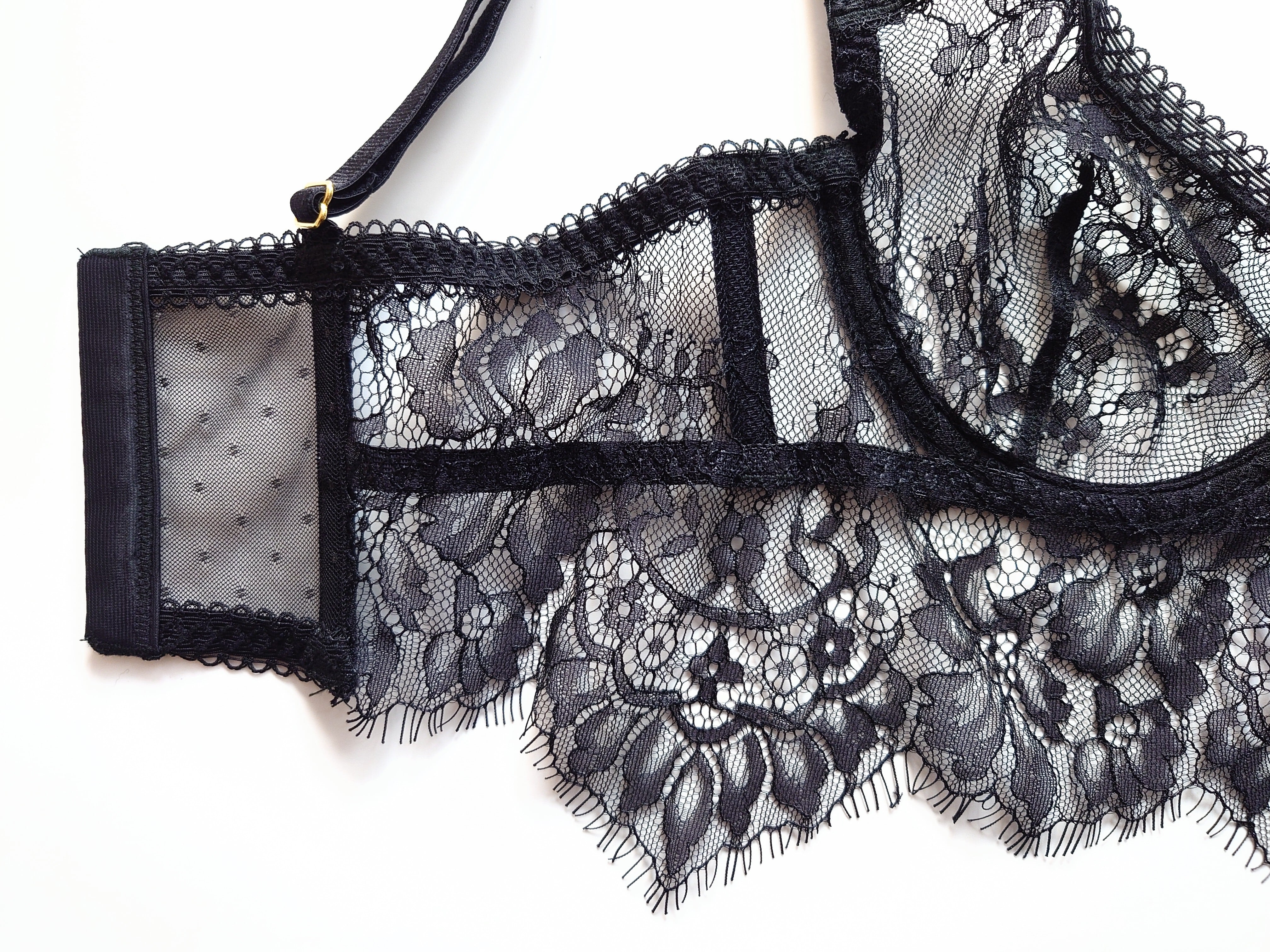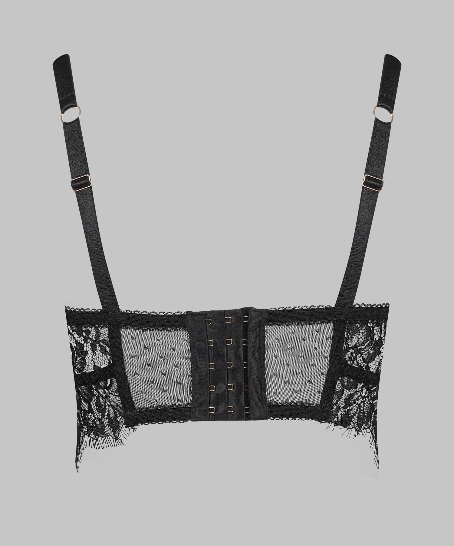 アイラッシュレースとドットチュールとゴールド金具を贅沢にあしらったゴージャスなワイヤー入りロングブラ。